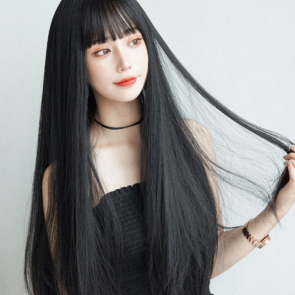 วิกผมยาวตรงสีดําสมจริงสไตล์เกาหลีสําหรับผู้หญิง 68 ซม วิกผมสีชมพู