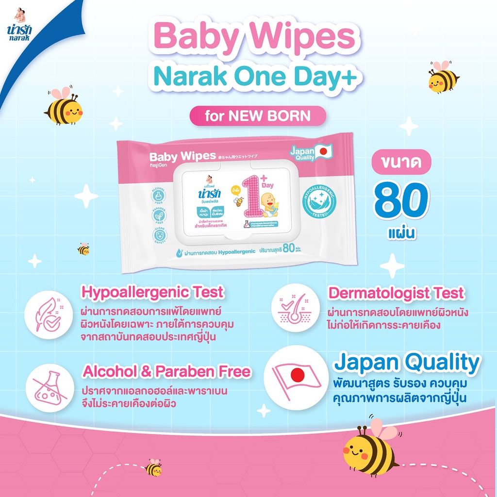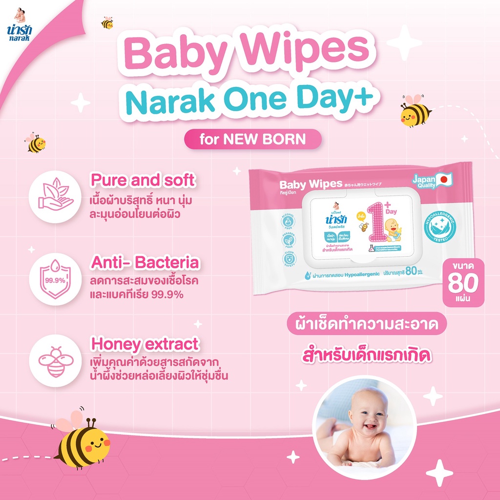 [1 แถม 1] Narak เบบี้ ไวพส์ น่ารักวั นเดย์พลัส ผ้าเช็ดทำความสะอาด ทิชชู่เปียก 80 แผ่น
