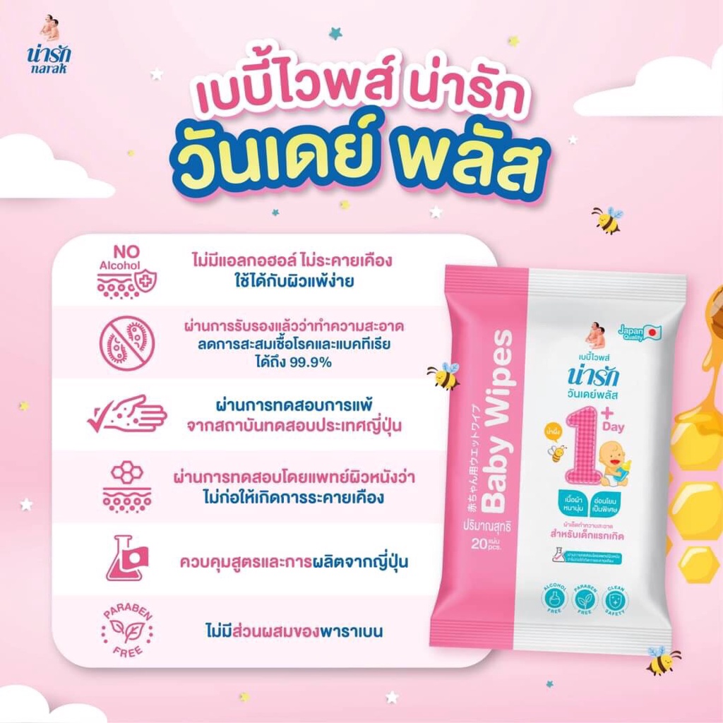 Narak Baby Wipes ผ้าเช็ดทำความสะอาด ทิชชู่เปียก น่ารักวันเดย์พลัส 20 แผ่น (บรรจุ 6 ซองต่อกล่อง)