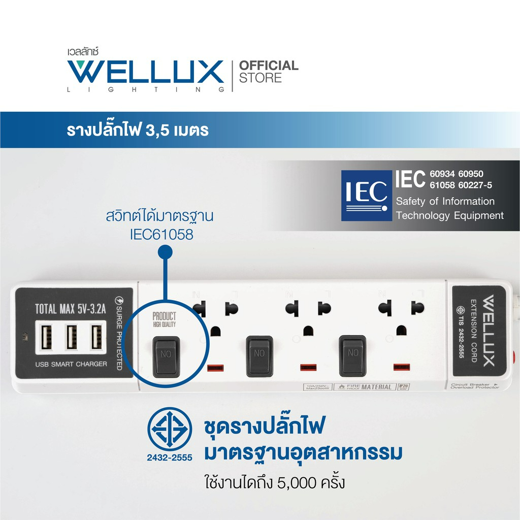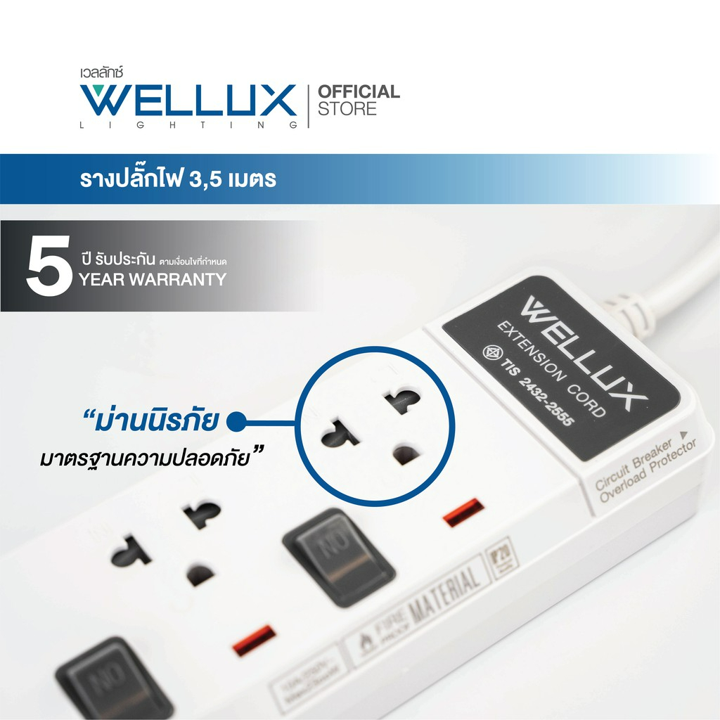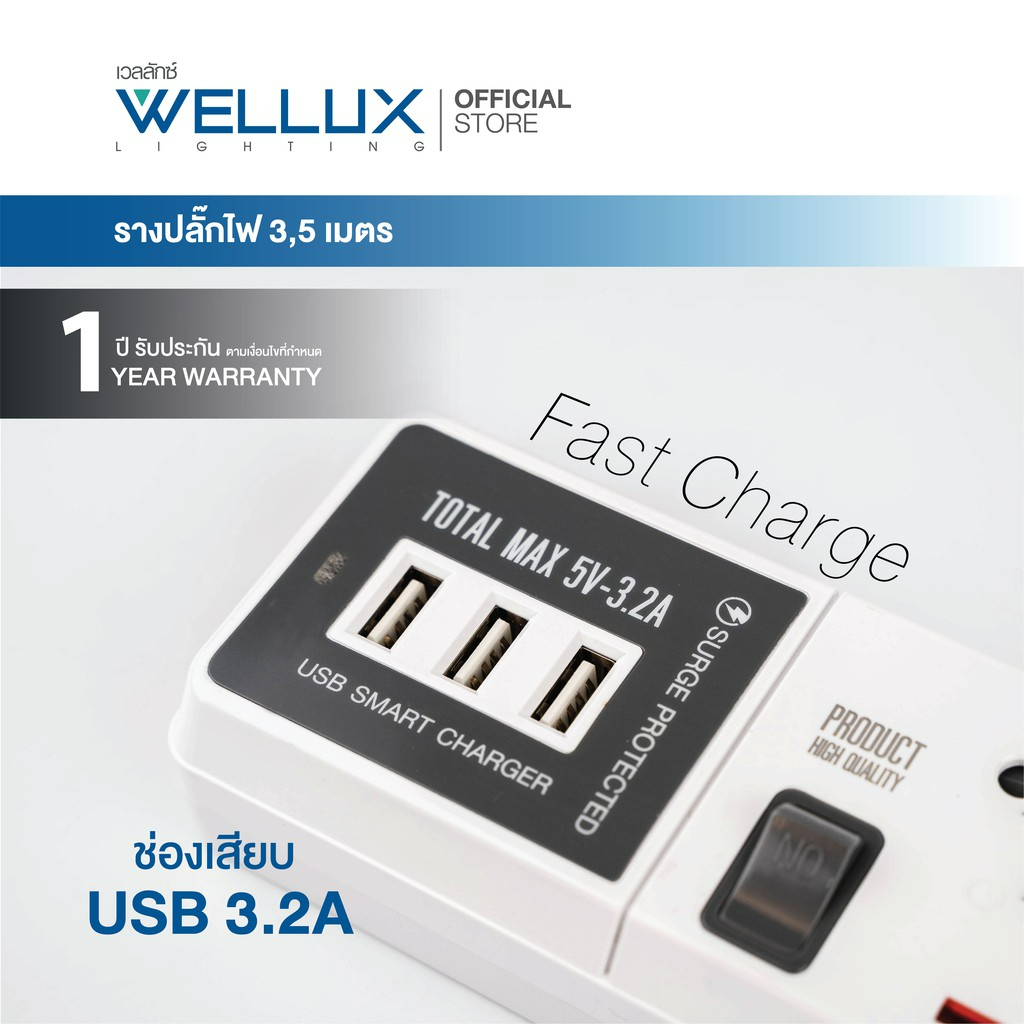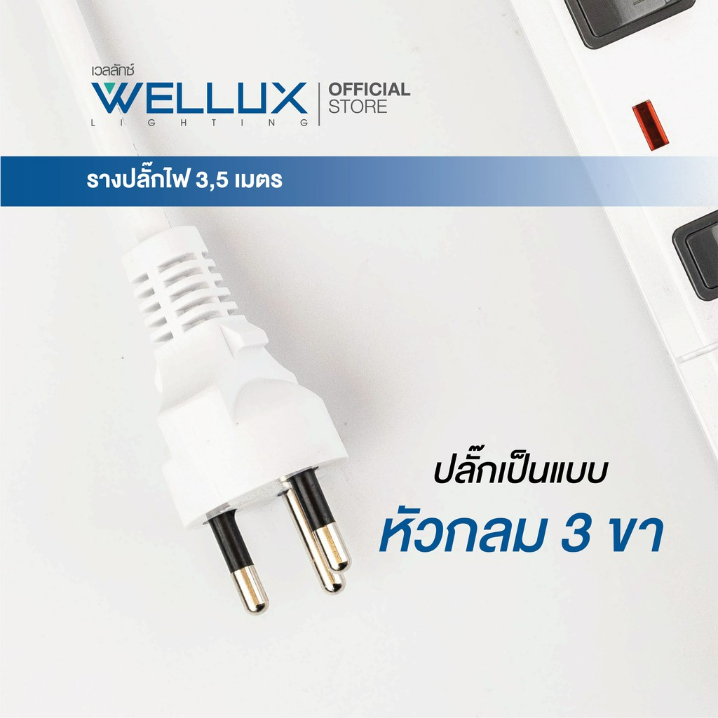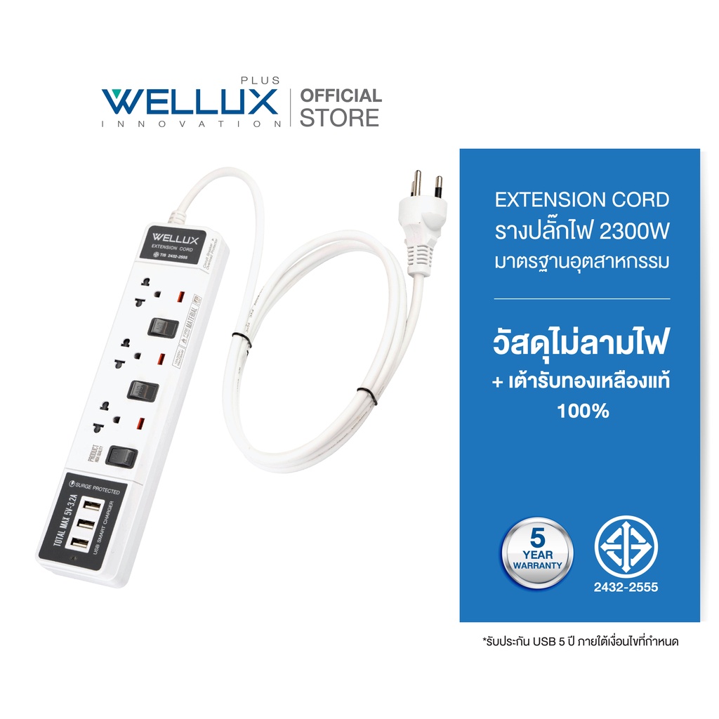 WELLUX ปลั๊กไฟมินิมอล 3-5 ช่อง มีพอร์ตชาร์จ USB รองรับกำลังไฟ 2300W มอก.2433-2555