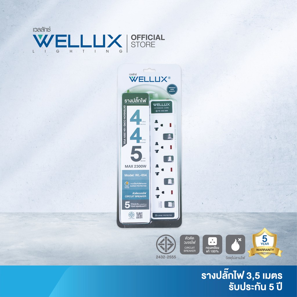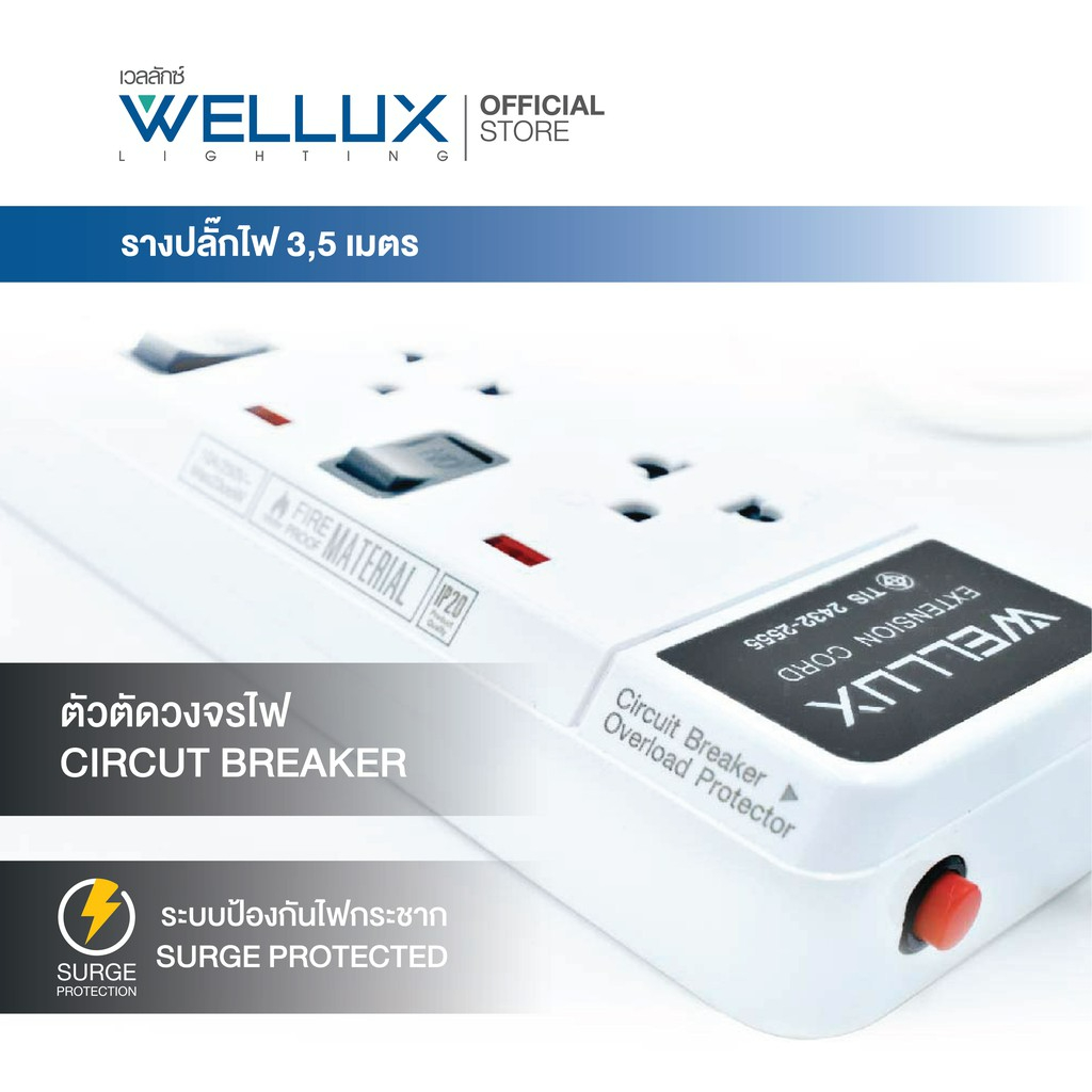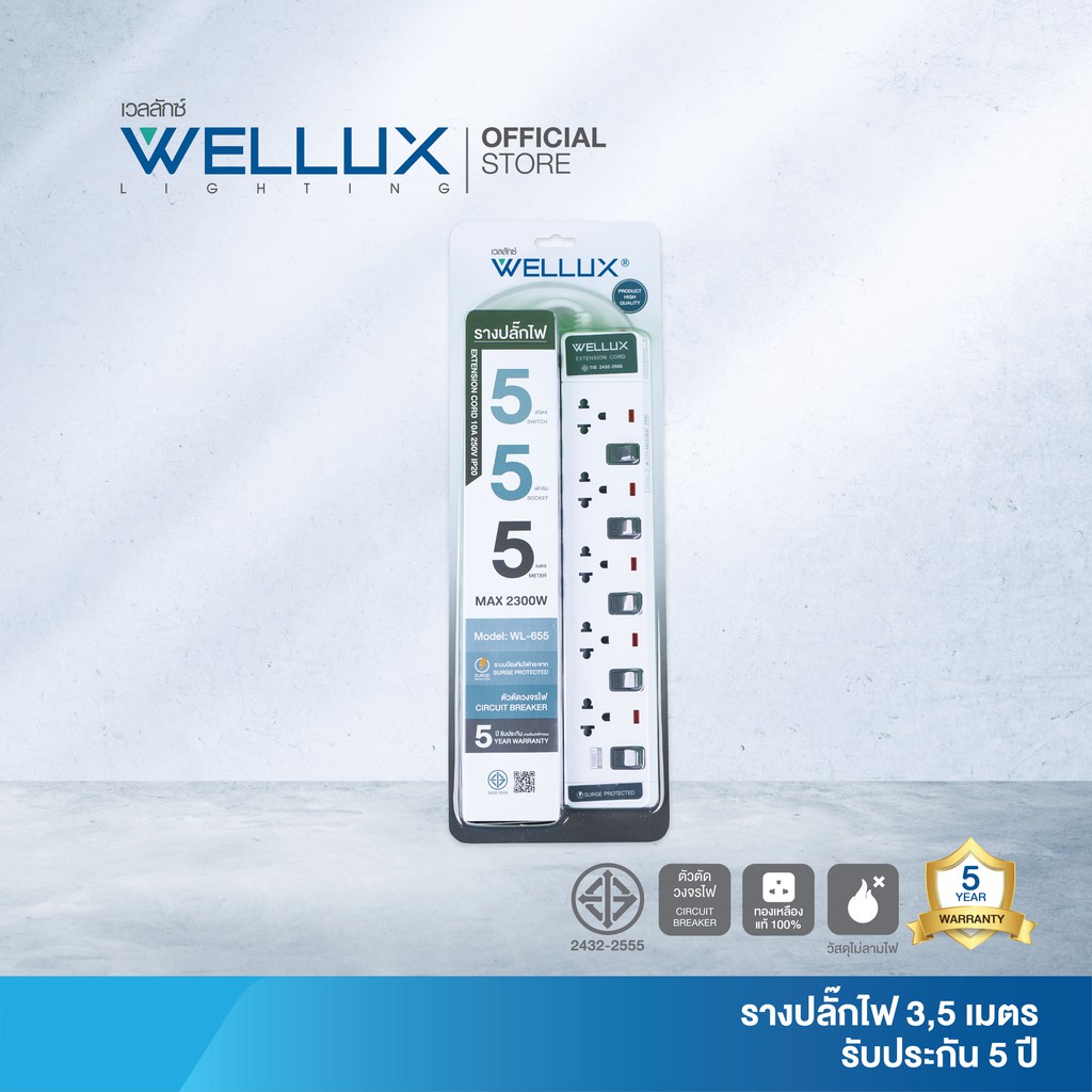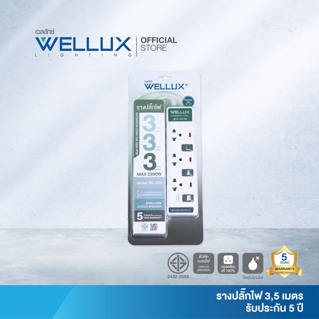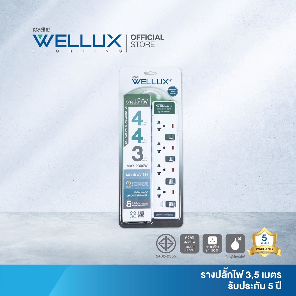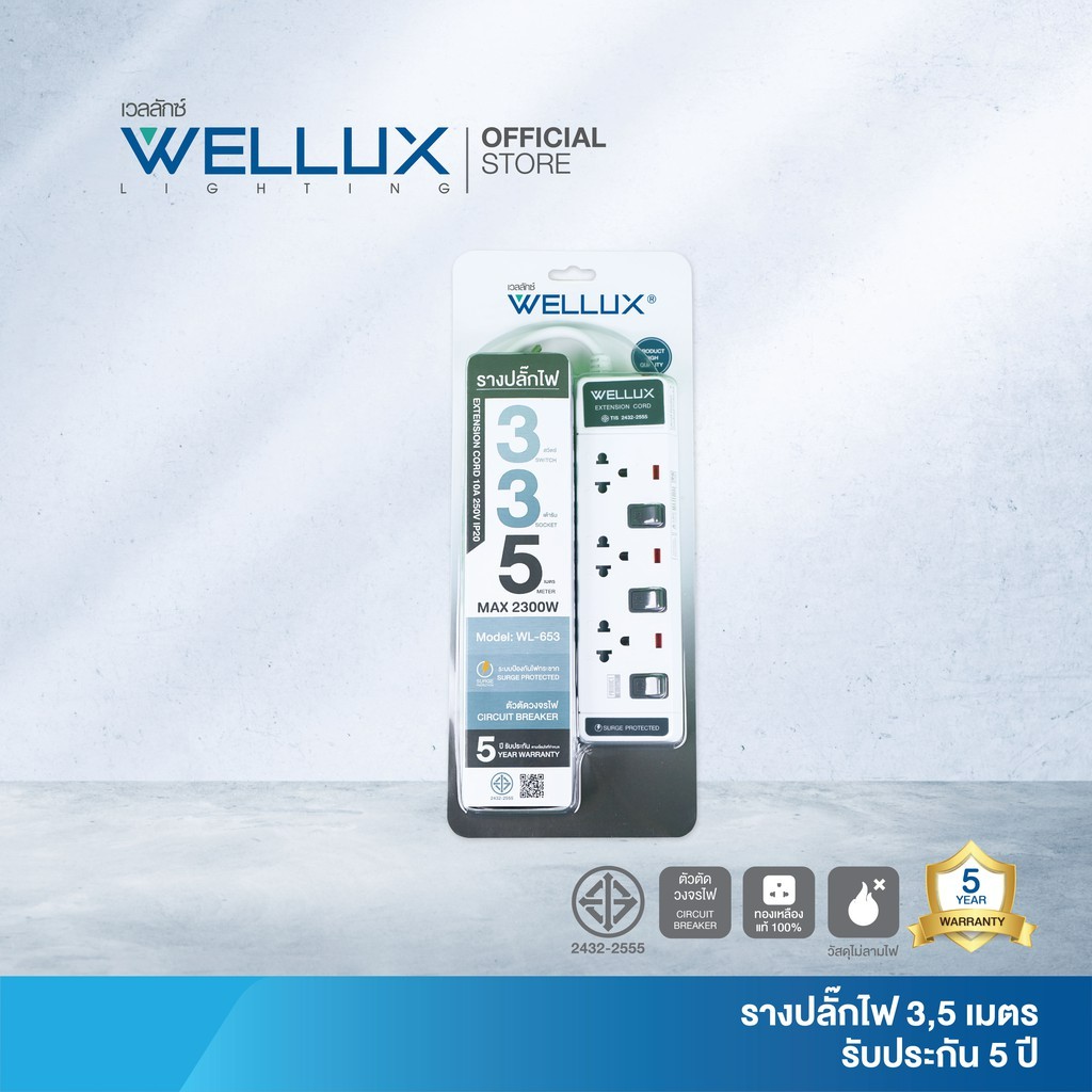 WELLUX ปลั๊กไฟมินิมอล 3-5 ช่อง มีพอร์ตชาร์จ USB รองรับกำลังไฟ 2300W มอก.2433-2555