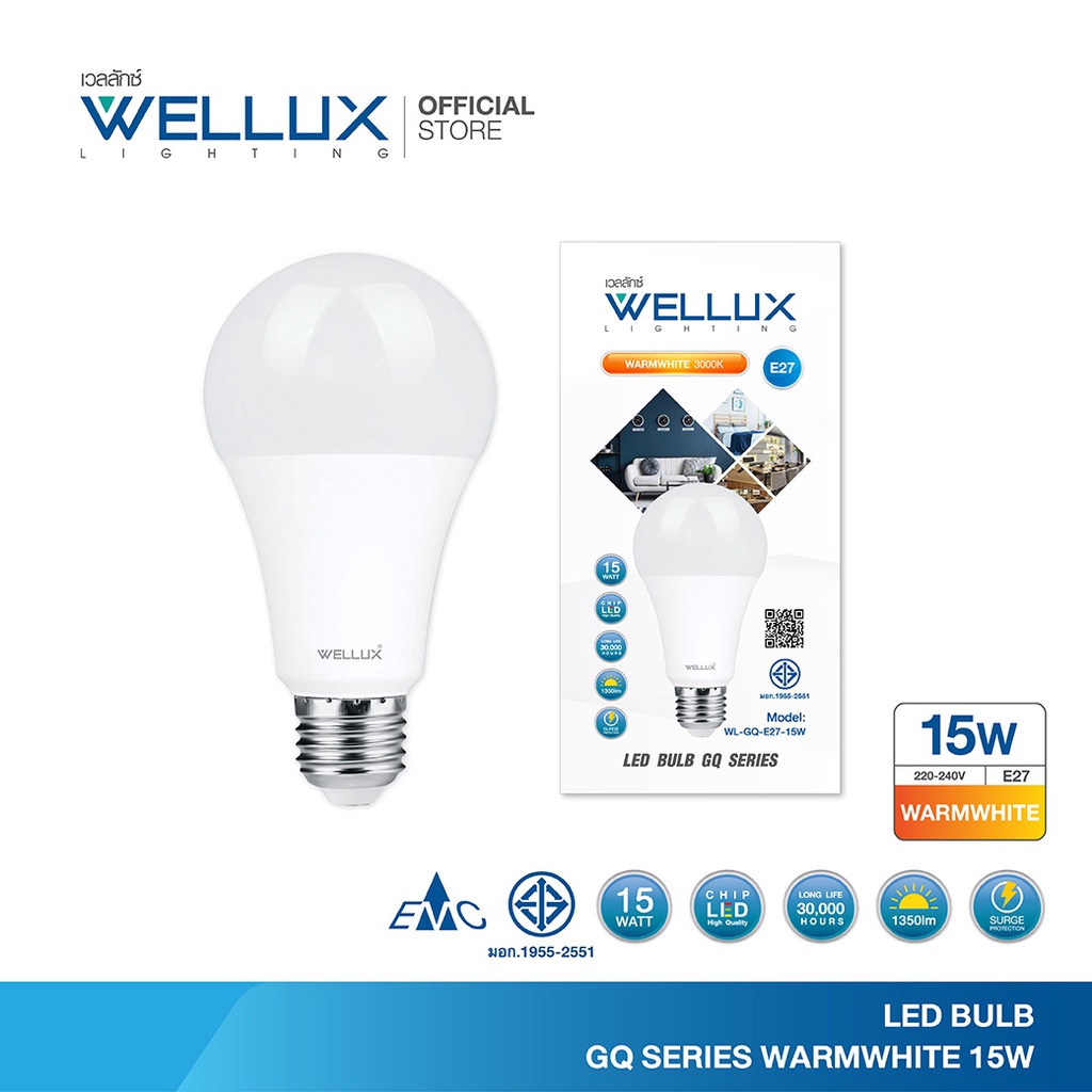 WELLUX หลอดไฟคุณภาพสูง 15W 1350ลูเมน แสงขาว แสงวอร์ม LED BULB GQ SERIES ขั้วE27