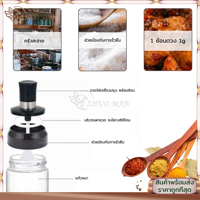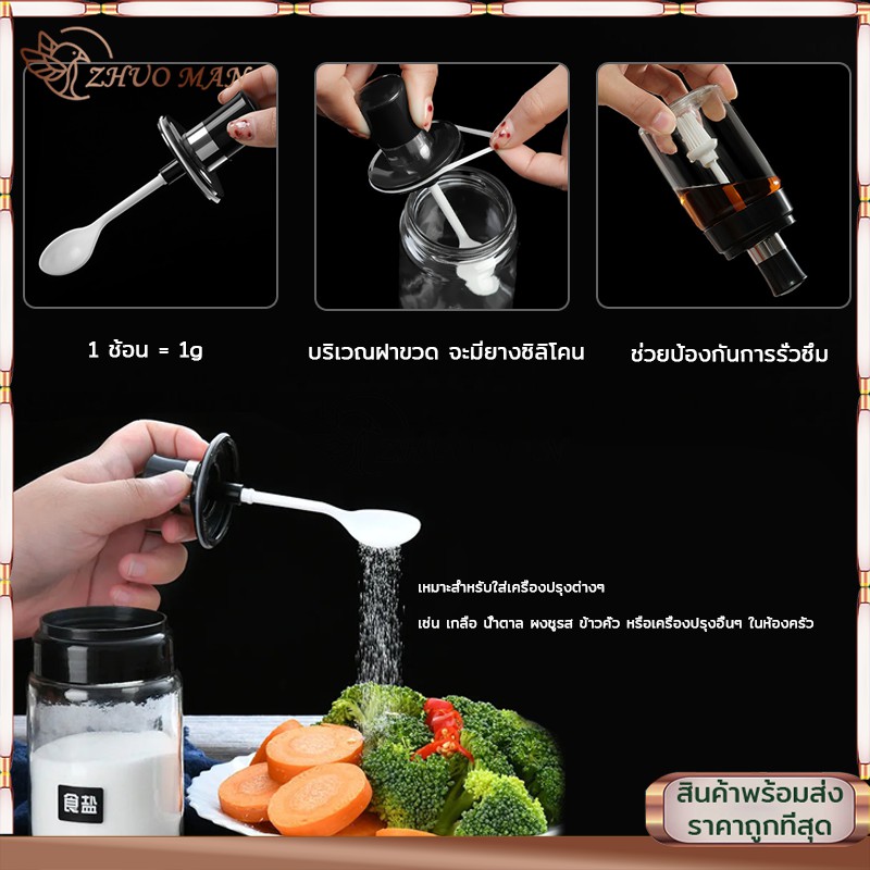 ขวดแก้วใส่เครื่องปรุง ขวดใส่เครื่องปรุง 300ML กระปุกใส่เครื่องปรุง เครื่องครัว พร้อมช้อนตักซิลิโคนซีลป้องกันการรั่วซึม