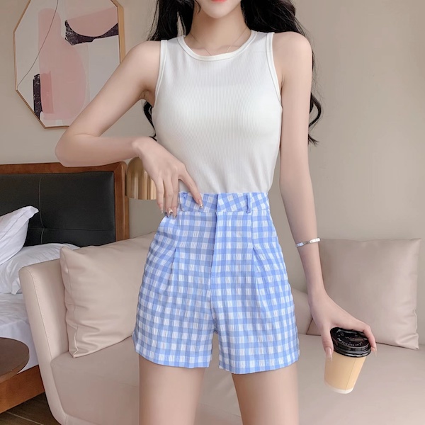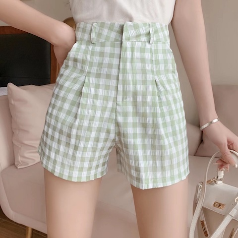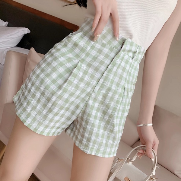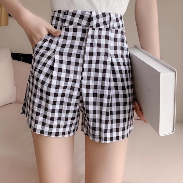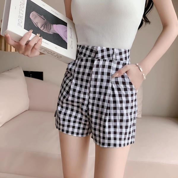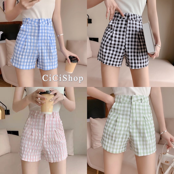Cicishop(255)กางเกงขาสั้นเอวสูงลายสก๊อตน่ารัก Scotty cute ตะขอหน้า มีกระเป๋า เนื้อผ้าคอตตอน