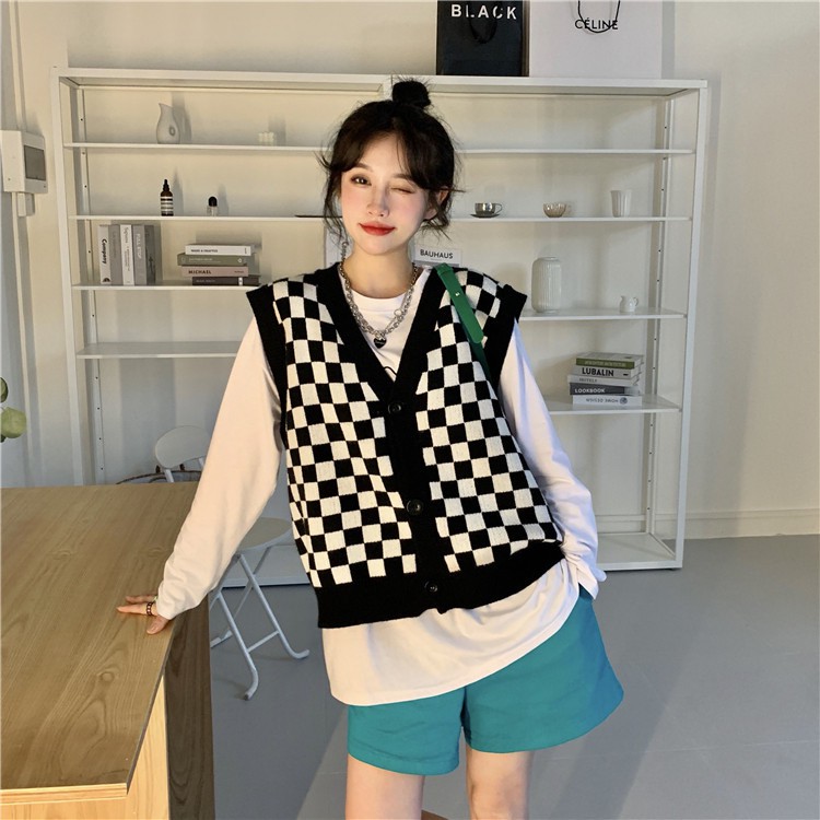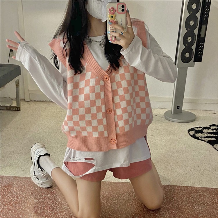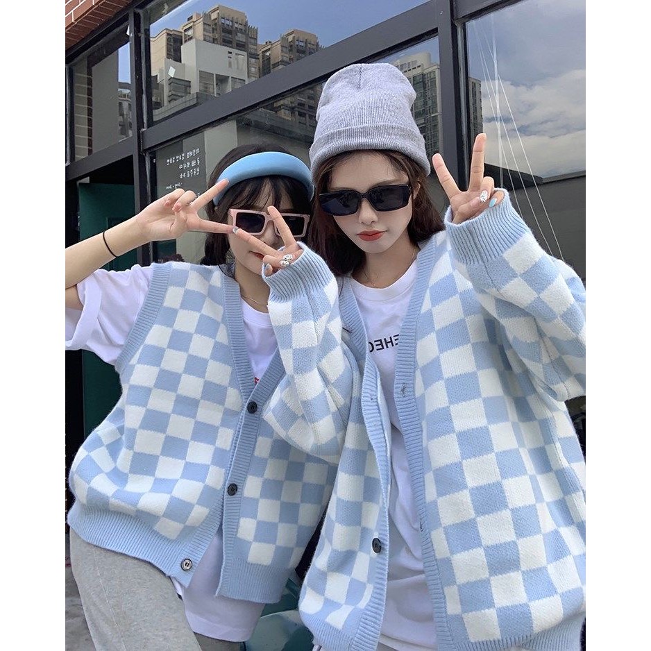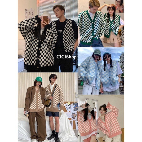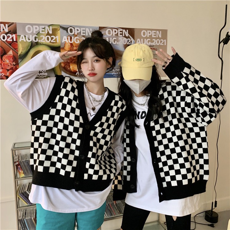Cicishop(SALE/สุ่ม Z1073/Z1074)เสื้อไหมพรมทอสลับสีลายตาราง 2แบบ2ลุค เสื้อกั๊ก-เสื้อคลุม