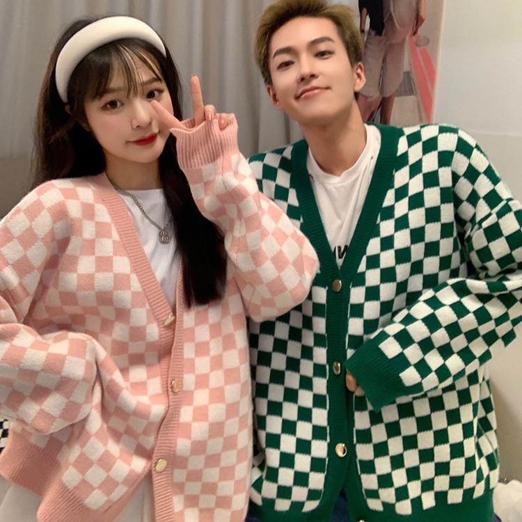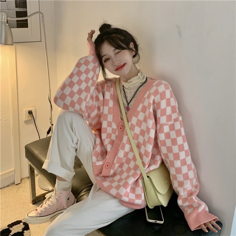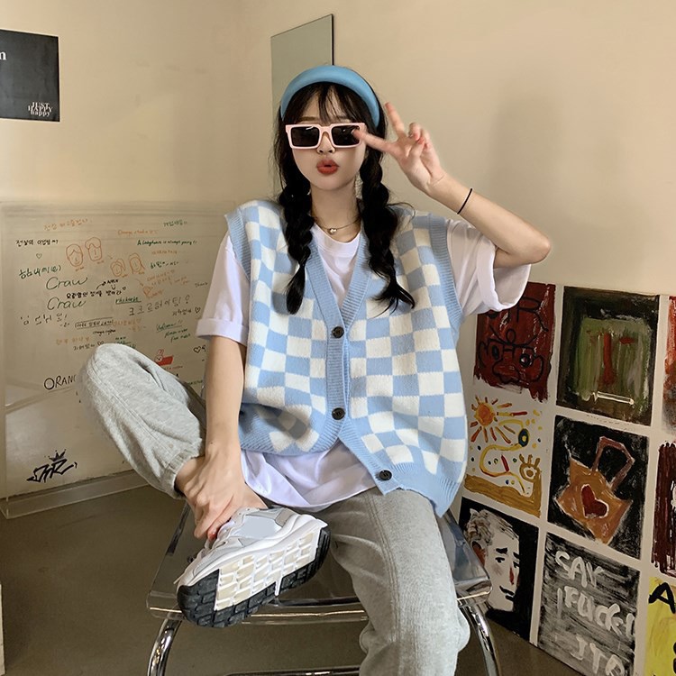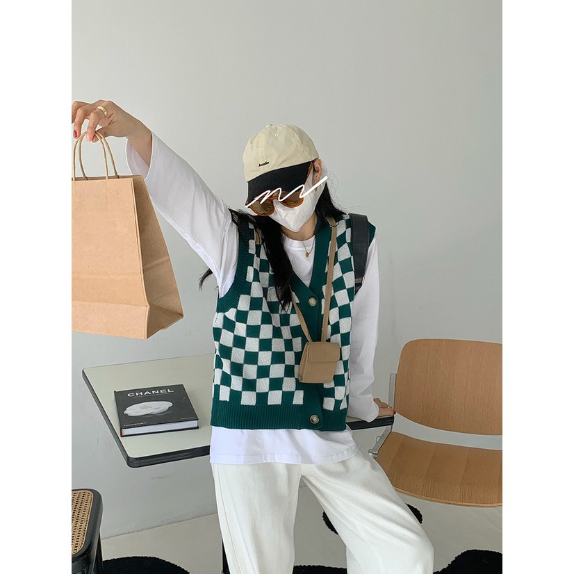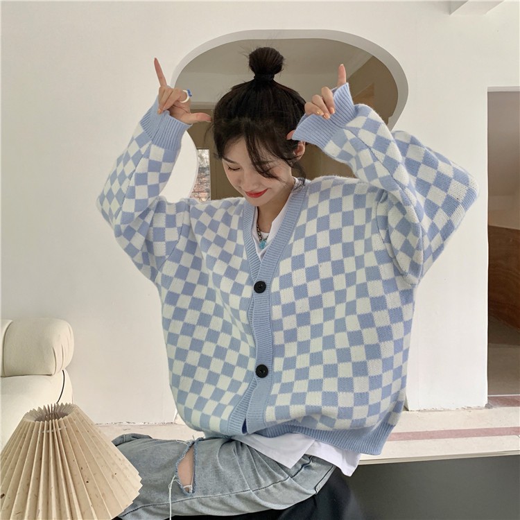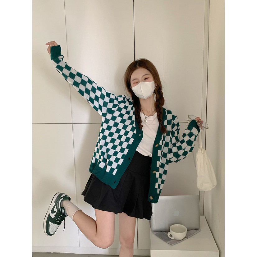 Cicishop(SALE/สุ่ม Z1073/Z1074)เสื้อไหมพรมทอสลับสีลายตาราง 2แบบ2ลุค เสื้อกั๊ก-เสื้อคลุม