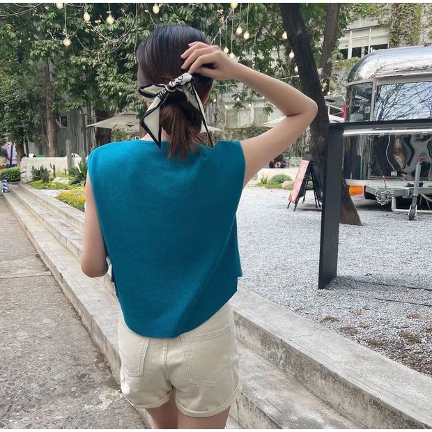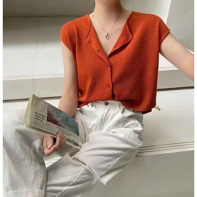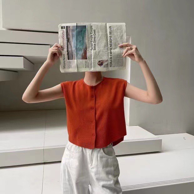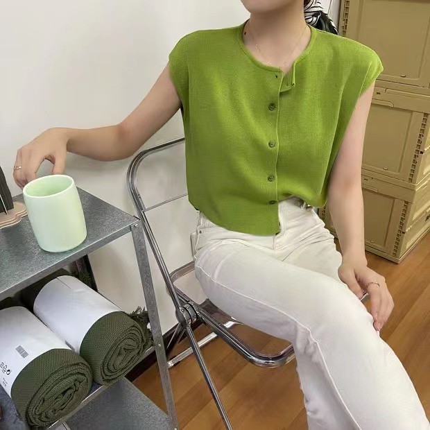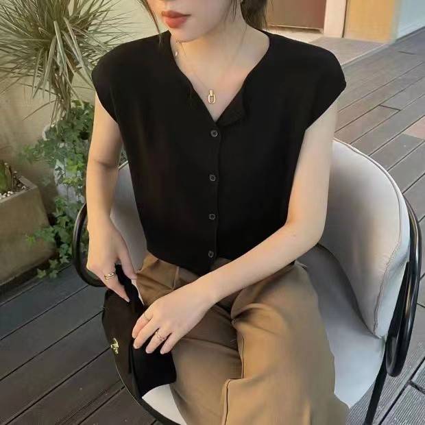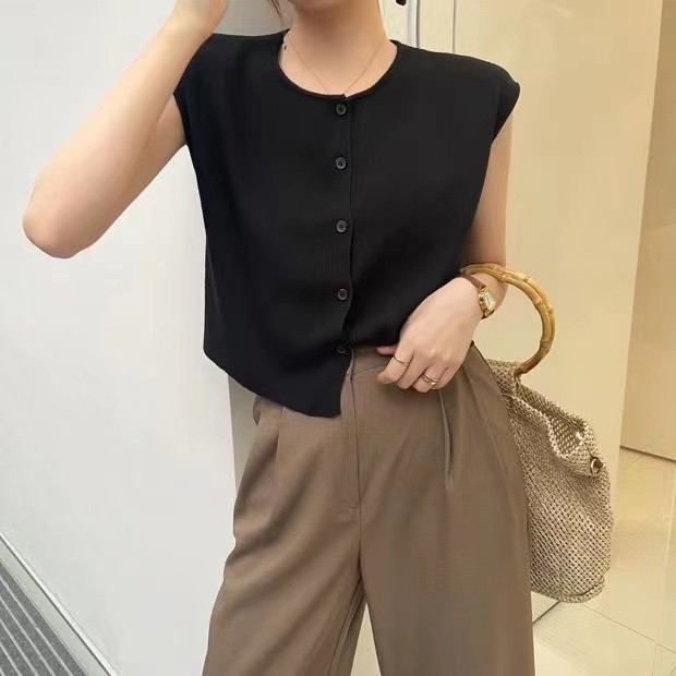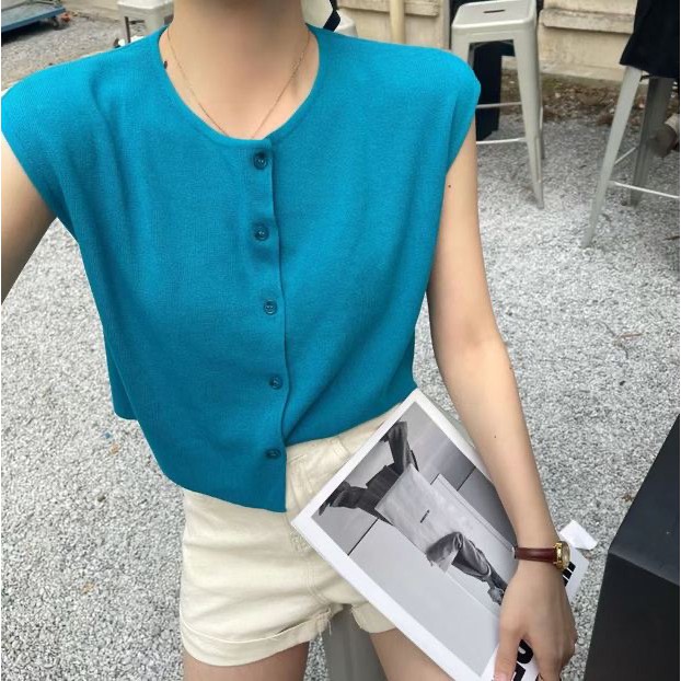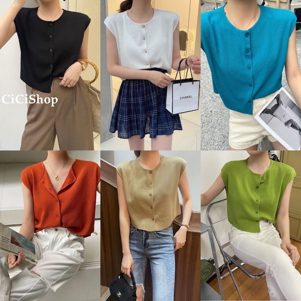 Cicishop(2544)เส ื้อครอปแขนกุดกระดุมผ่ากลาง ผ้าknitนิ่มมาก ทรงสวยใส่แมทช์ง่าย