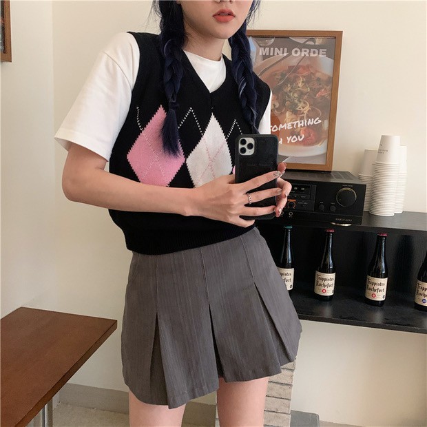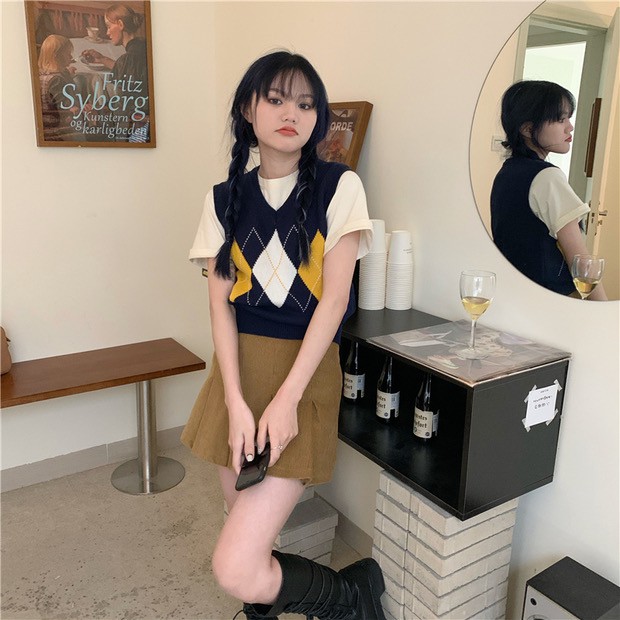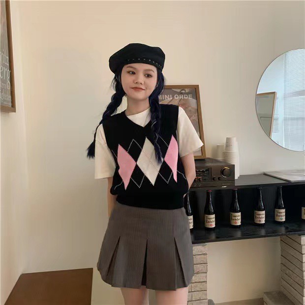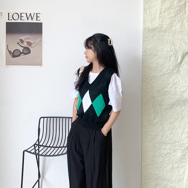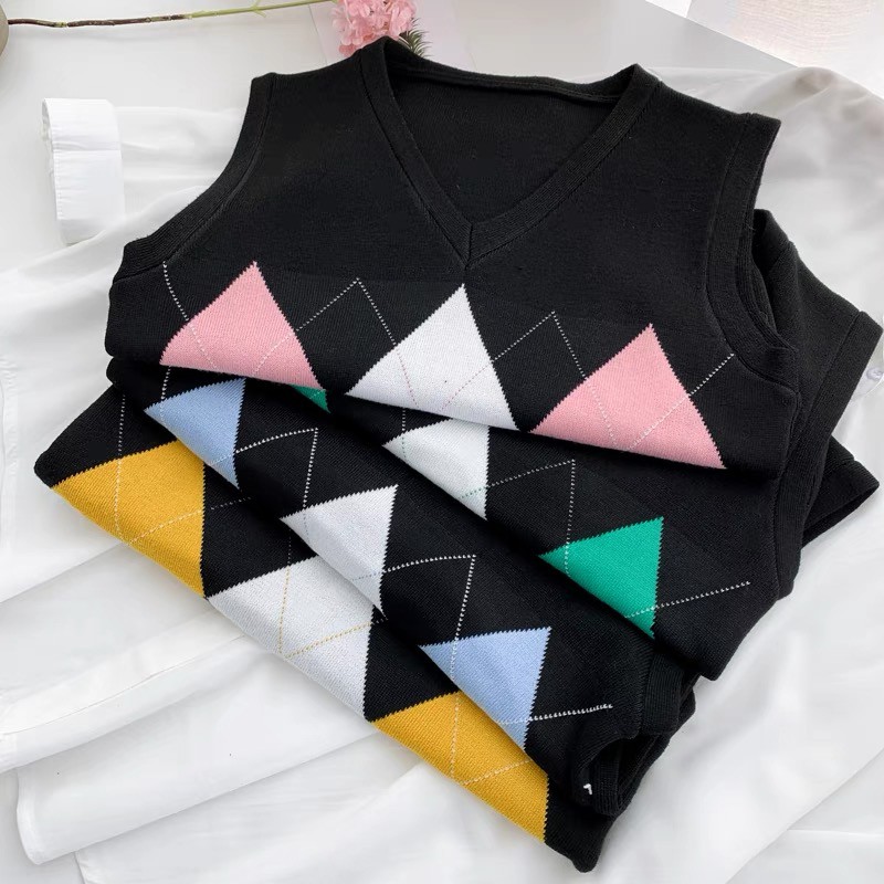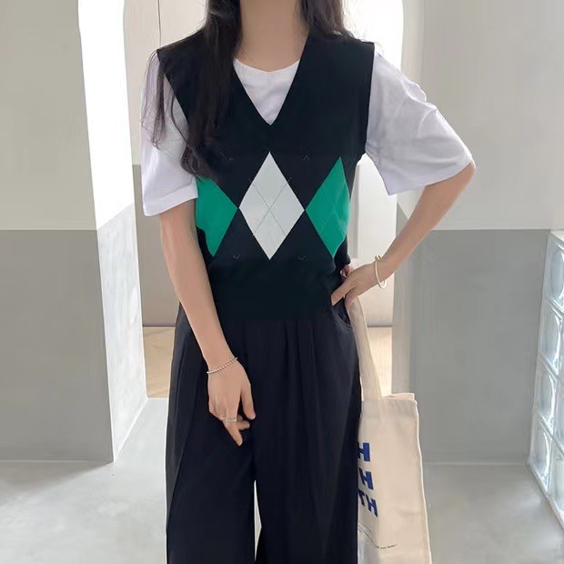 Cicishop(95007)เสื้อกั๊กไหมพรม มีดีเทลทอสลับสีลายข้าวหลามตัดตรงกลางเก๋ๆ ลุคสไตล์เกาหลี
