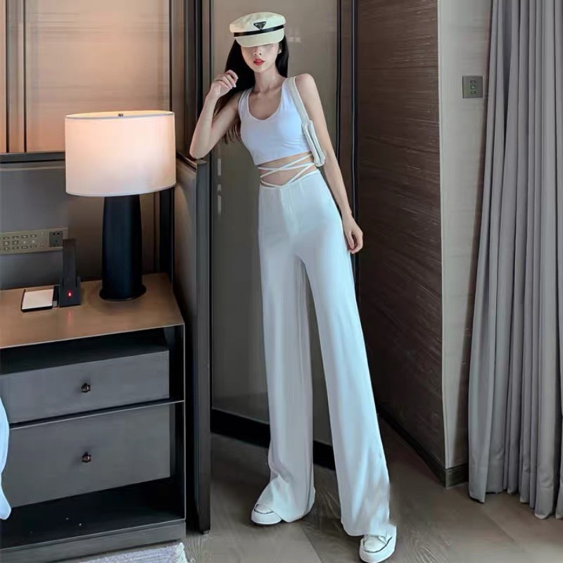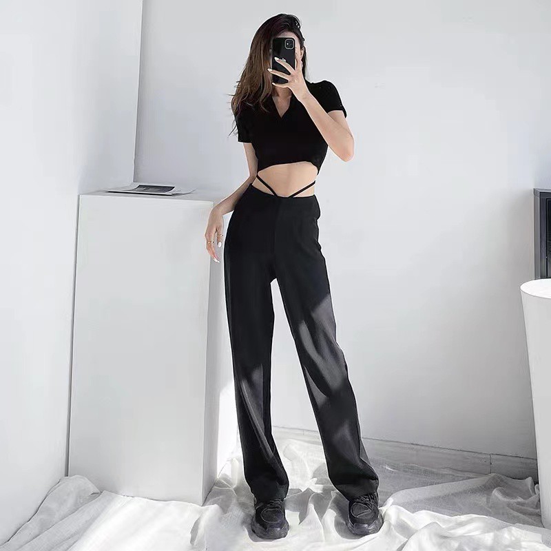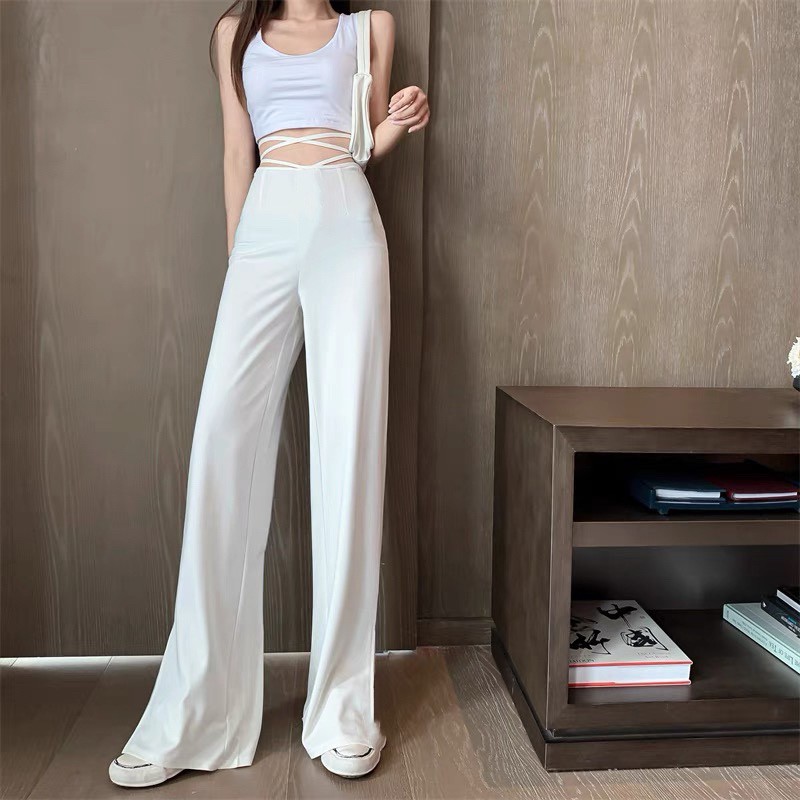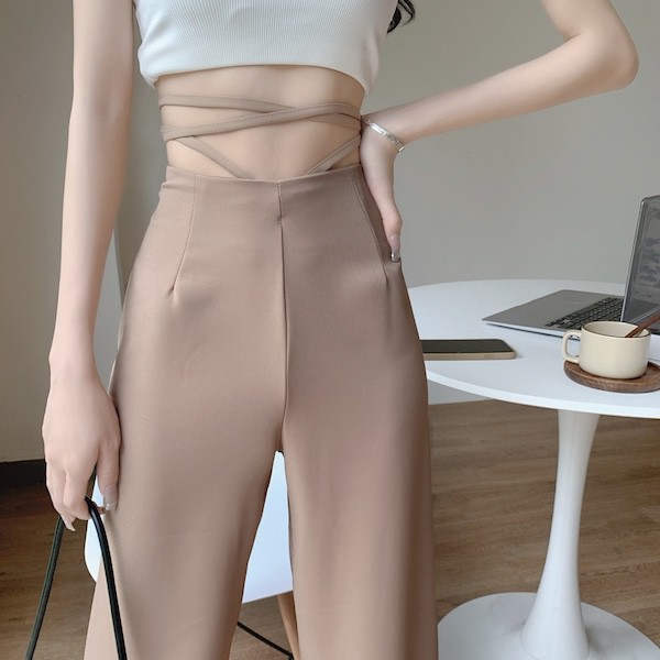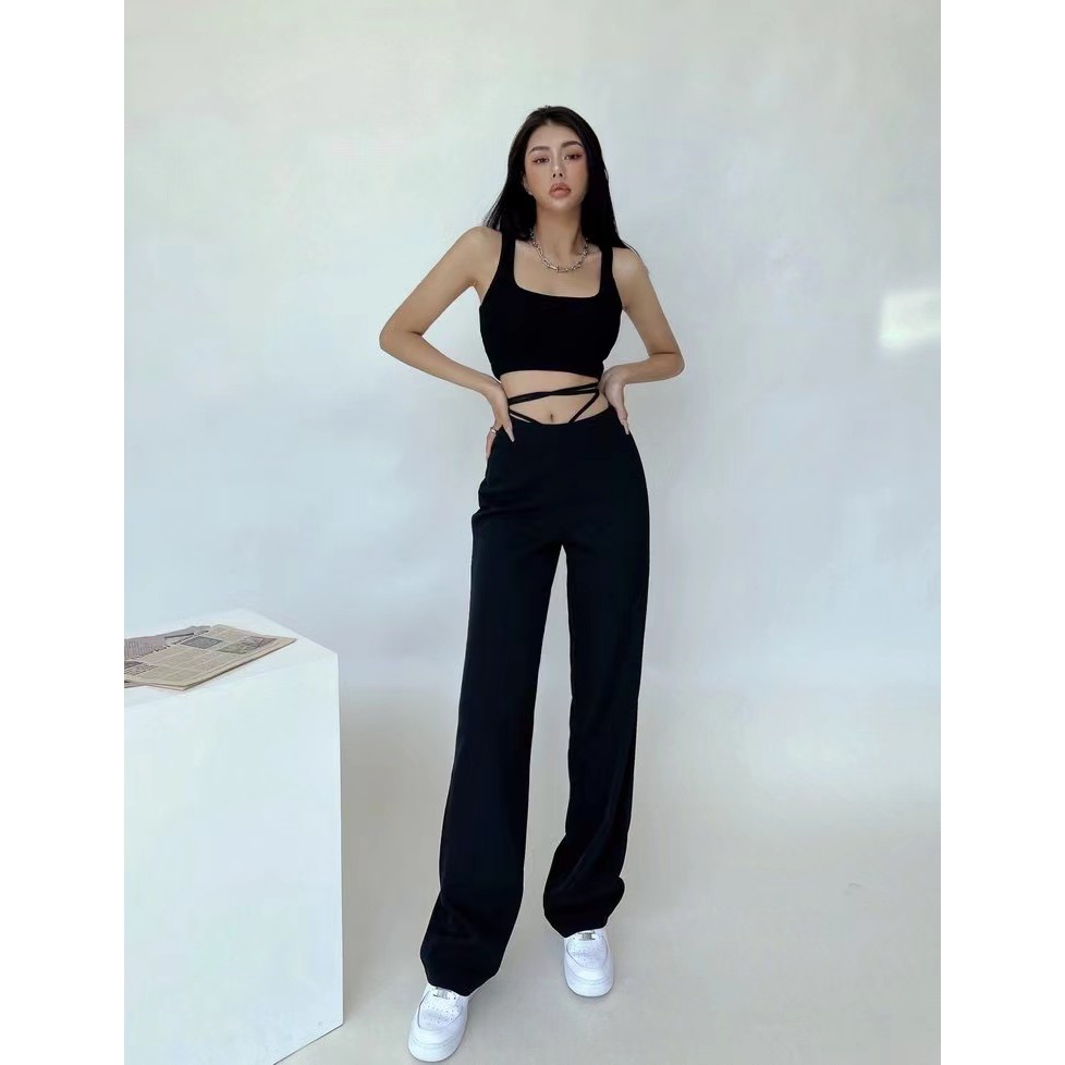 Cicishop(238)กางเกงขายาวทรงกระบอก เนื้อผ้าดีไม่ยับ มีดีเทลสายพันรอบเอวเกร๋สุดๆ