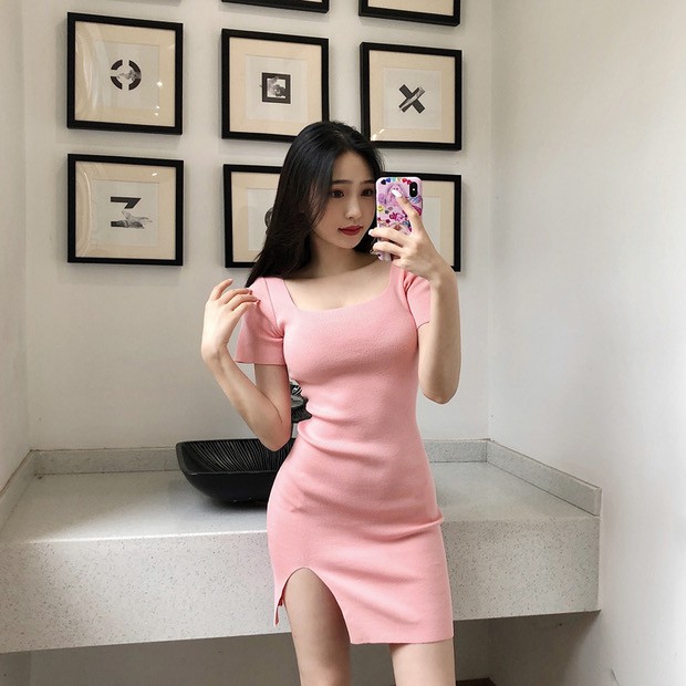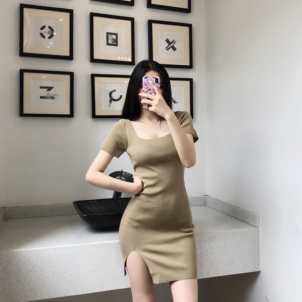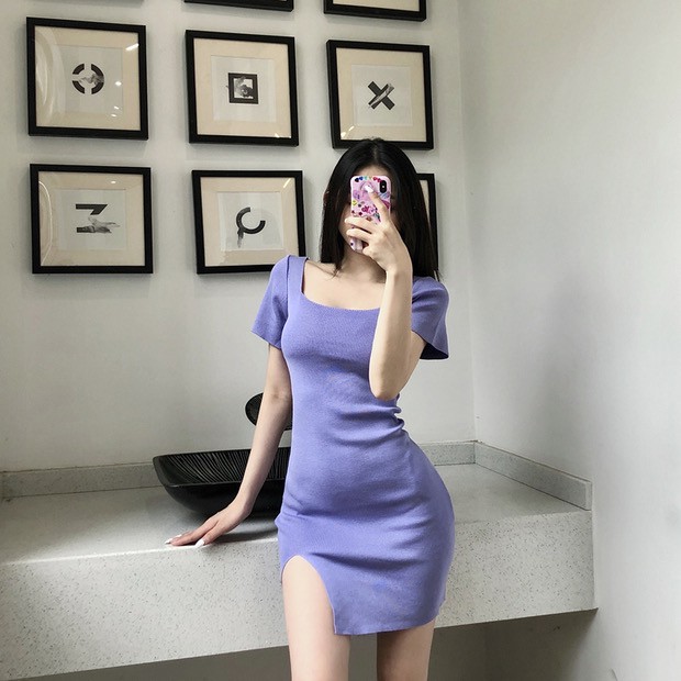 Cicishop(037-1)เดรสไหมพรมคอเหลี่ยม แขนสั้น ตัวเก๋แต่งดีไซน์ แหวกขาเพิ่มความเผ็ชไฟลุกฟู่