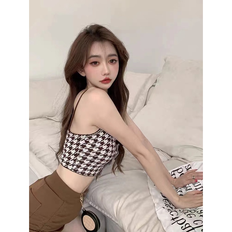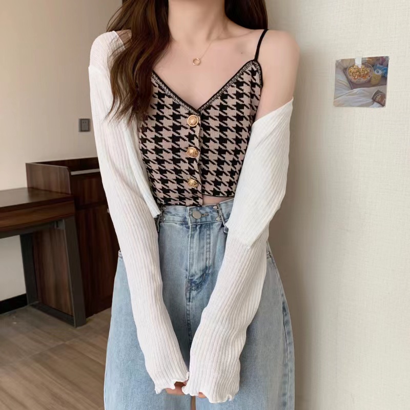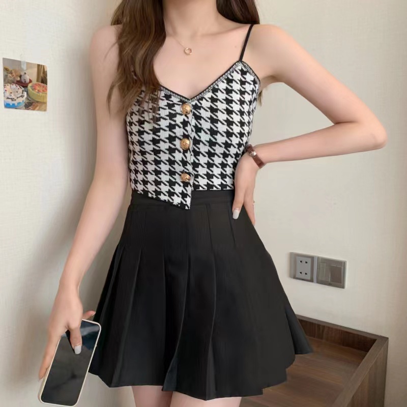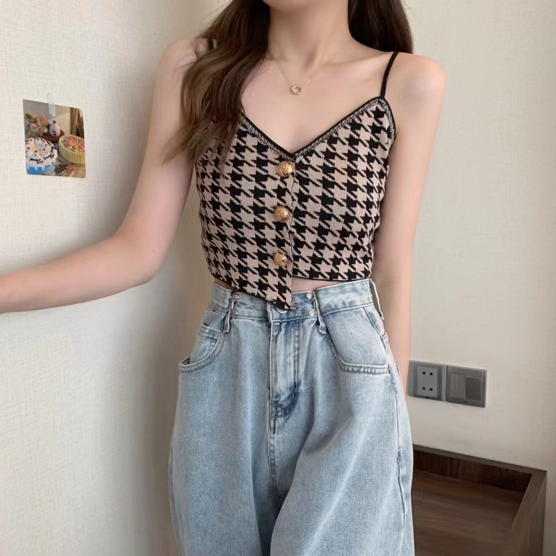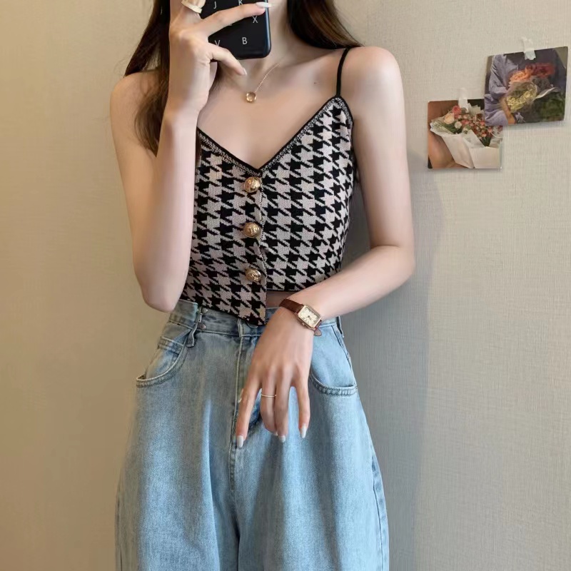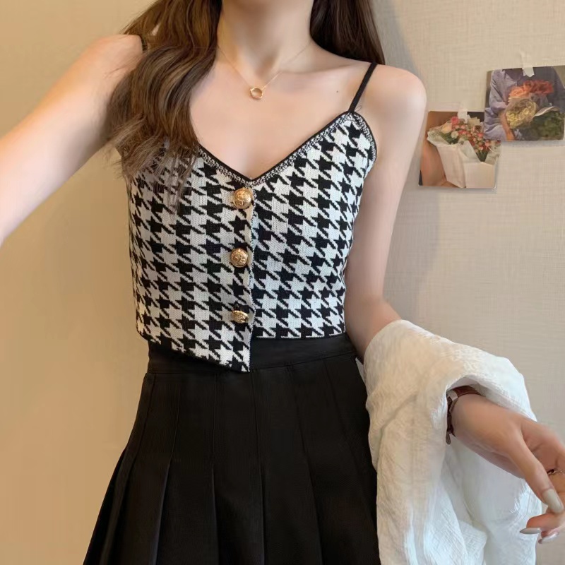 Cicishop(70095)สายเดี่ยวไหมพรมลายกราฟฟิก คอวี แต่งกระดุมใไม่เท่ากันเพื่อความเก๋ไก๋ สวยหรู เซ็กซี่สุดอะไรสุด