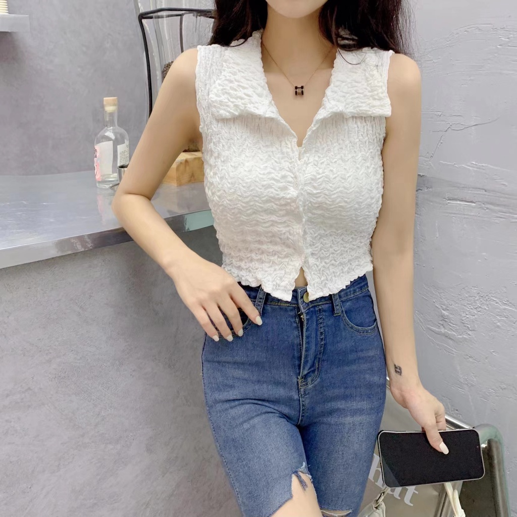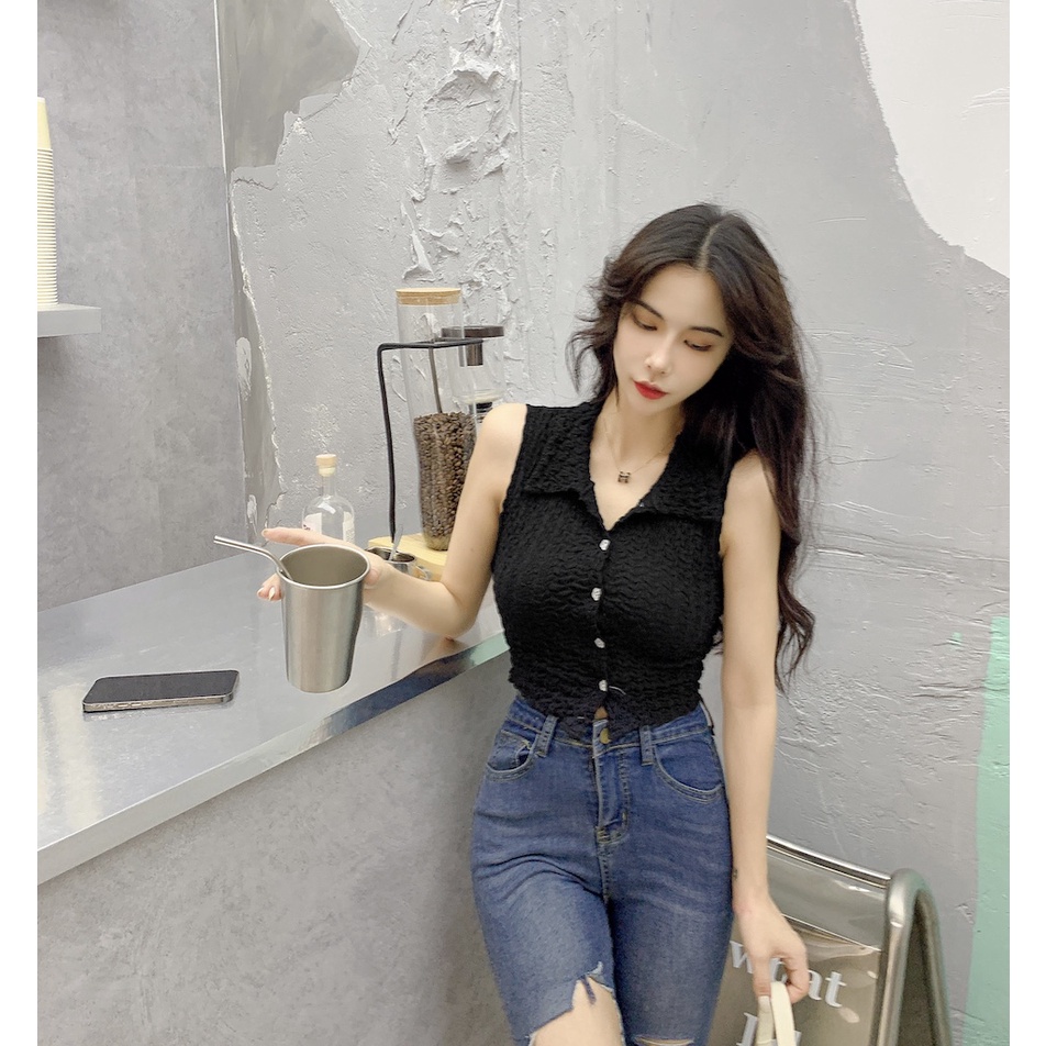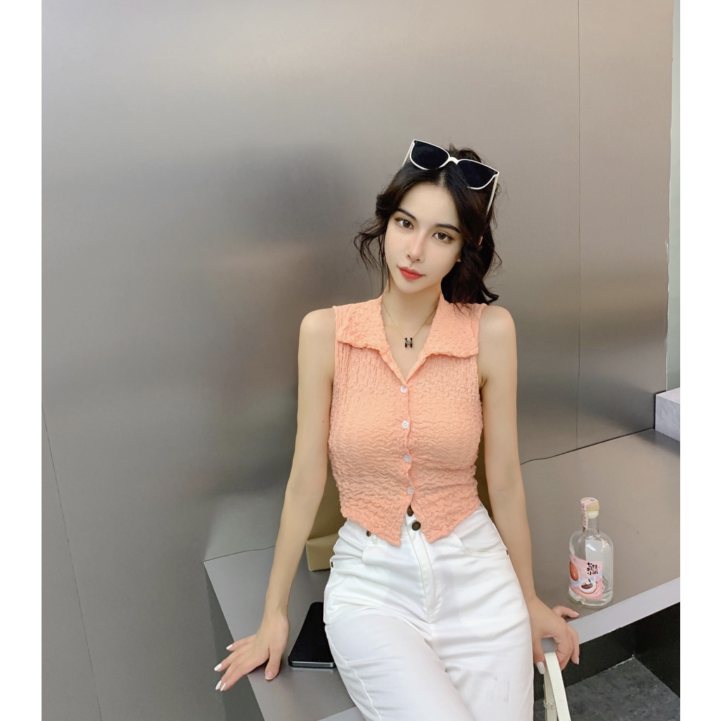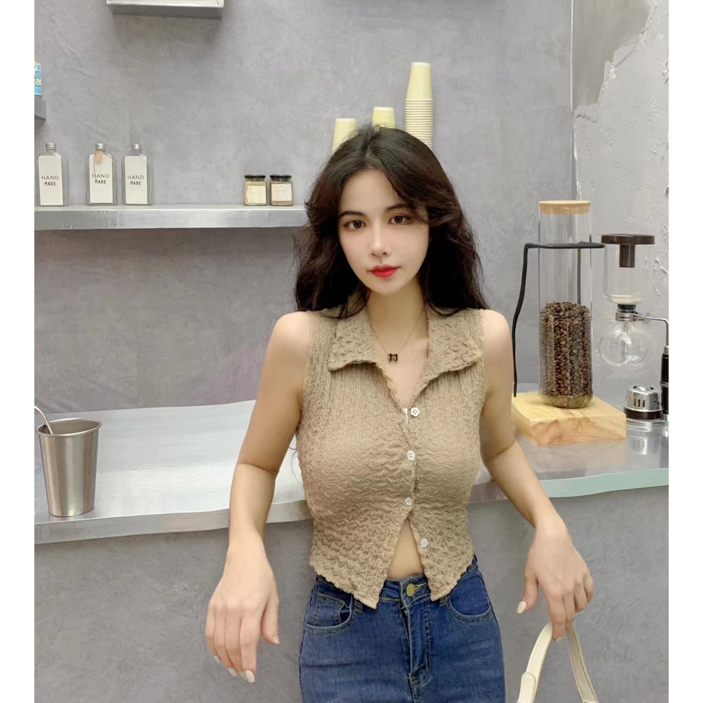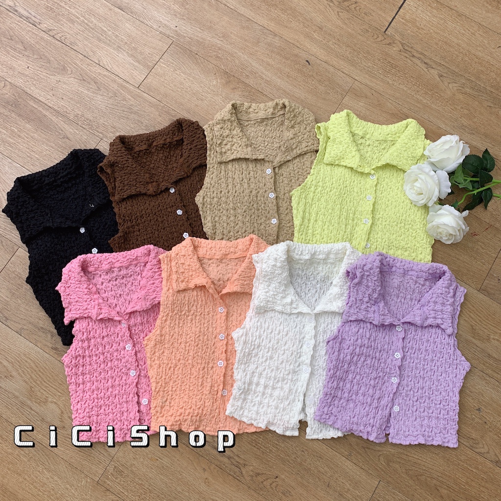 Cicishop(112)เสิ้อแขนกุด คอปก กระดุมผ่ากลางน่ารักมากดูแพง ทรงน่ารักเข้ากับเนื้อผ้า