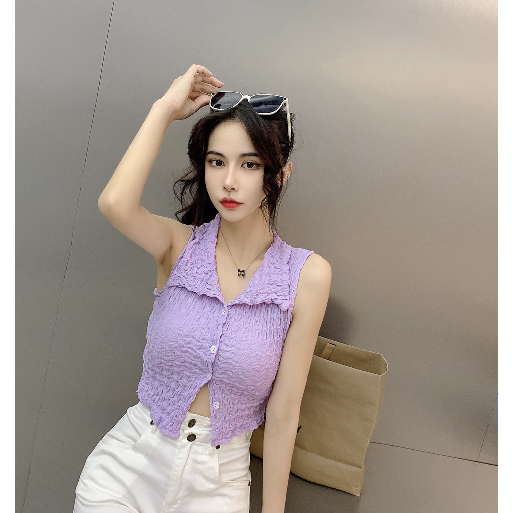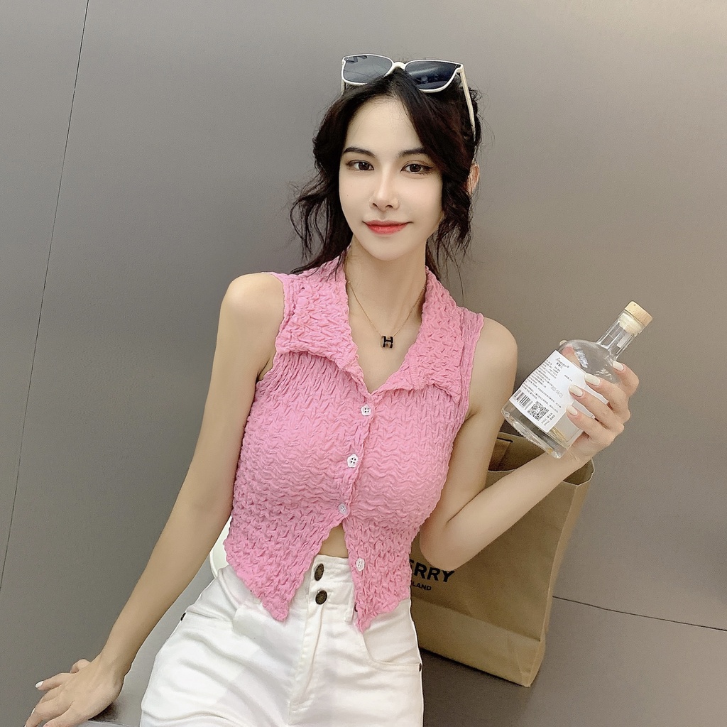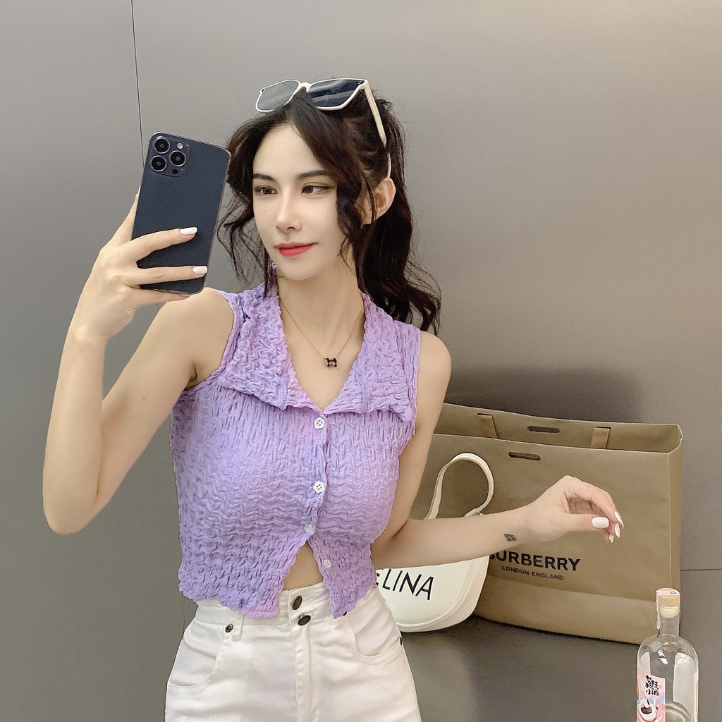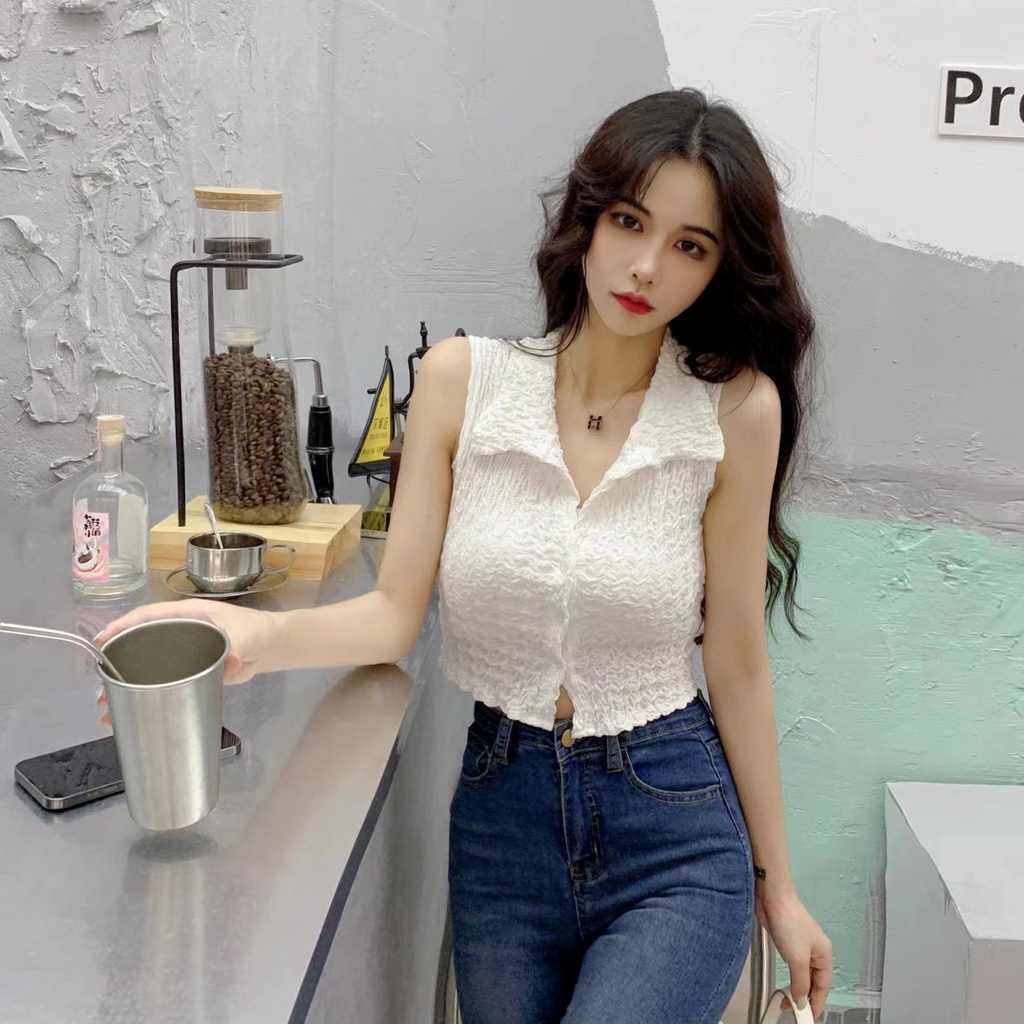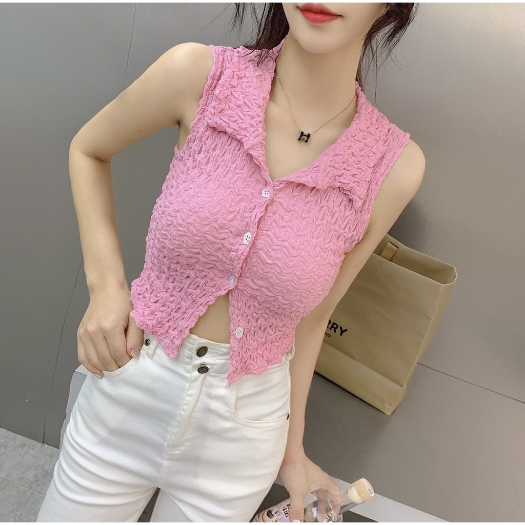 Cicishop(112)เสิ้อแขนกุด คอปก กระดุมผ่ากลางน่ารักมากดูแพง ทรงน่ารักเข้ากับเนื้อผ้า