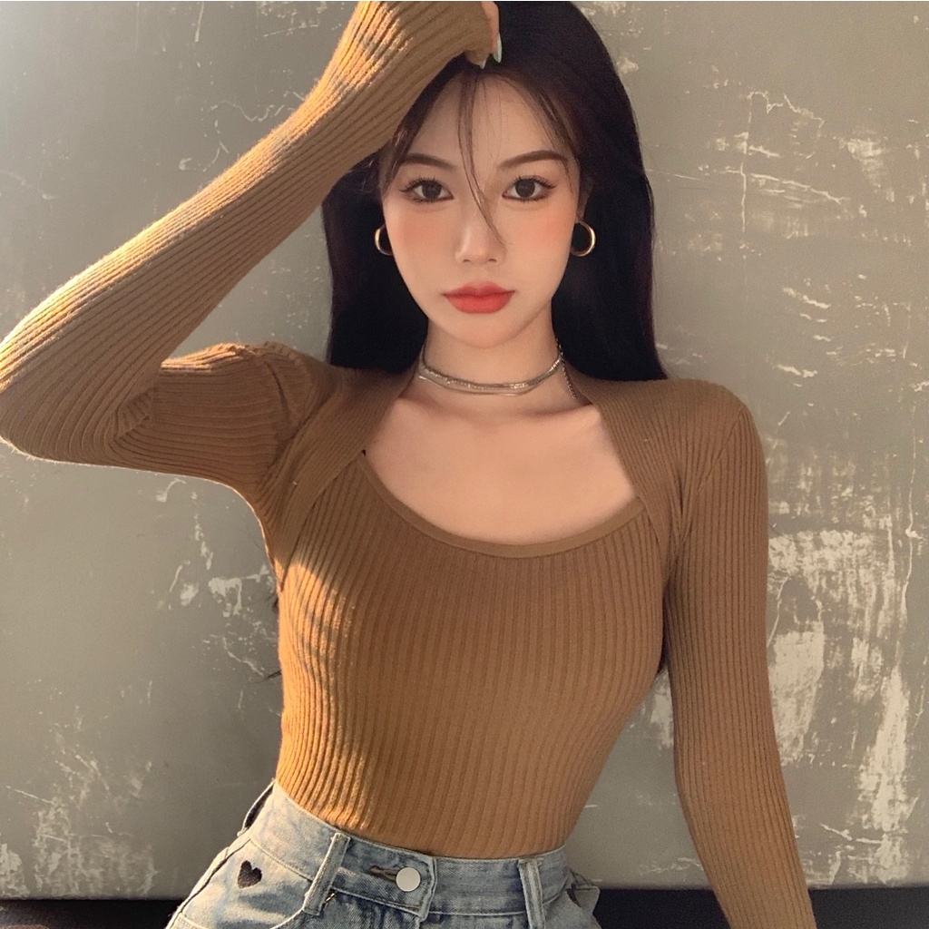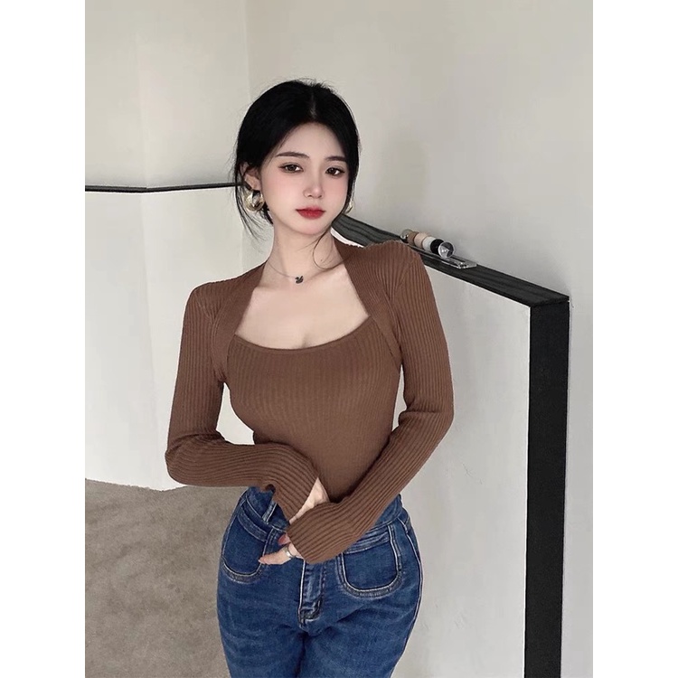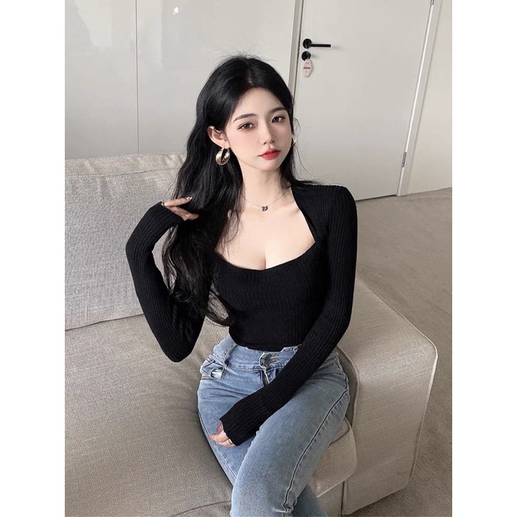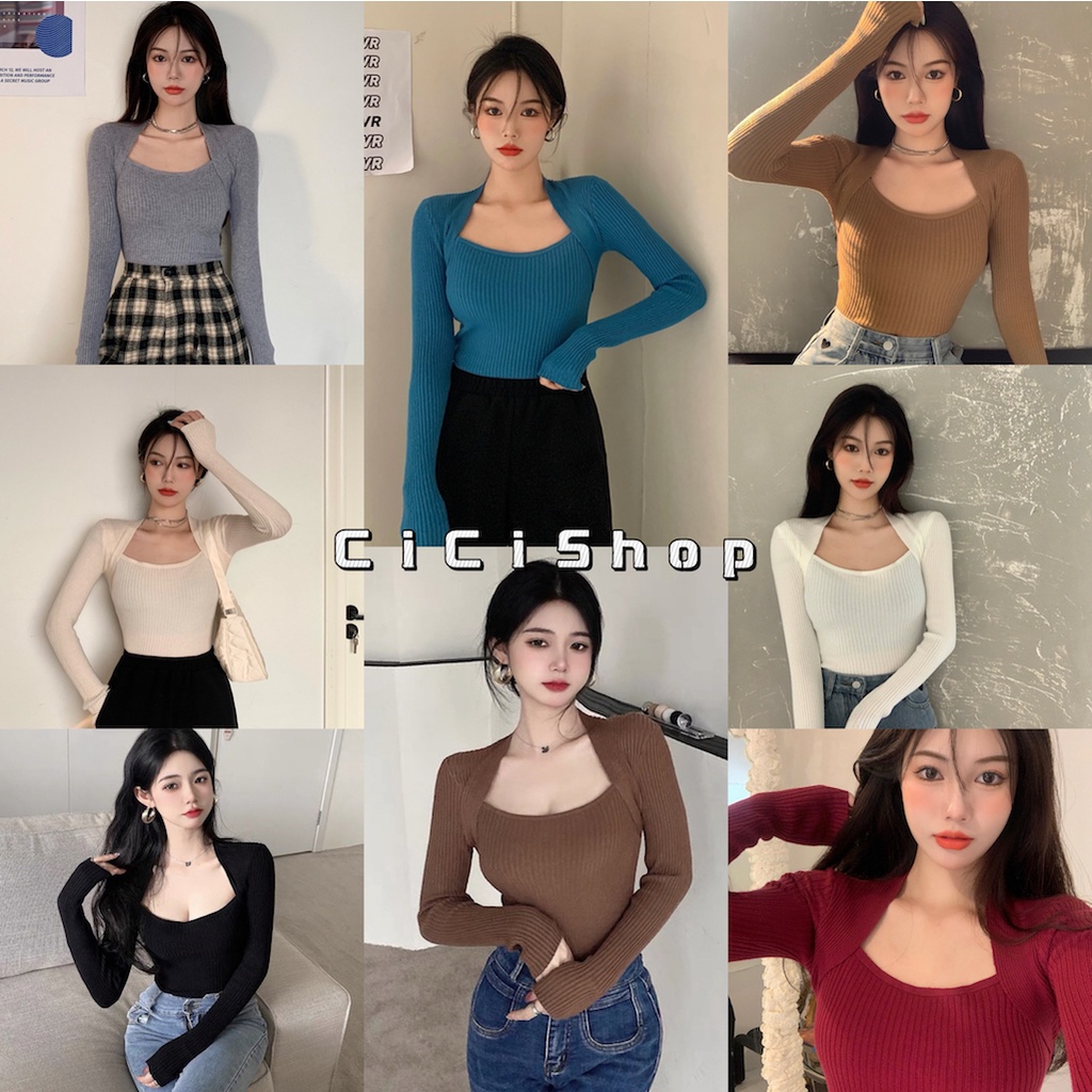 Cicishop(3006/5508)เสื้อแขนยาวผ้าไหมพรม คอเหลี่ยม เป็นทรงเข้ารูป