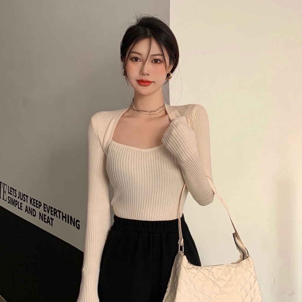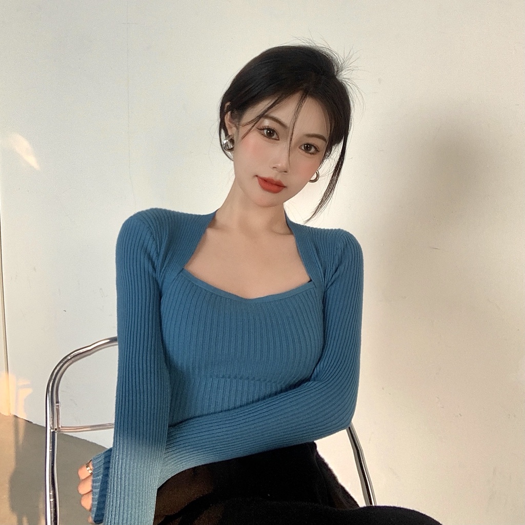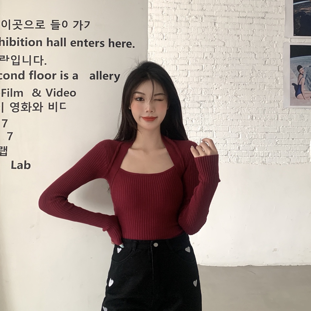 Cicishop(3006/5508)เสื้อแขนยาวผ้าไหมพรม คอเหลี่ยม เป็นทรงเข้ารูป