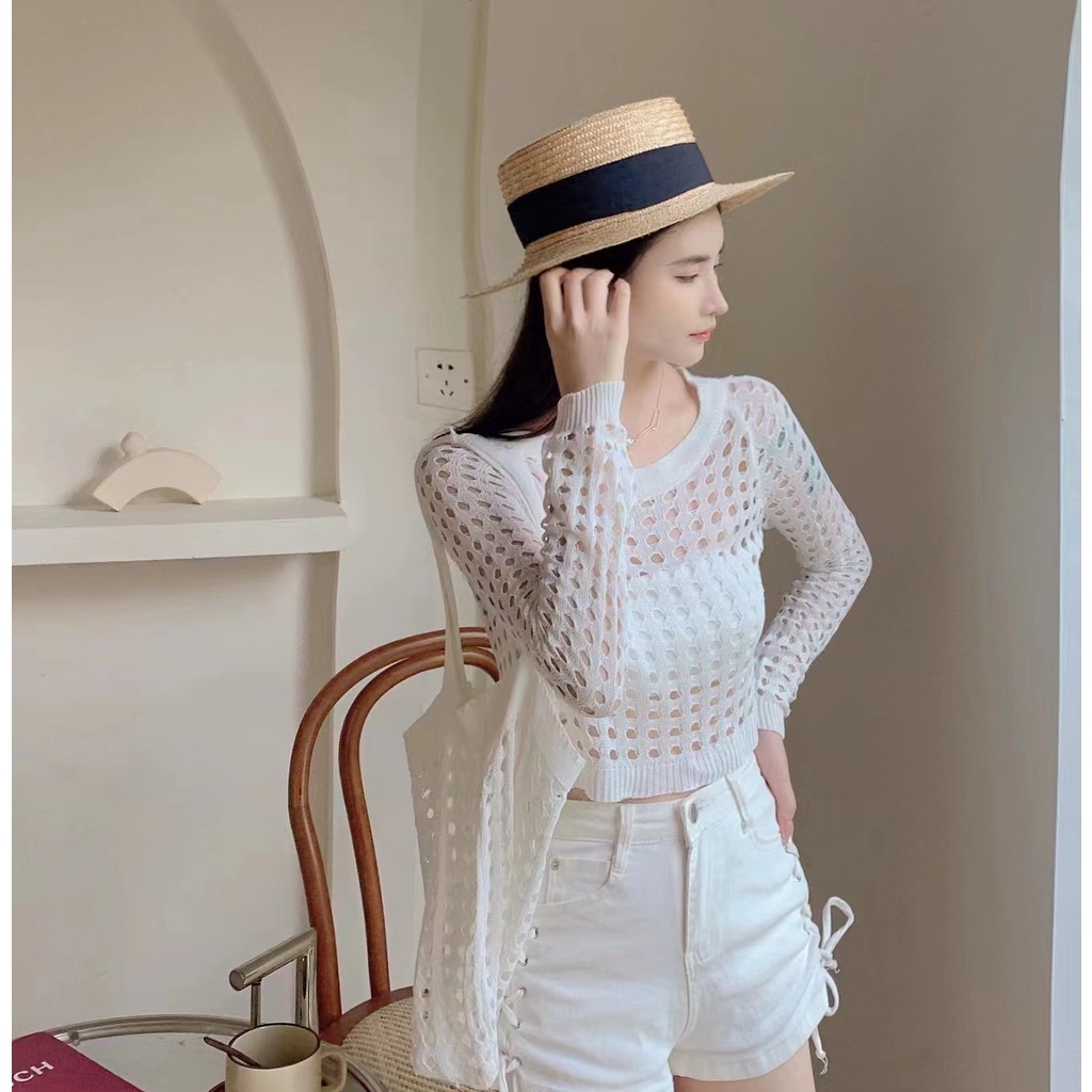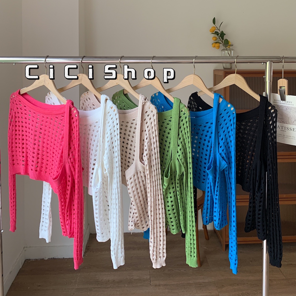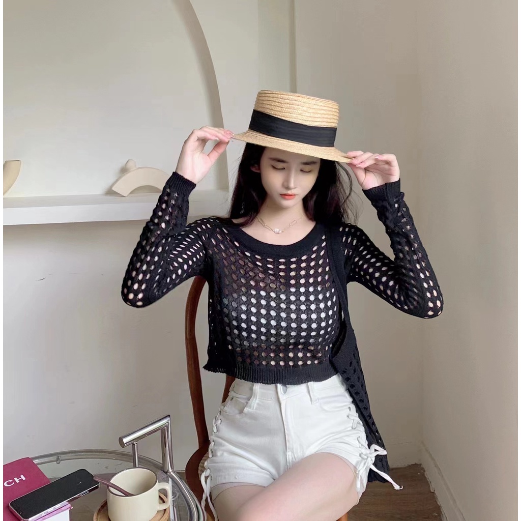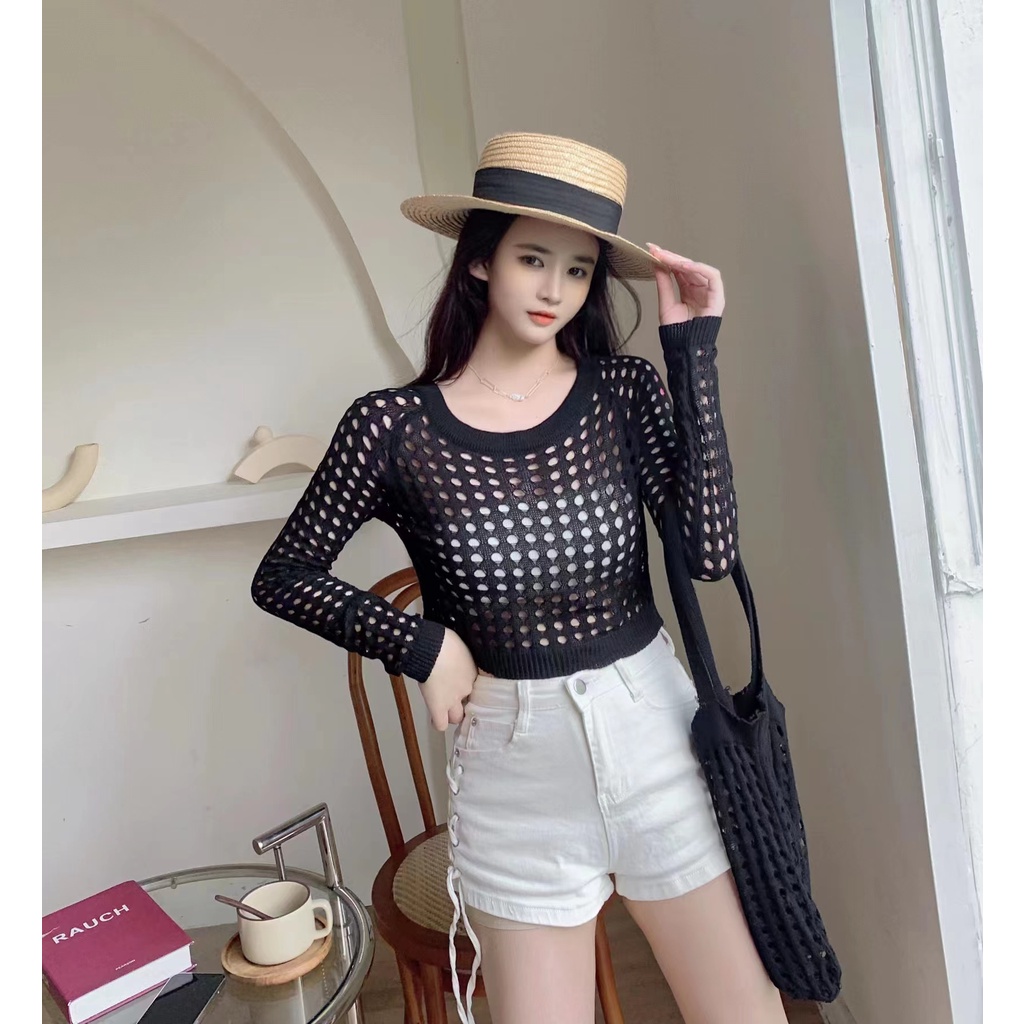 Cicishop (SALE TT2165)KnitTop+Bag Set เสื้อไหมพรมถักโครเชต์กิมมิคตาข่าย จับคู่แมตช์กระเป๋าข้าง สไตล์สายเกา