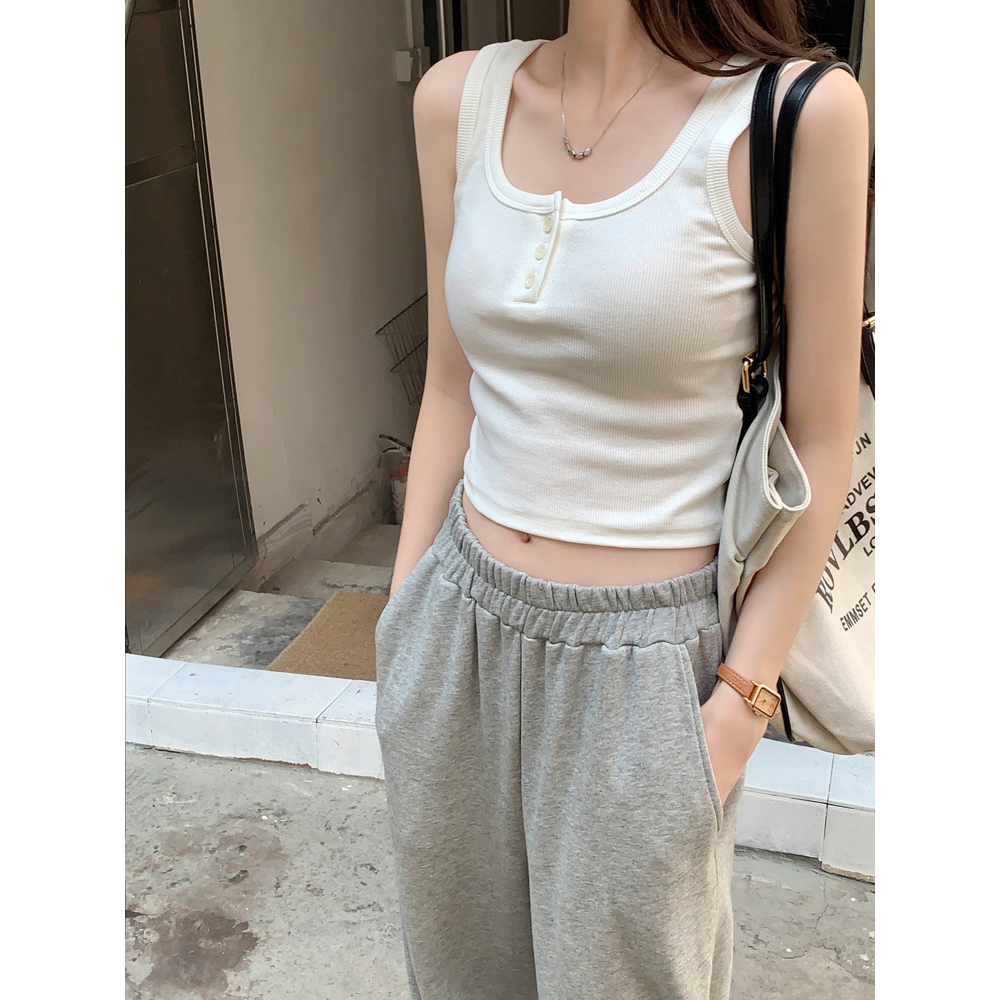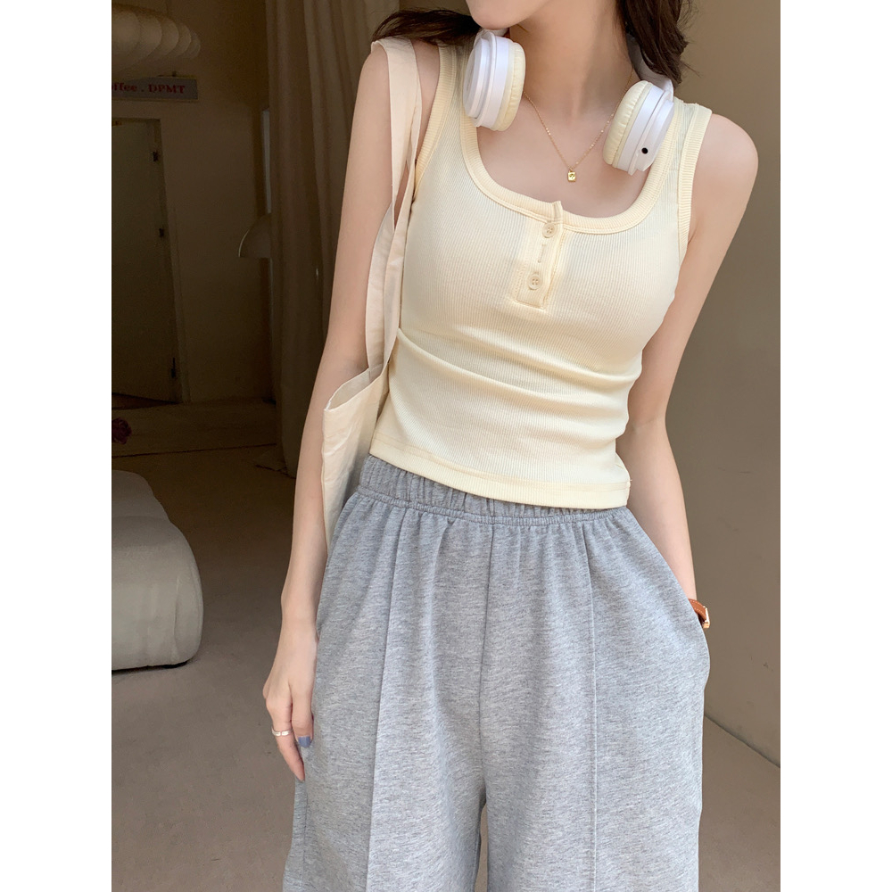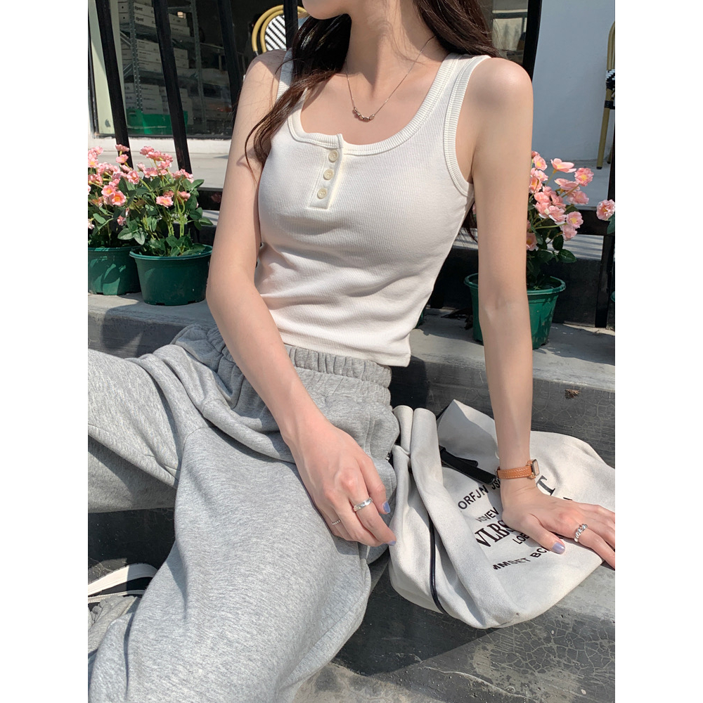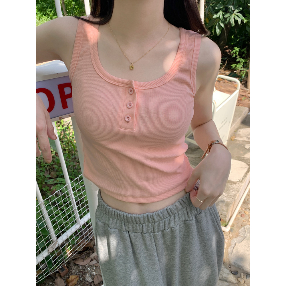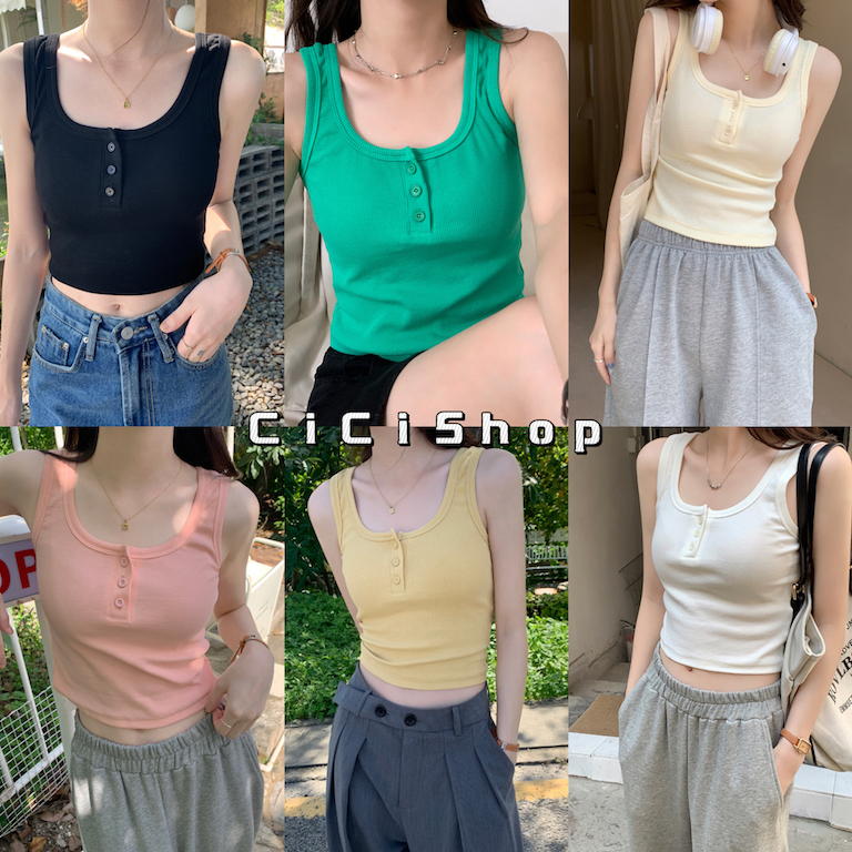 Cicishop(J1033)เสื้อกล้ามแฟชั่น อกแต่งกระดุม 3 เม็ด สีพื้นสุดCute