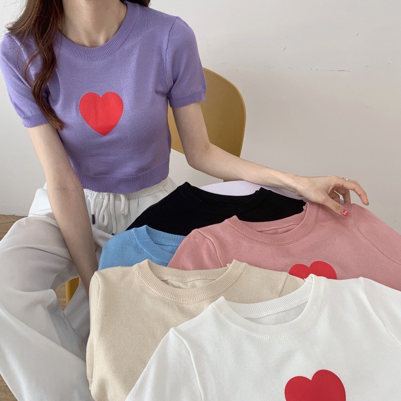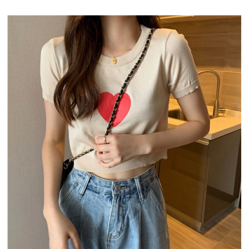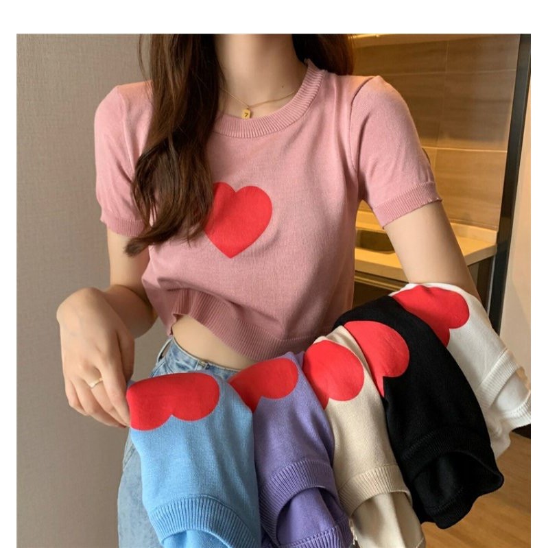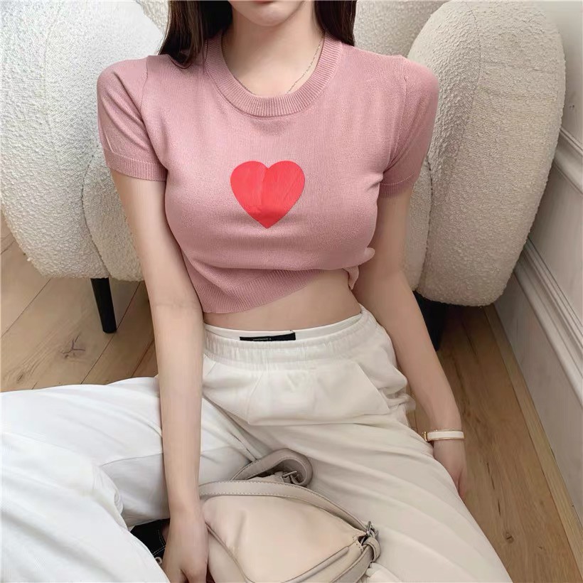 Cicishop(พร้อมส่ง)(NEW6210)เสื้อครอปแขนสั้น ผ้าไหมพรม รูปหัวใจงานน่ารักมาก วาเลนไทน์