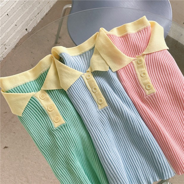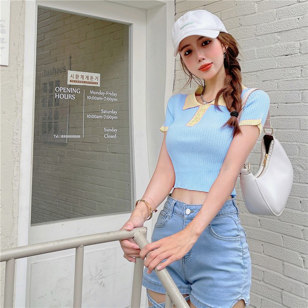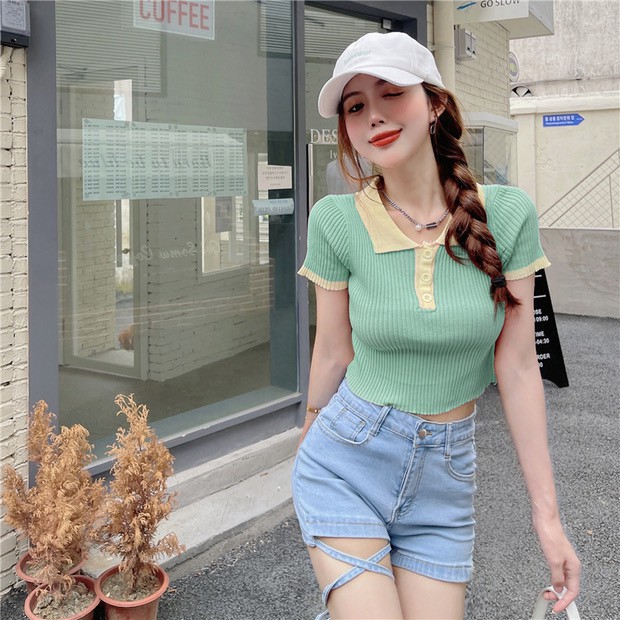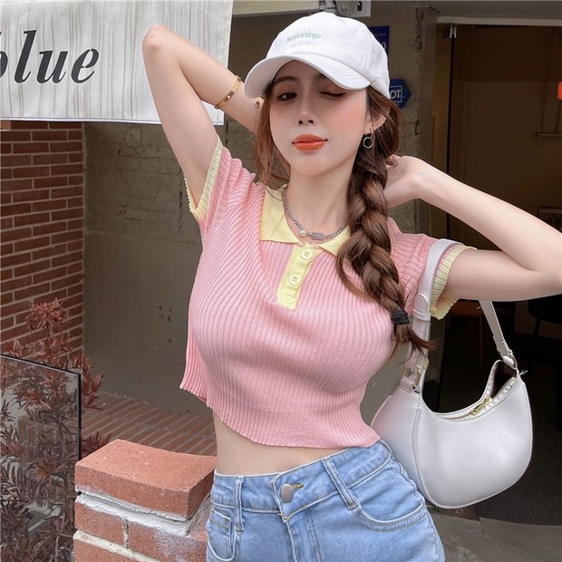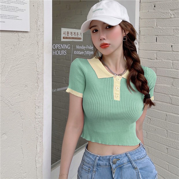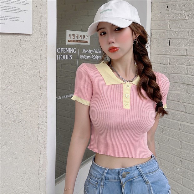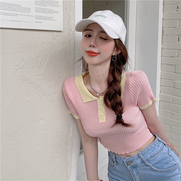 Cicishop(39087)เส ื้อครอปแขนสั้นคอปกผ้าไหมพรม มีดีเทลกระดุม สีหวานโทนพาสเทล