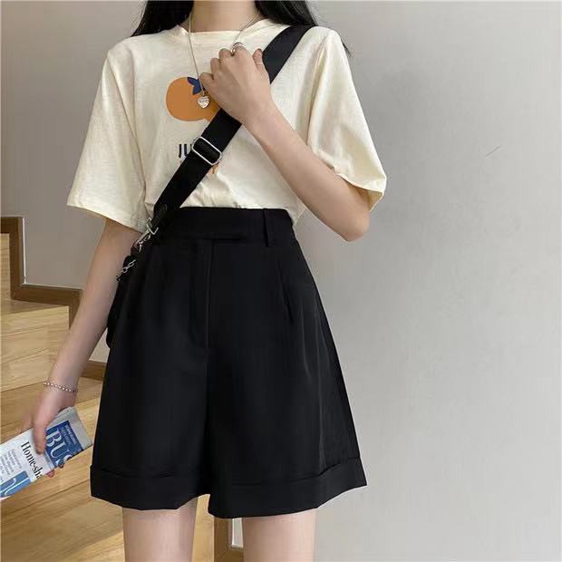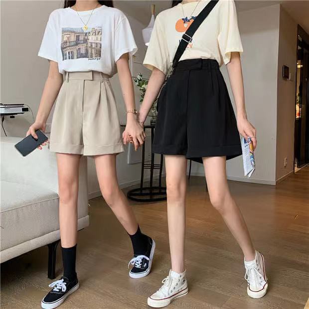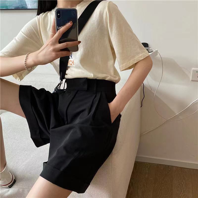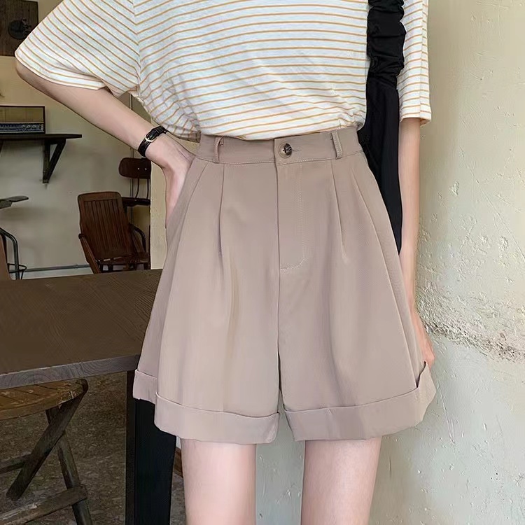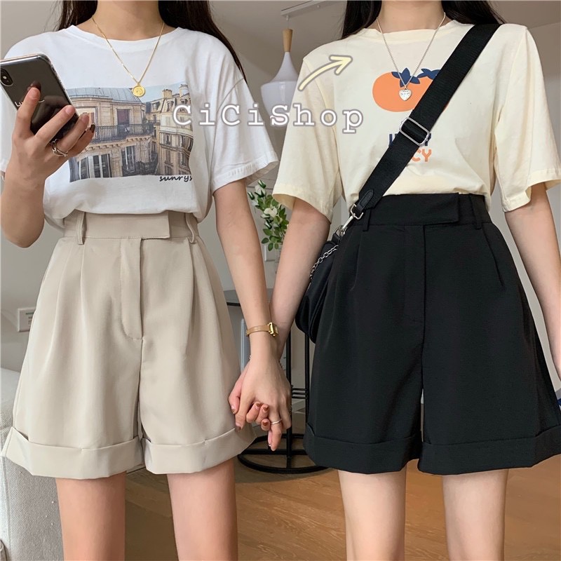 Cicishop(507)กางเกงขาสั้น ผ้าฝ้ายคัตตอล พับขาทรงเอวสูง จีบหน้า(ตะขอหน้า) รุ่นเก็บทรงดีมาก