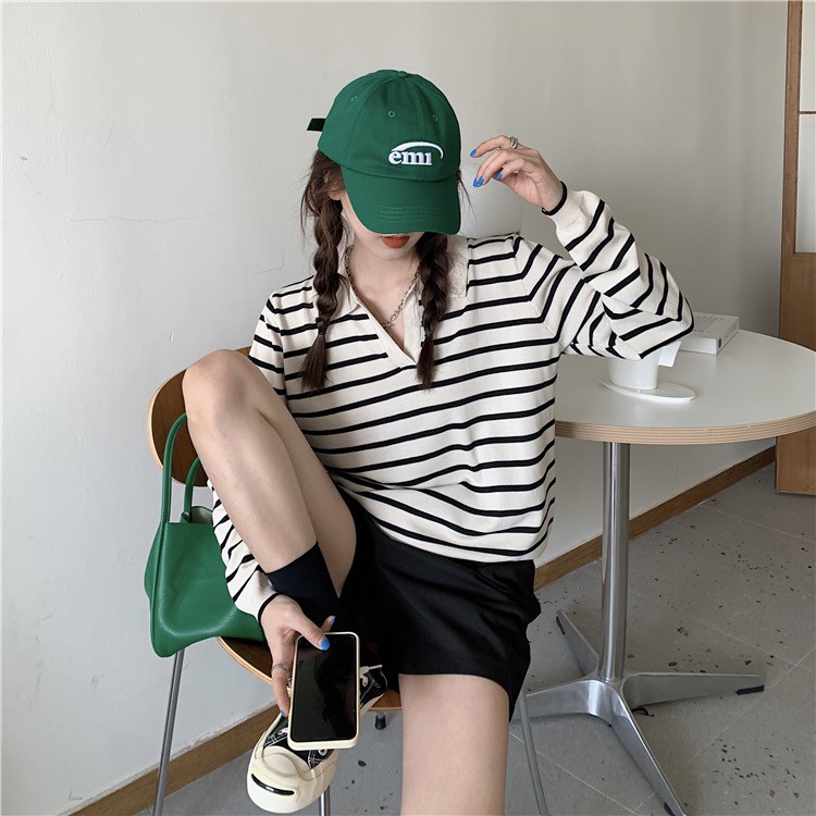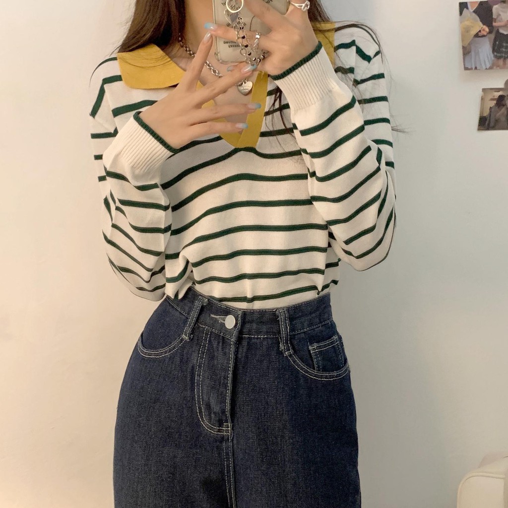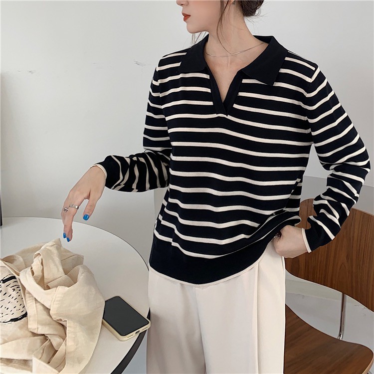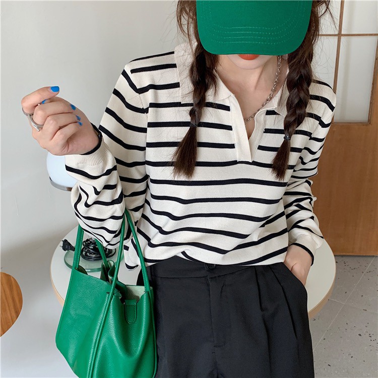 Cicishop(81018-1)เสื้อแขนยาวคอปกลายทาง ผ้าไหมพรมผ้ายืดได้เยอะ สไตล์เกาหลี