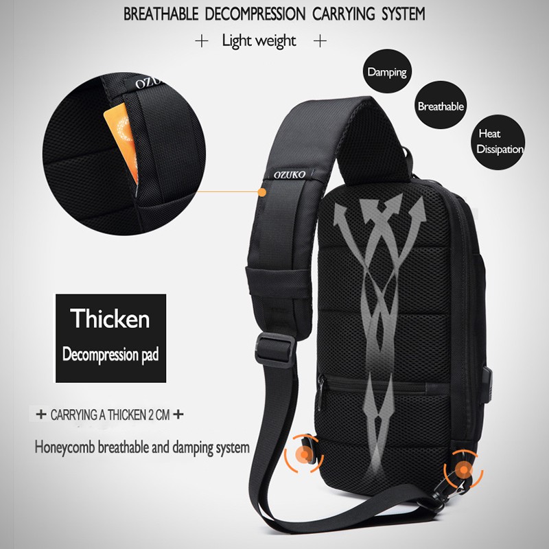 Ozuko กระเป๋าคาดอก กันน้ำ พร้อมตัวล็อกนิรภัย และพอร์ตชาร์จ USB สีดํา เป็นที่นิยมในเกาหลี ส่งอย่างรวดเร็วจากไทย
