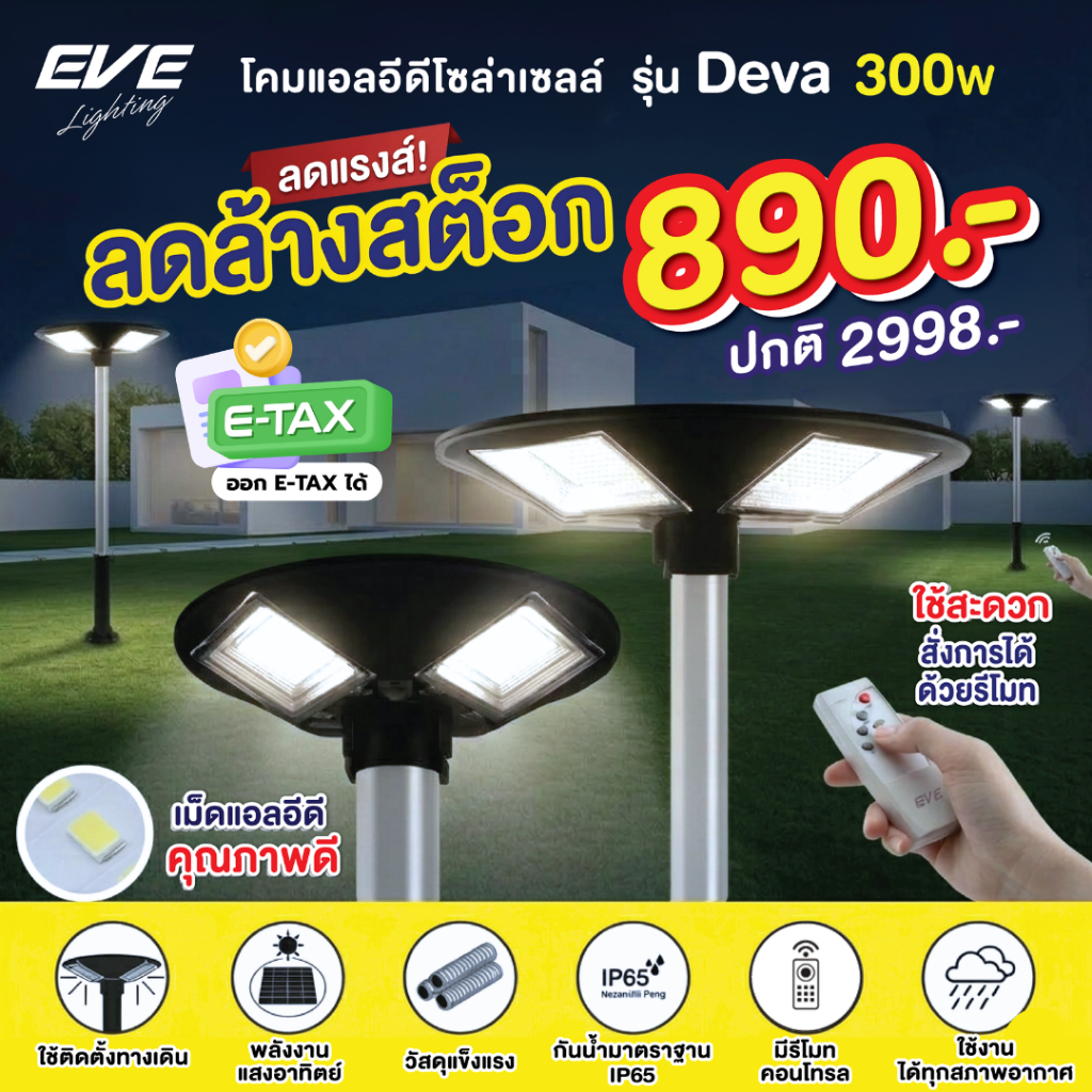 EVE ( ลดล้างสต๊อก ) โคมไฟสนาม โซล่าเซลล์ แอลอีดี UFO รุ่น Deva ขนาด 300 วัตต์ ( เฉพาะโคมไฟ ไม่รวมเสา )