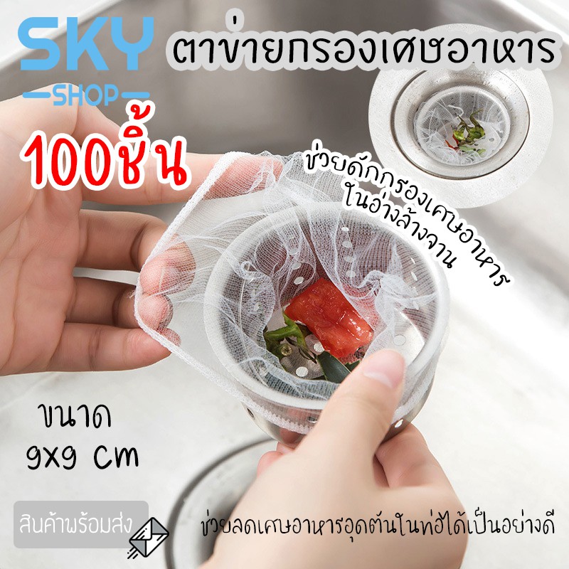 SKY ตาข่ายกรองเศษอาหาร 100 ชิ้น ถุงกรองเศษอาหาร 9x9cm สำหรับซิงค์ล้างจาน ตาข่ายดักขยะ เศษอาหาร