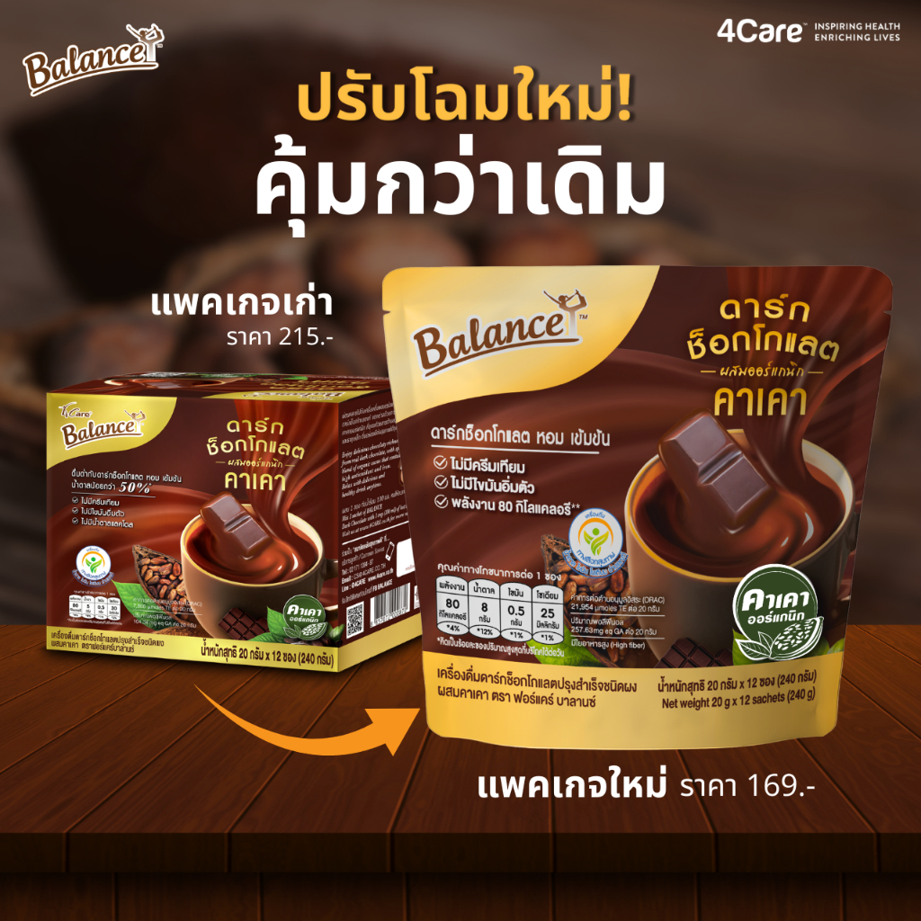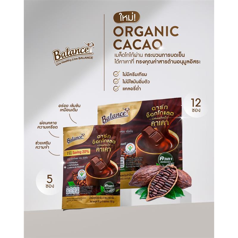 [1 ถุง 12 ซอง] 4Care Balance ดาร์กช็อกคาเคาออร์แกนิคนำเข้าจากเปรู หวานน้อย อร่อยเข้มข้น