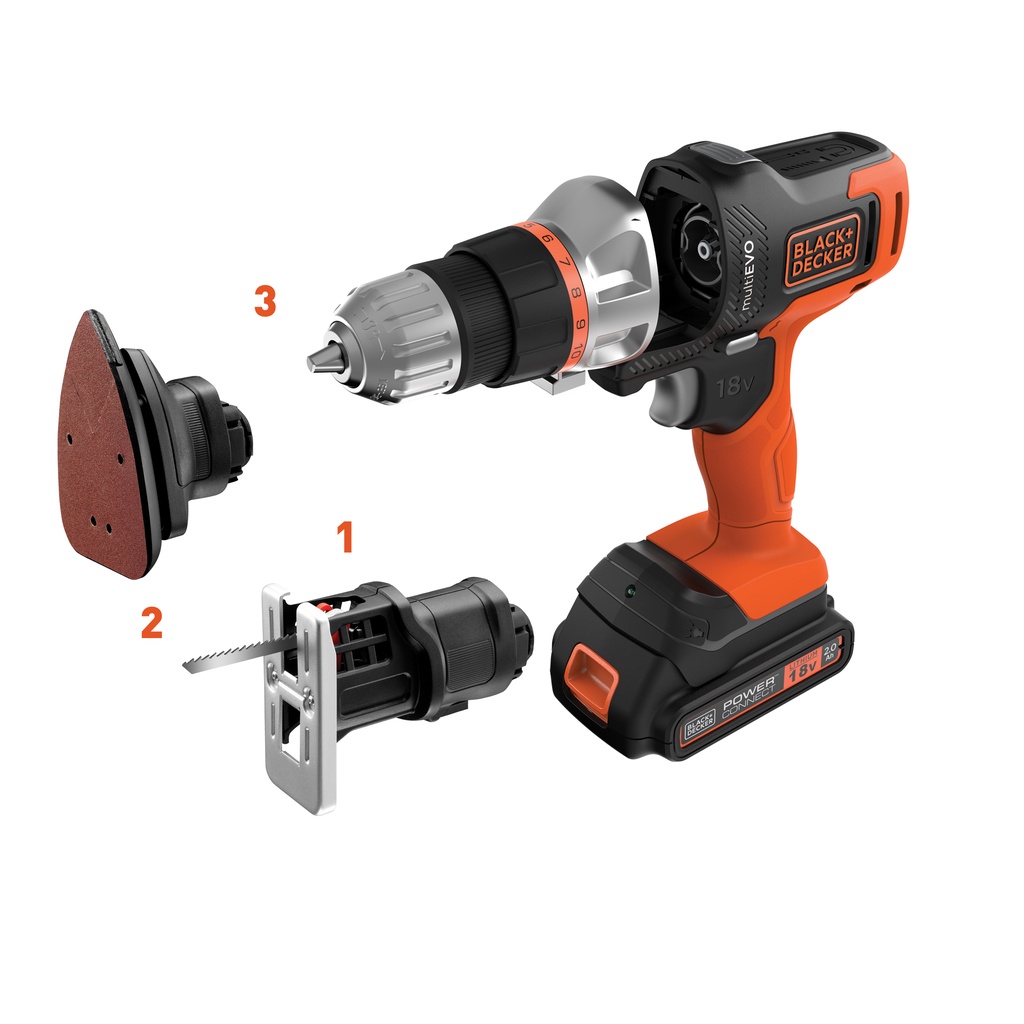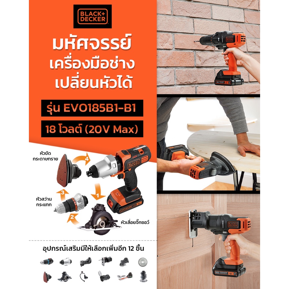 Black+Decker สว่านกระแทกไร้สายแบบเปลี่ยนหัวได้ 18 โวลต์ รุ่น EVO185B1-B1