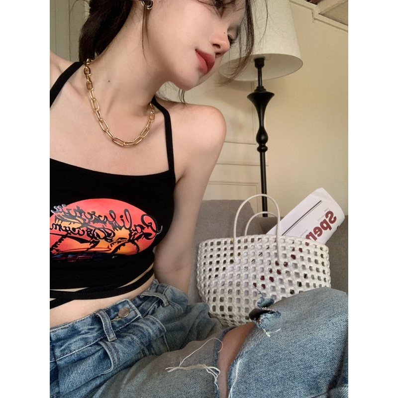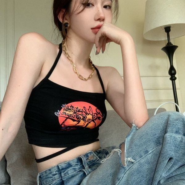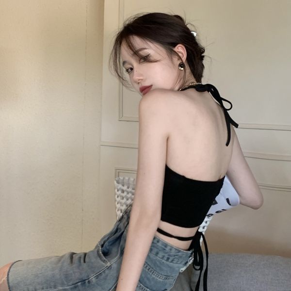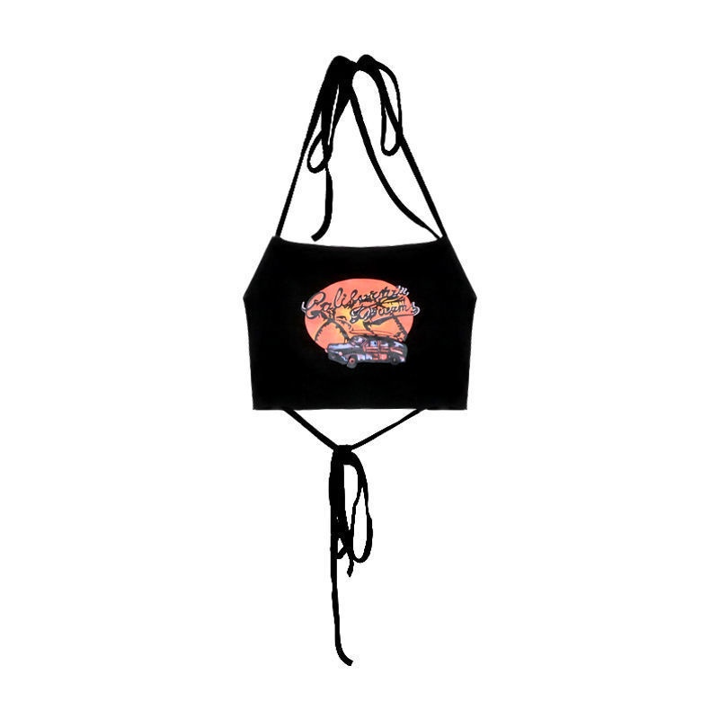 Black Halter Neck Strap Tie พิมพ์เสื้อกั๊กสั้น Bandeau Top