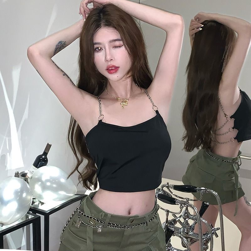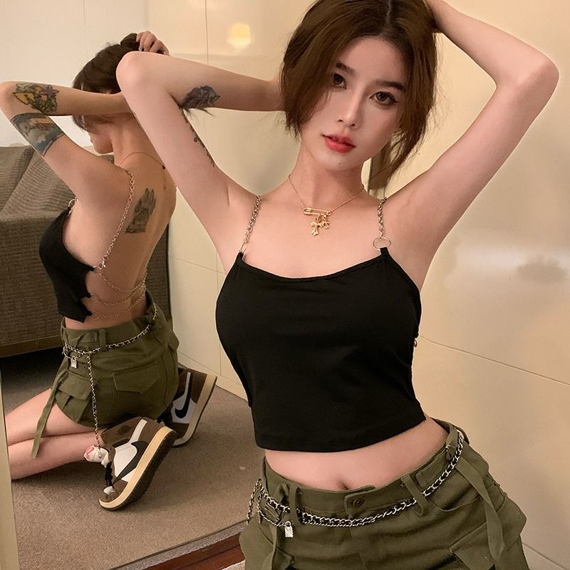 สไตล์สาวฮอต สีดำ สลิงเล็ก มีสายโซ่ แขนกุด เอวสูง เปิดหลัง อินสไตล์ เซ็กซี่มาก