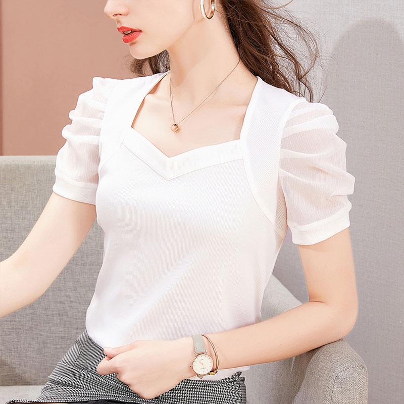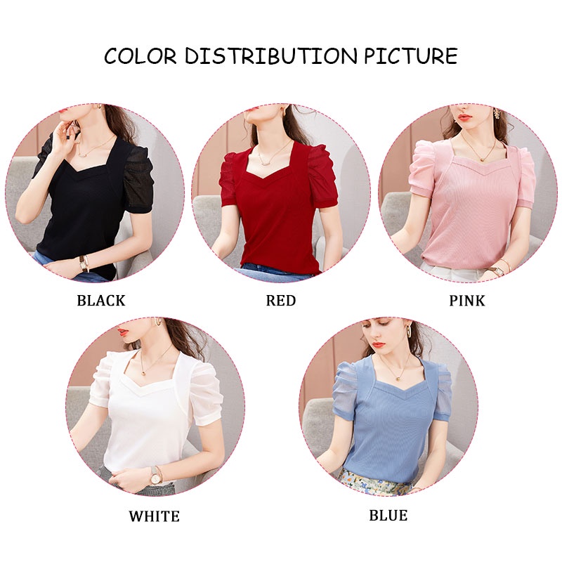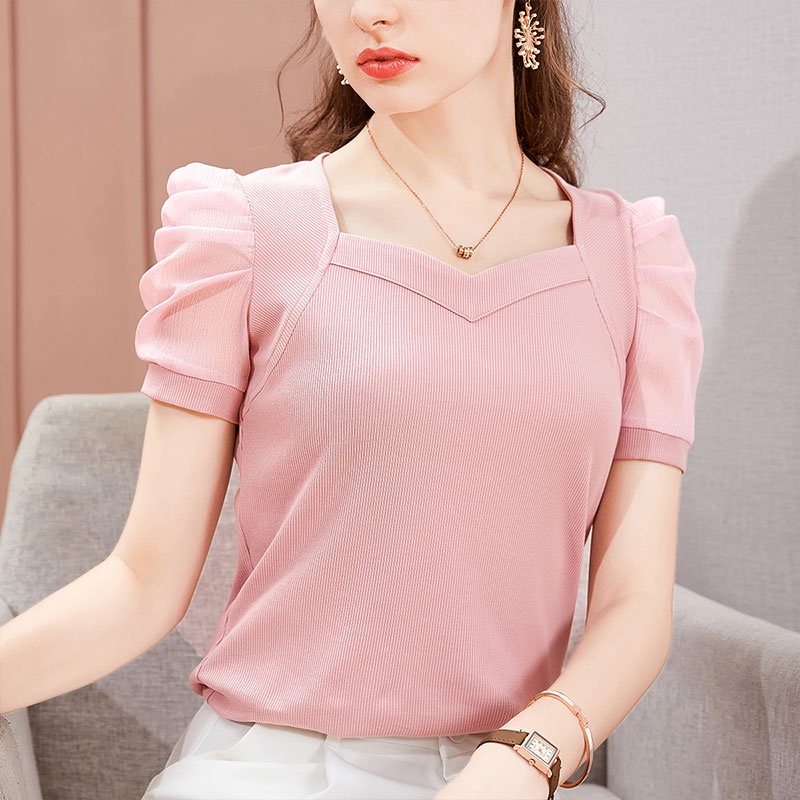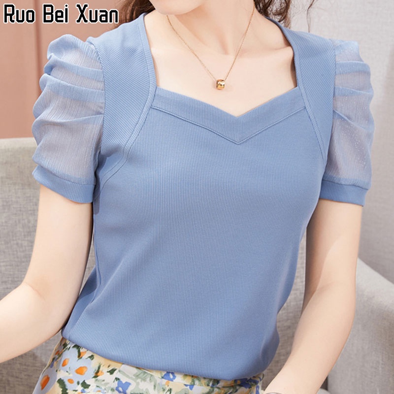 Ruo Bei Xuan เสื้อผู้หญิง ,เสื้อยืดผ้าไหมน้ำแข็งแขนสั้นผ้าพัฟฝรั่งเศสแบบใหม่สำหรับผู้หญิง เสื้อ