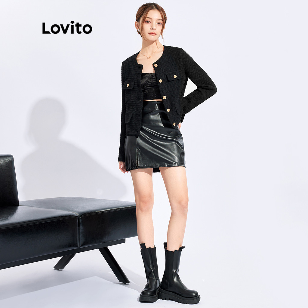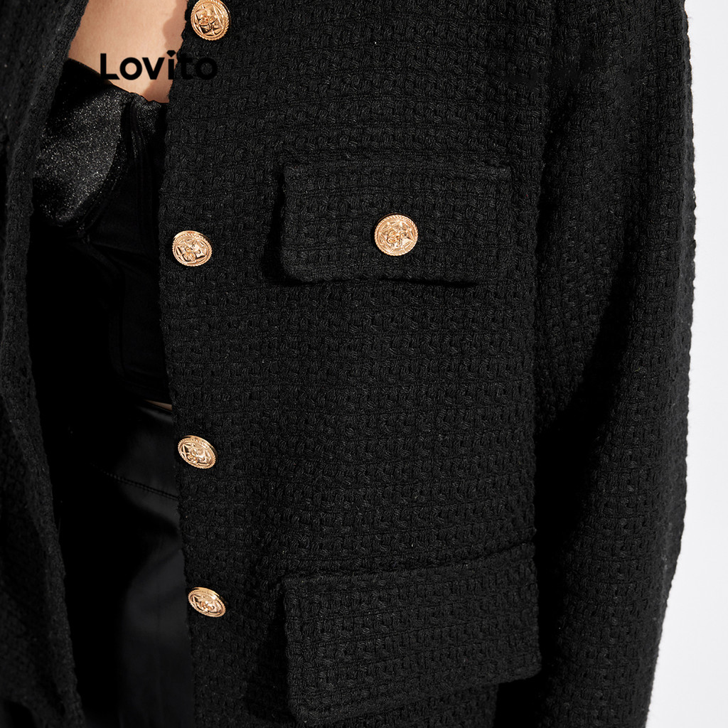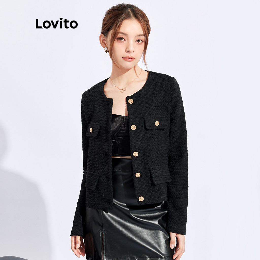 Lovito เสื้อแจ็คเก็ตผู้หญิงคอกลมเรียบติดกระดุมทรงหรูหราฤดูใบไม้ร่วงและฤดูหนาว L32FW095
