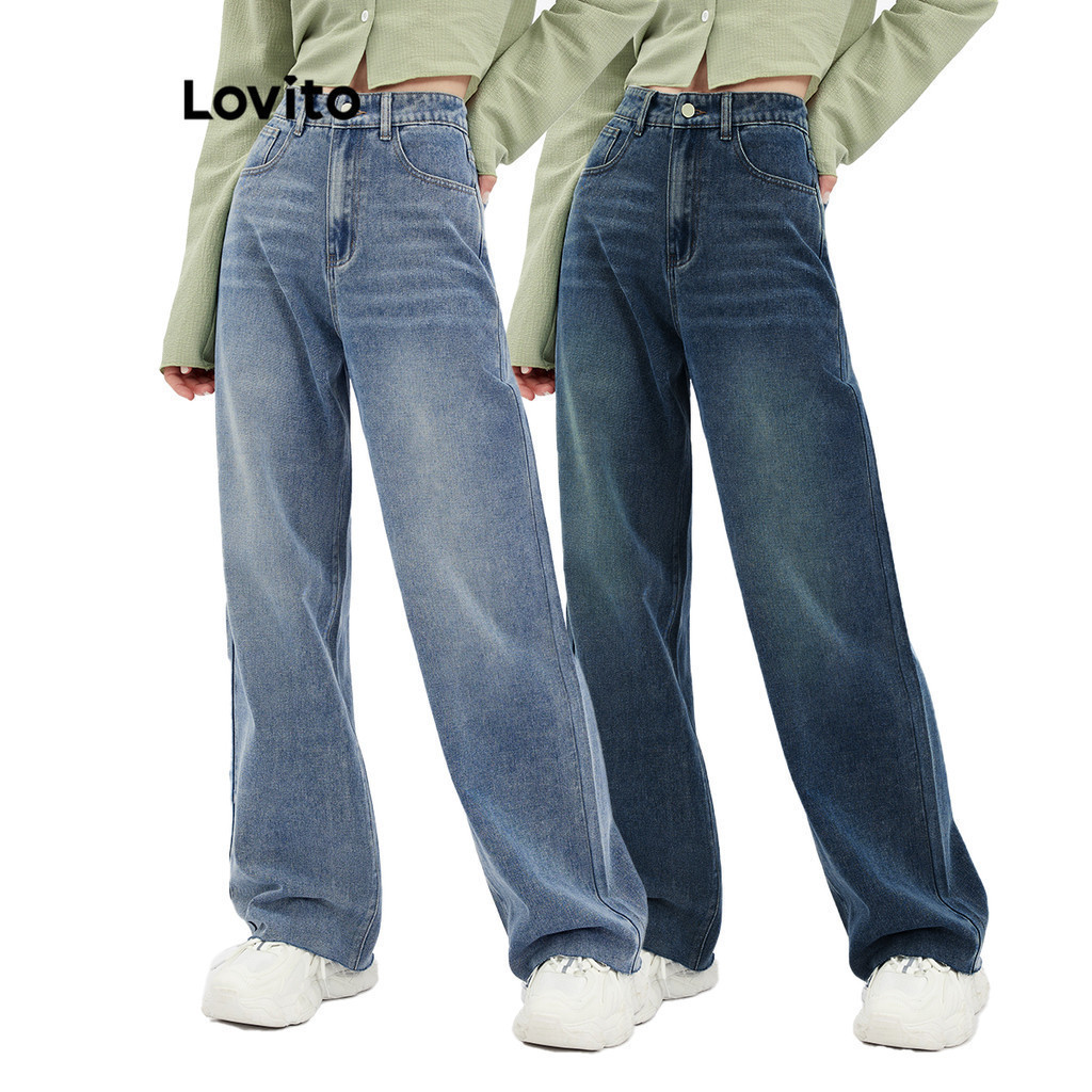 Lovito กางเกงยีนขาบาน เอวสูง ลําลอง สีฟ้า L30AD050