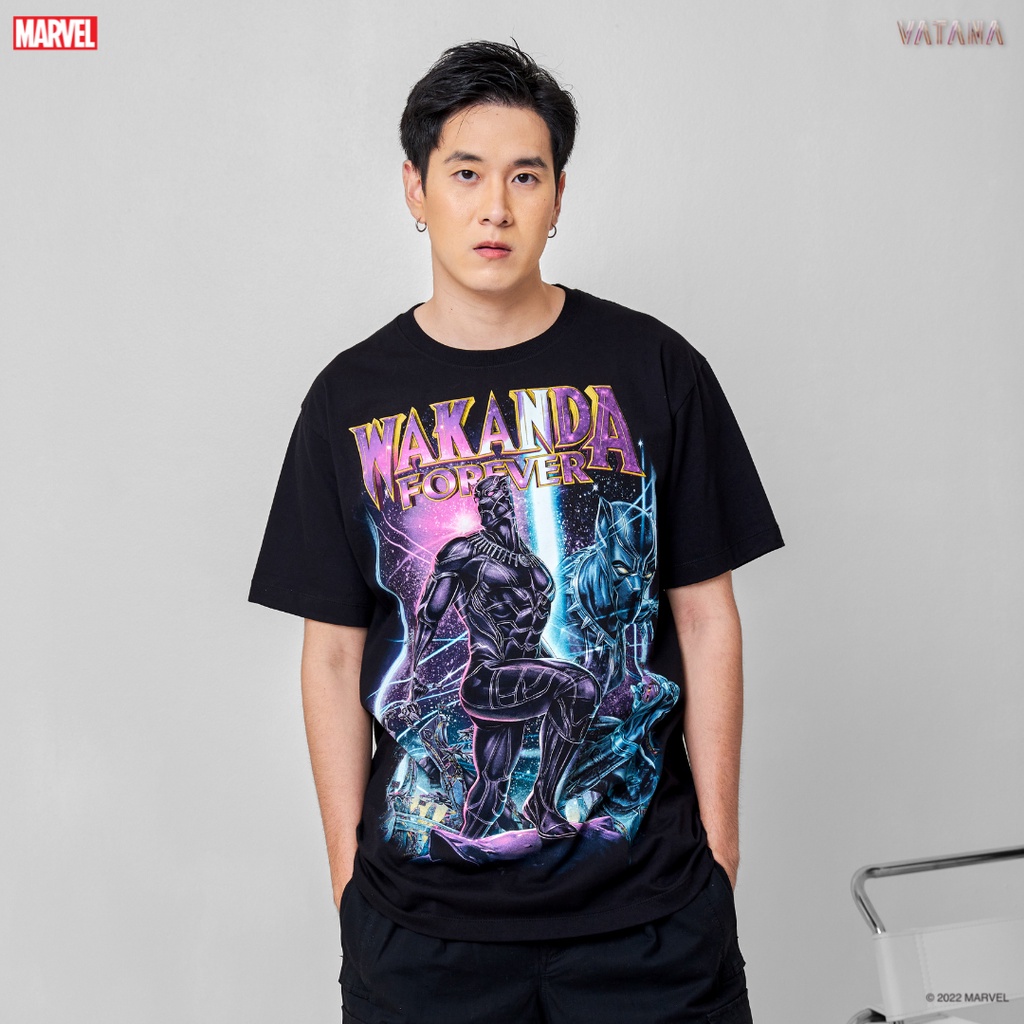 VATANA - เสื้อยืดคอกลม สีดำ พิมพ์ลาย WAKANDA FOREVER | UNISEX T-SHIRT | GLOW IN THE DARK ลิขสิทธิ์ MARVEL