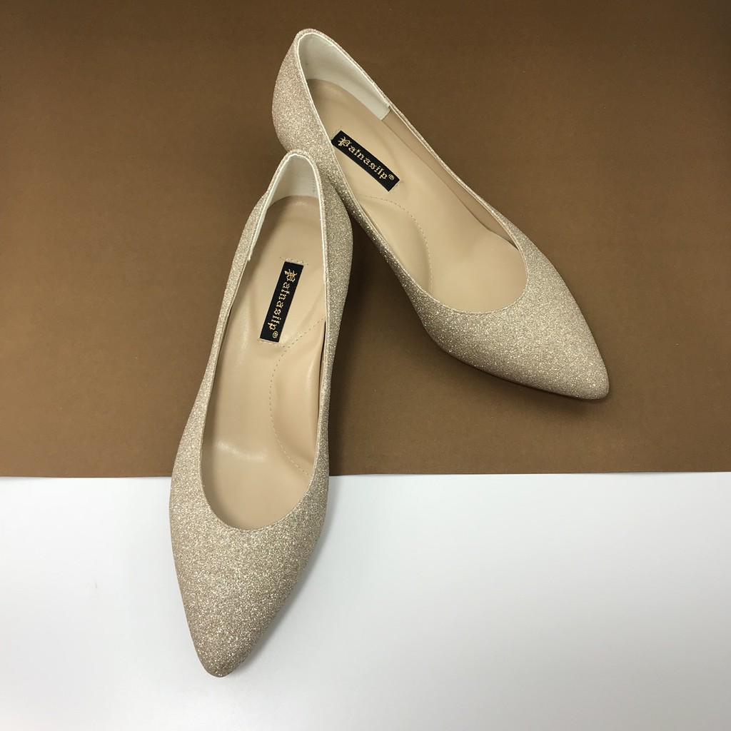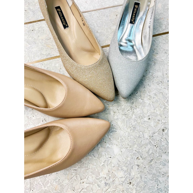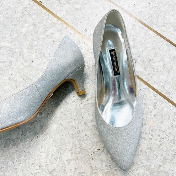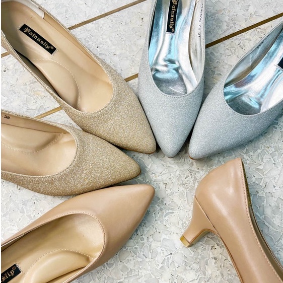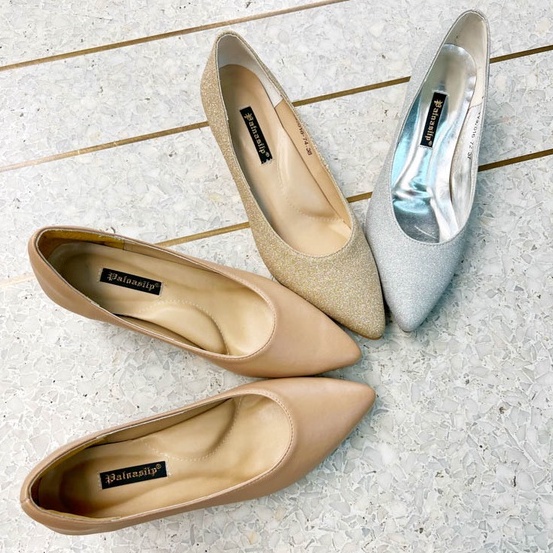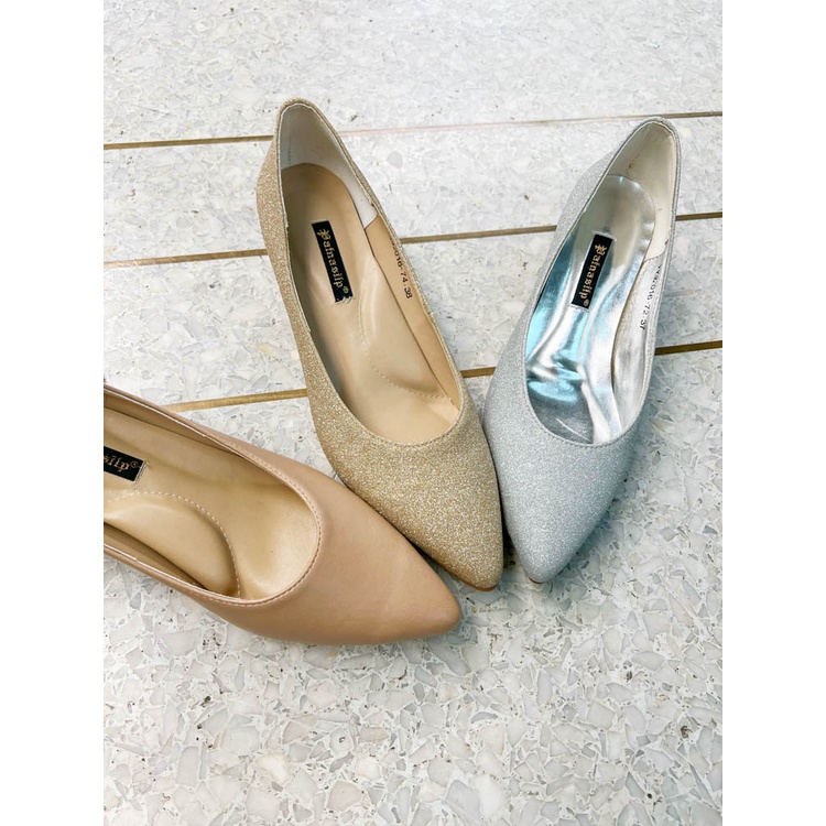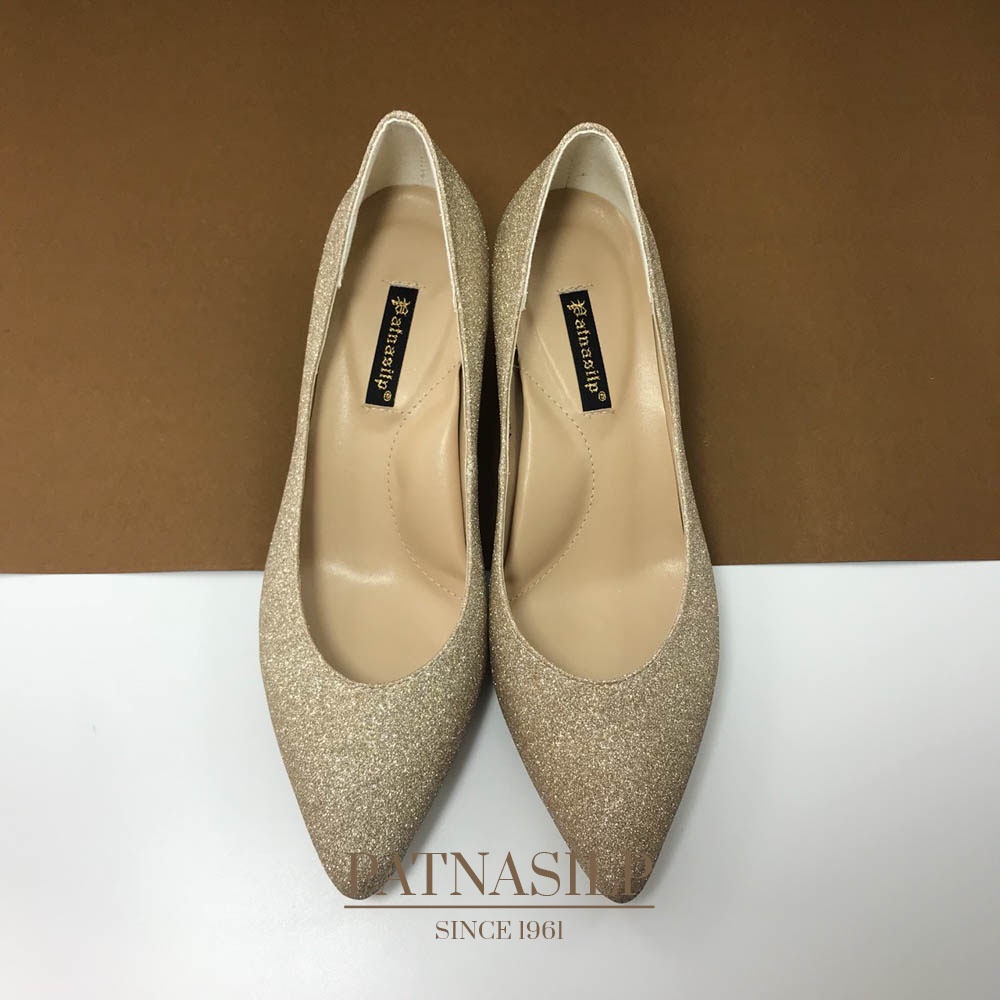 𝐏𝐀𝐓𝐍𝐀𝐒𝐈𝐋𝐏 รองเท้าคัชชู กากเพชรทอง เงิน นู๊ด หัวกว้าง ออกงาน ส้นสูง หัวแหลม l 92016