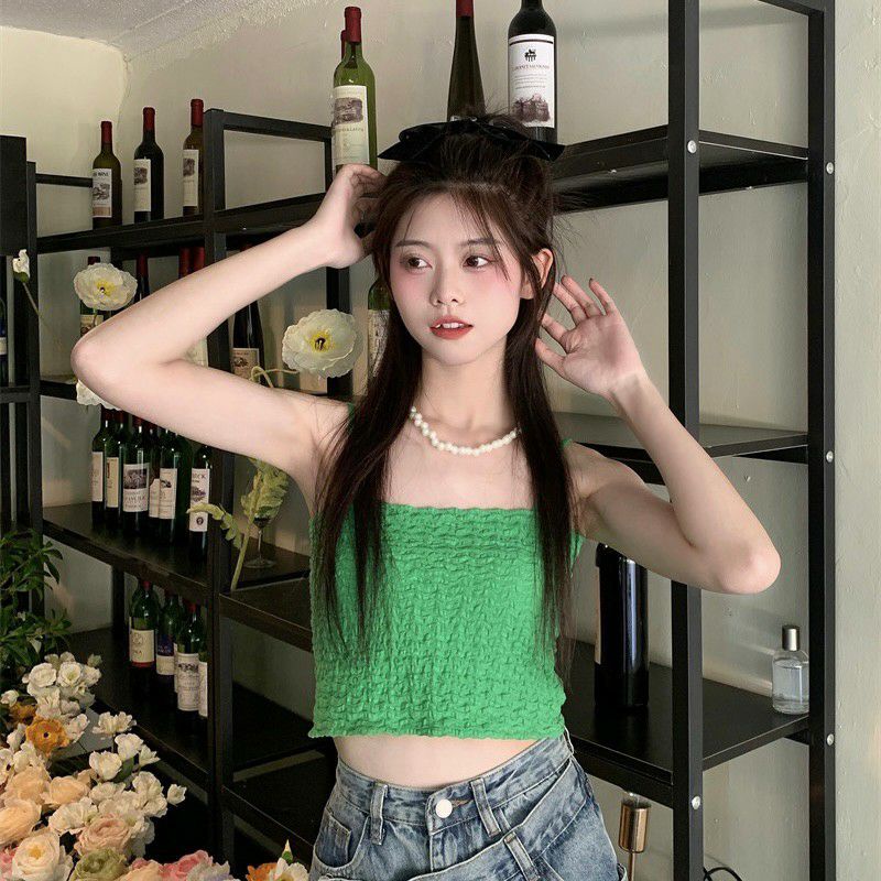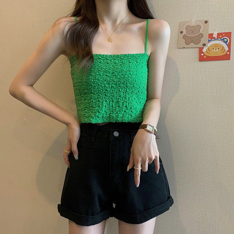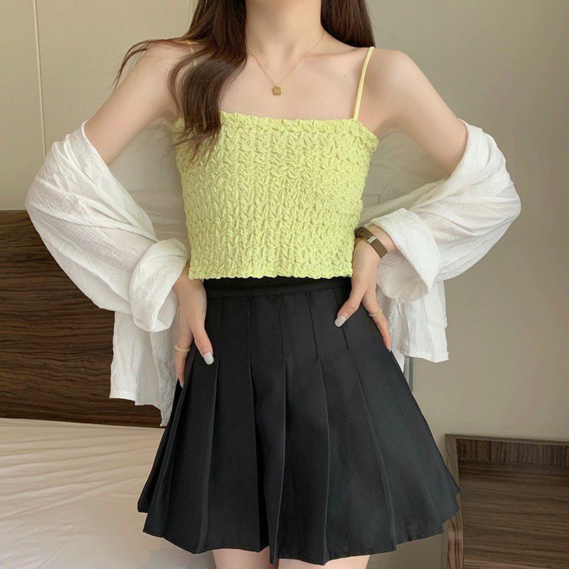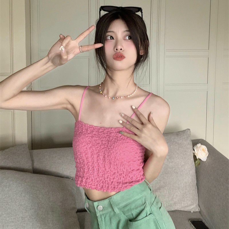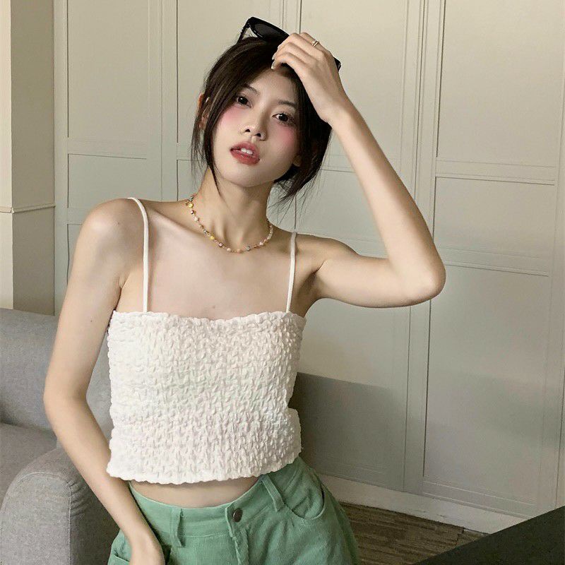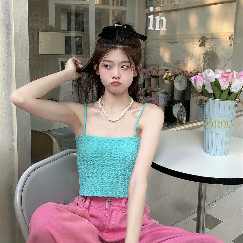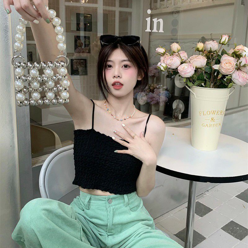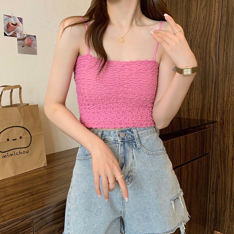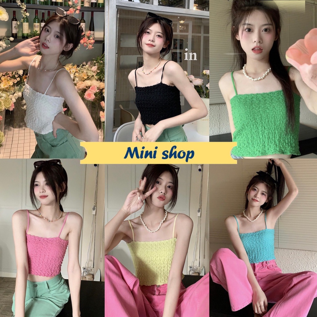 Mini shop🌸พร้อมส่ง🌸 (32081) เสื้อสายเดี่ยวไหมพรม ดีเทลสม๊อคทั้งตัวน่ารักสไตล์เกาหลี