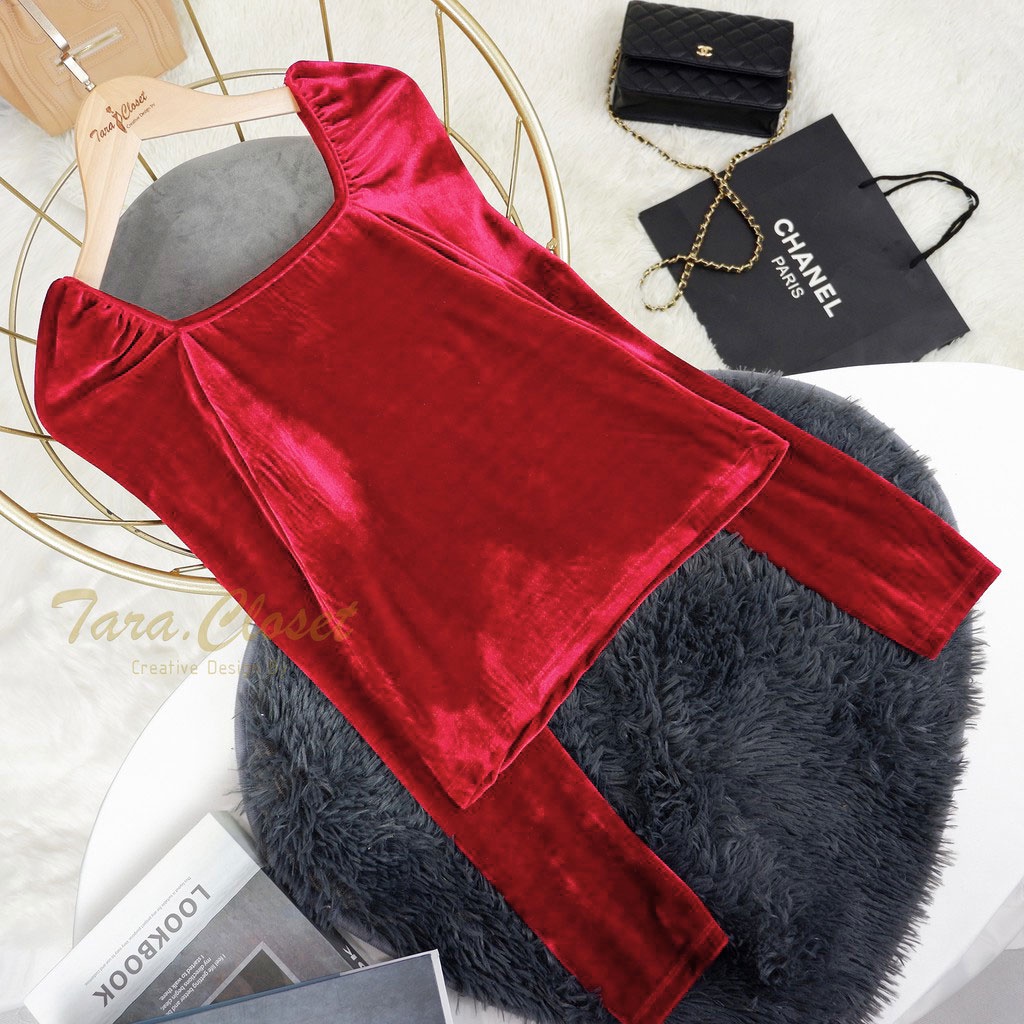 BA002 TARA เสื้อคอเหลี่ยม ปาดไหล่ แขนยาว แขนตุ๊กตาไหล่พองๆ เนื้อผ้ากำมะหยี่ ผ้านิ่ม ใส่เที่ยว ใส่ทำงานได้หมด