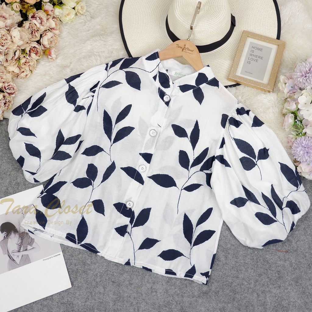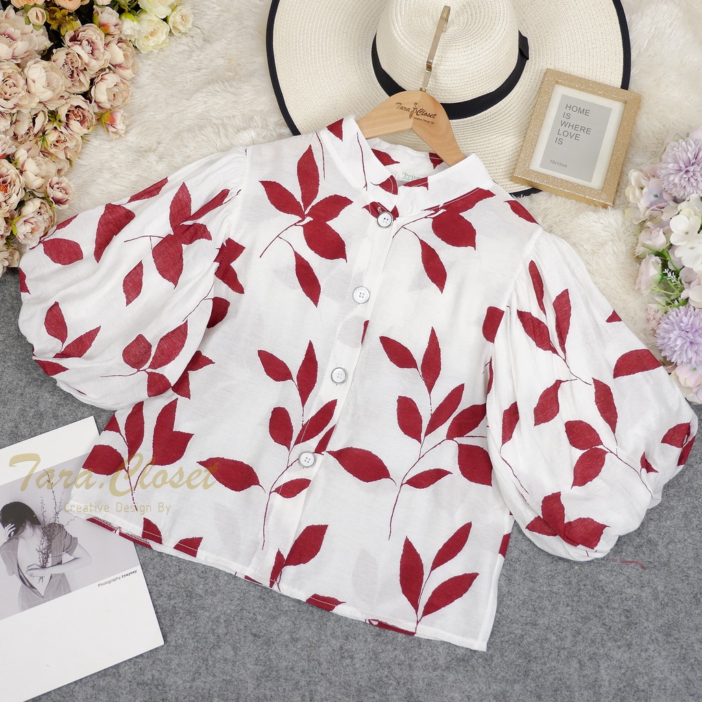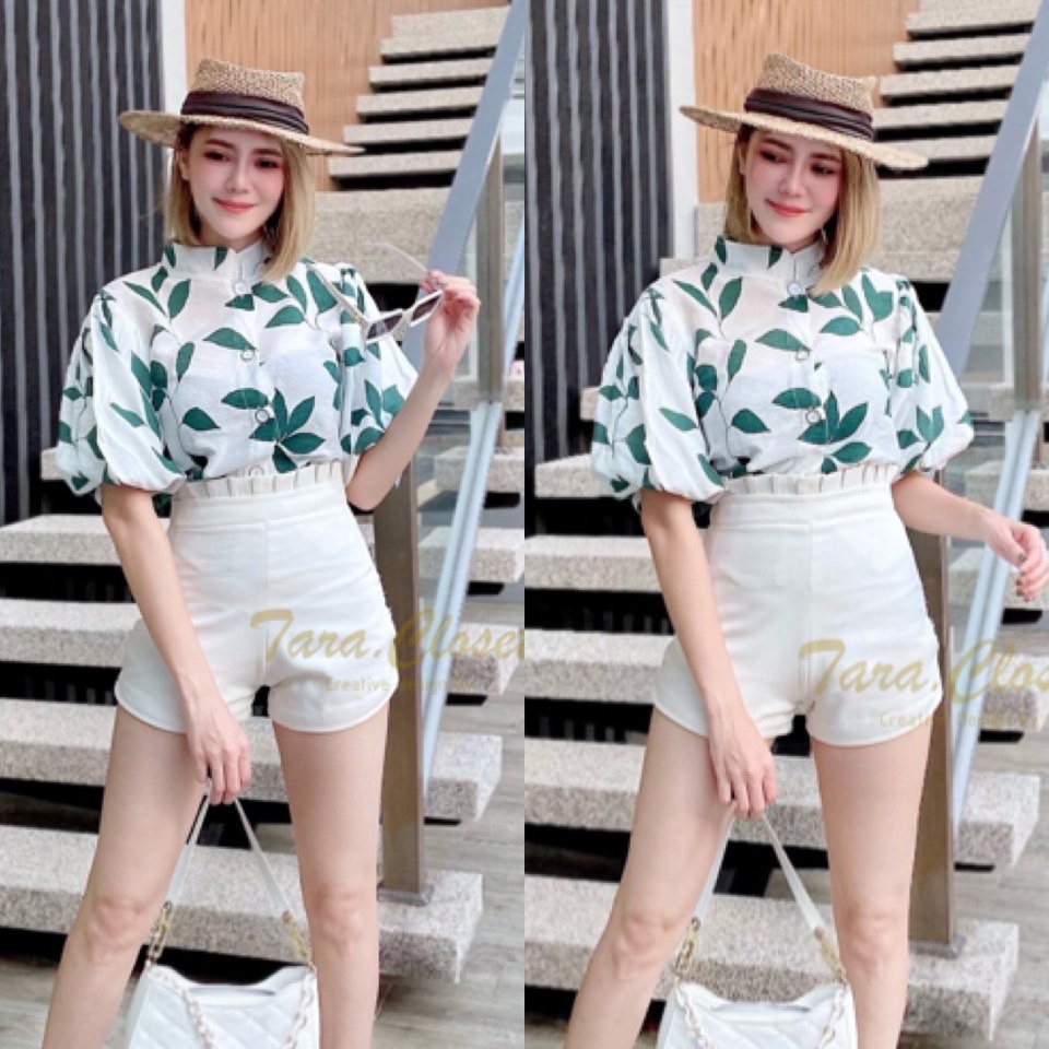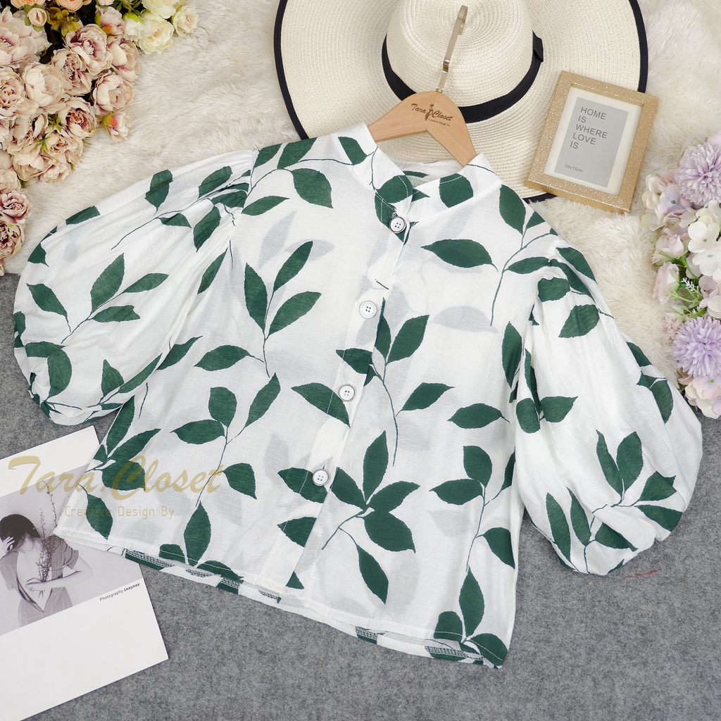 TUM005 TARA Shirt เสื้อกระดุมหน้า คอจีน แขนบอลลูน เนื้อผ้าพิมพ์ลายใบไม้ เนื้อดีมาก งานดี ทรงน่ารัก
