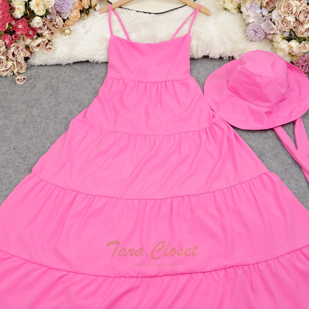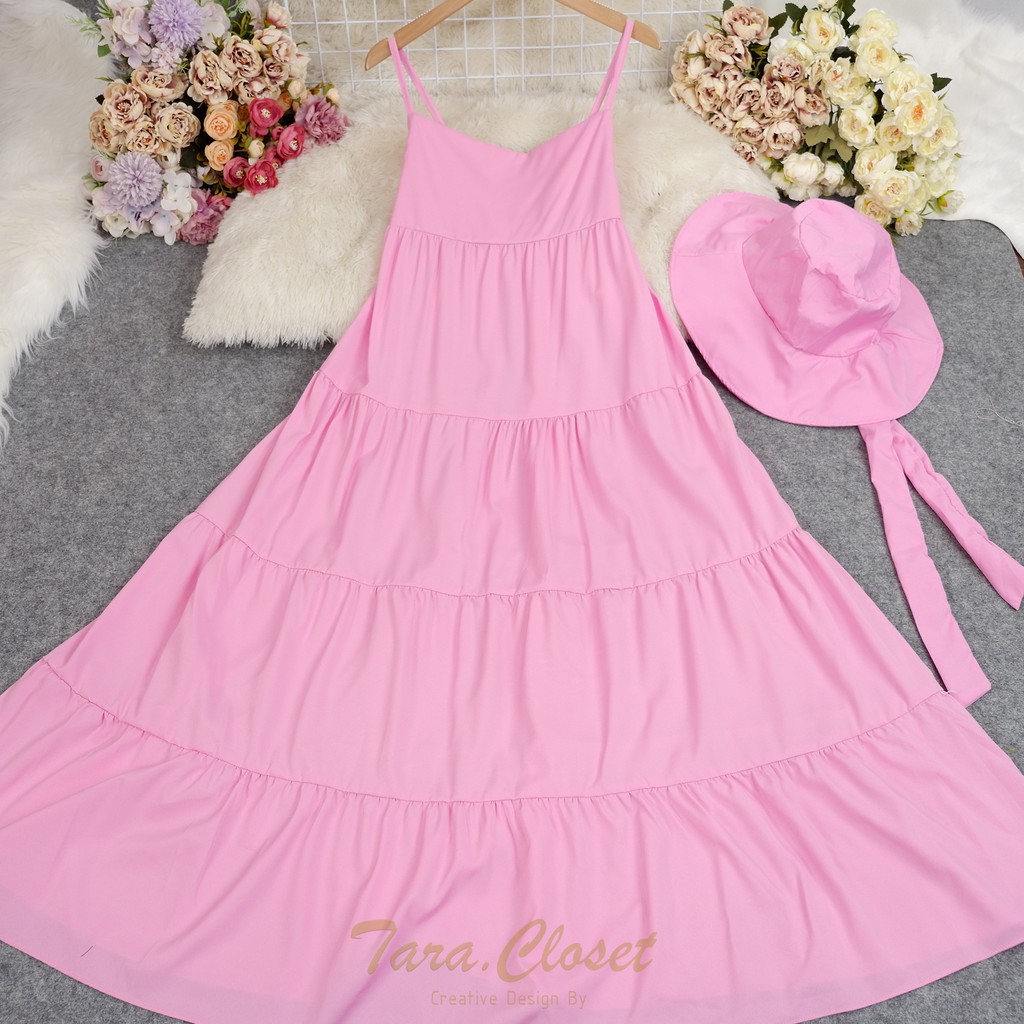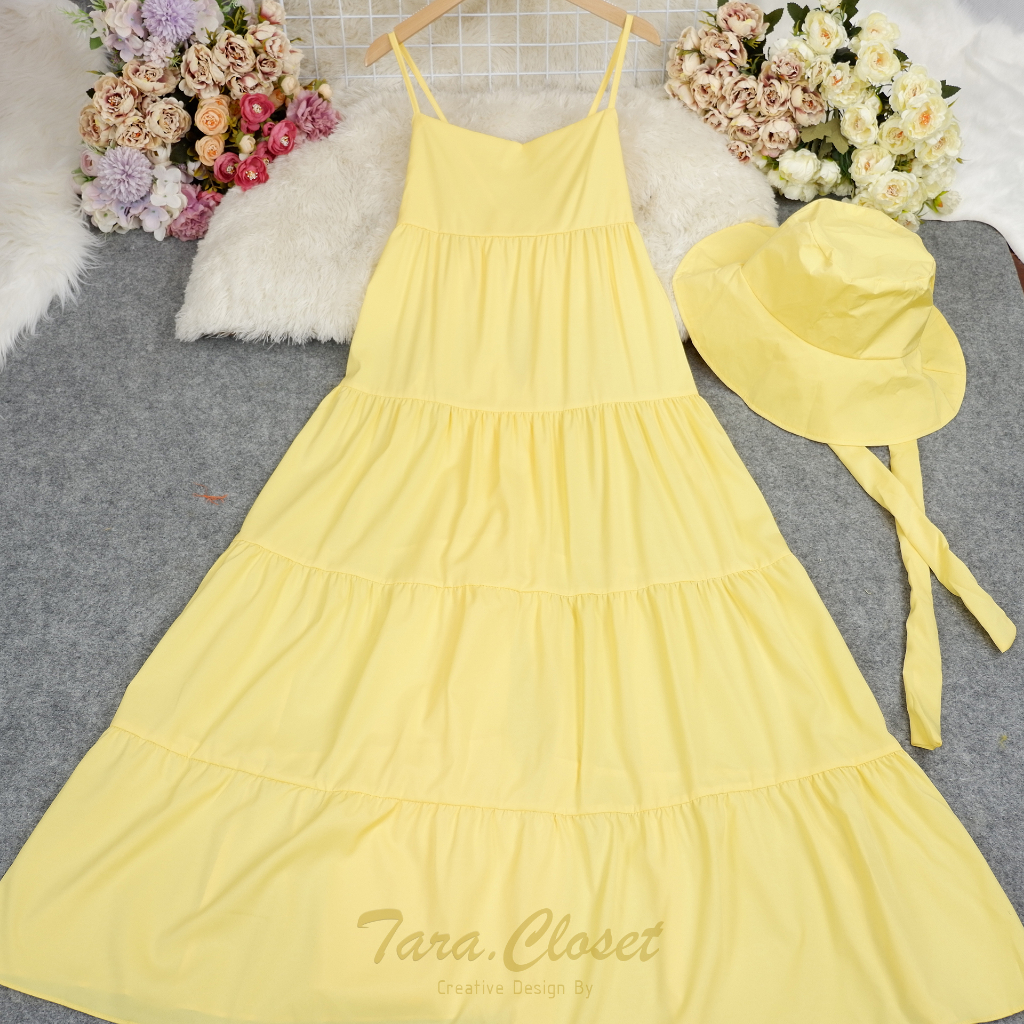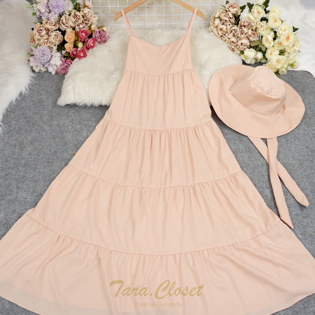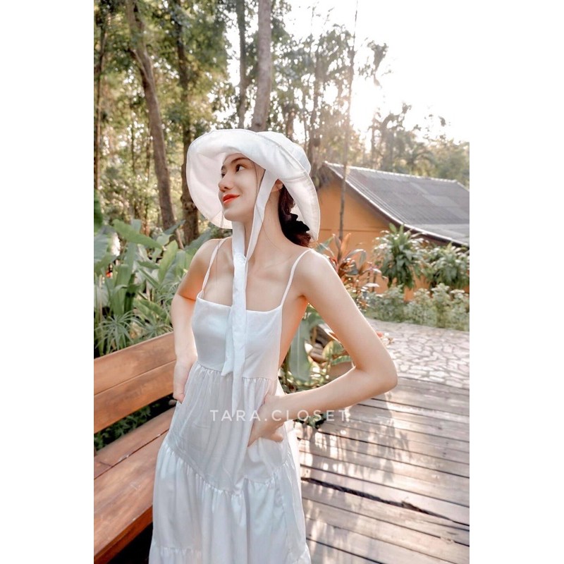 PE051 TARA Set Dress สายเดี่ยวเดรส ชุด+หมวก มียางสม็อกหลัง พร้อมหมวกปีกกว้าง เนื้อผ้าไหมอิตาลี ผ้าสวย พริ้ว เบาแต่ไม่บาง