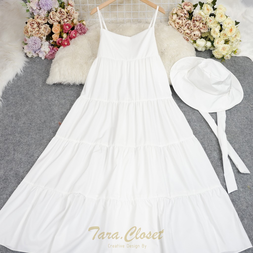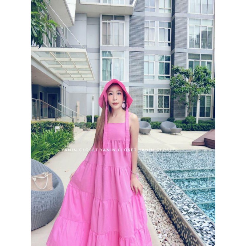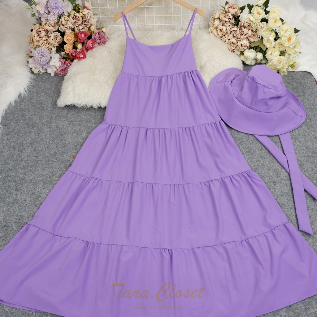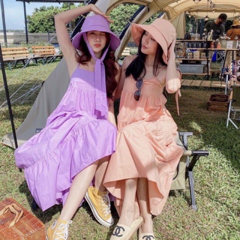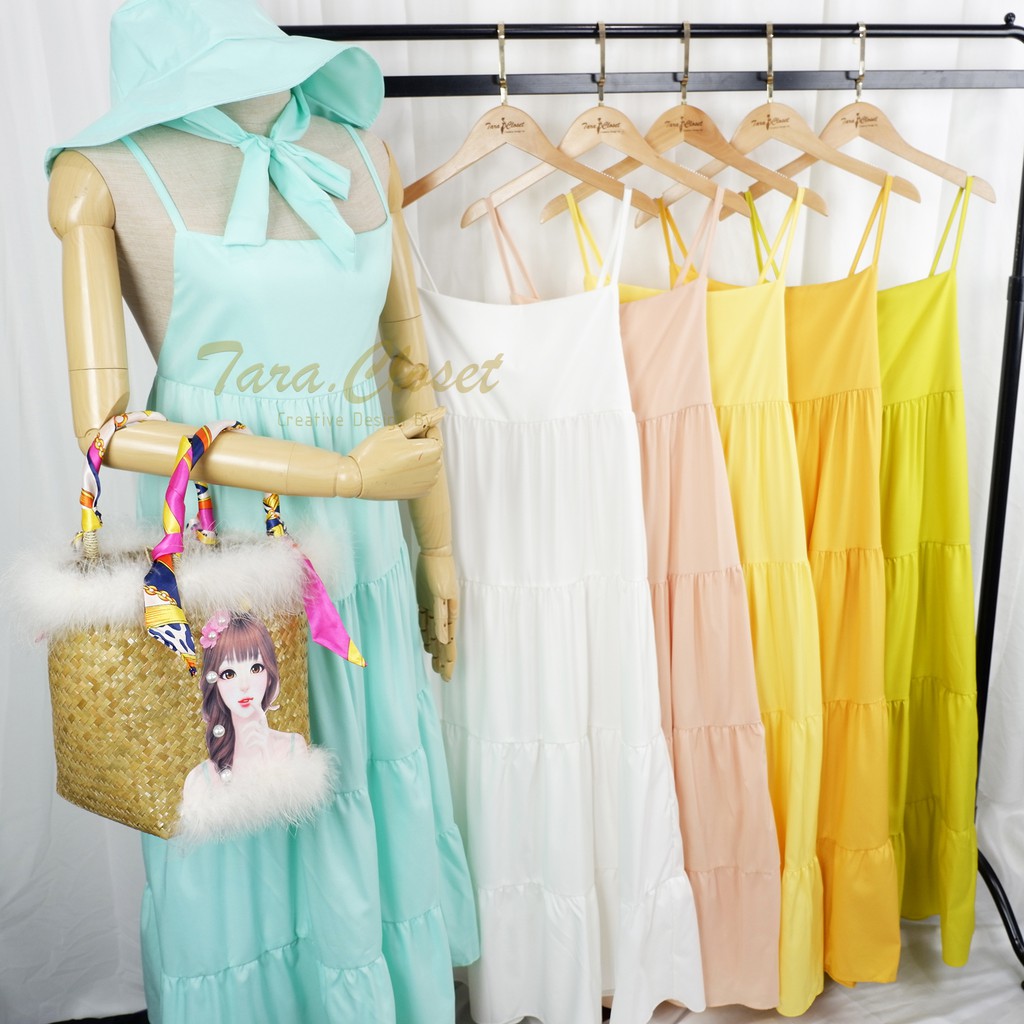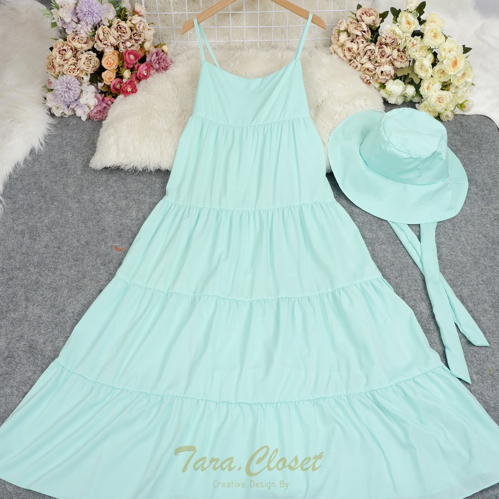 PE051 TARA Set Dress สายเดี่ยวเดรส ชุด+หมวก มียางสม็อกหลัง พร้อมหมวกปีกกว้าง เนื้อผ้าไหมอิตาลี ผ้าสวย พริ้ว เบาแต่ไม่บาง