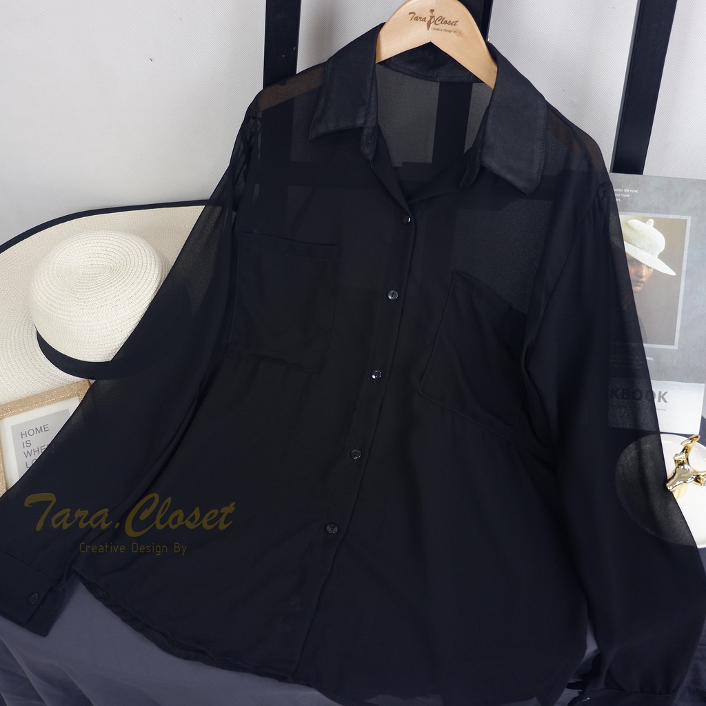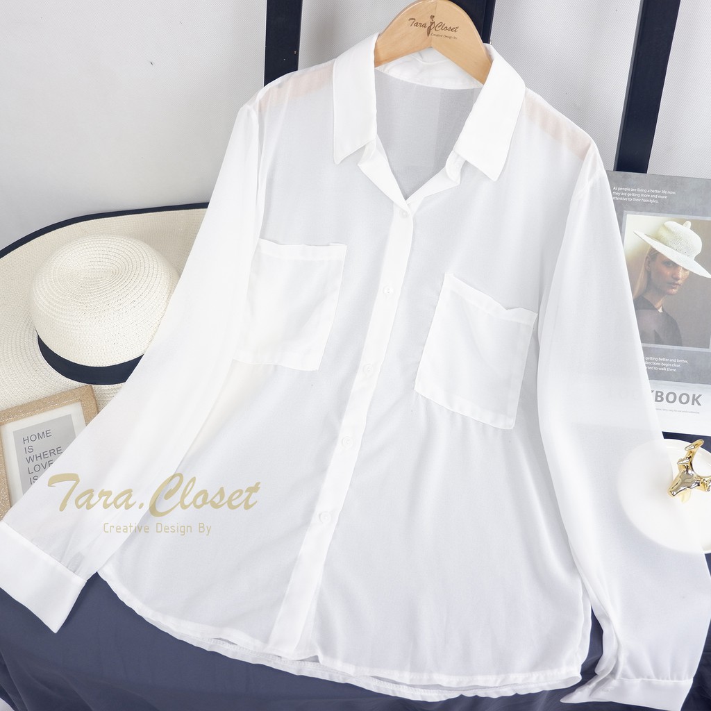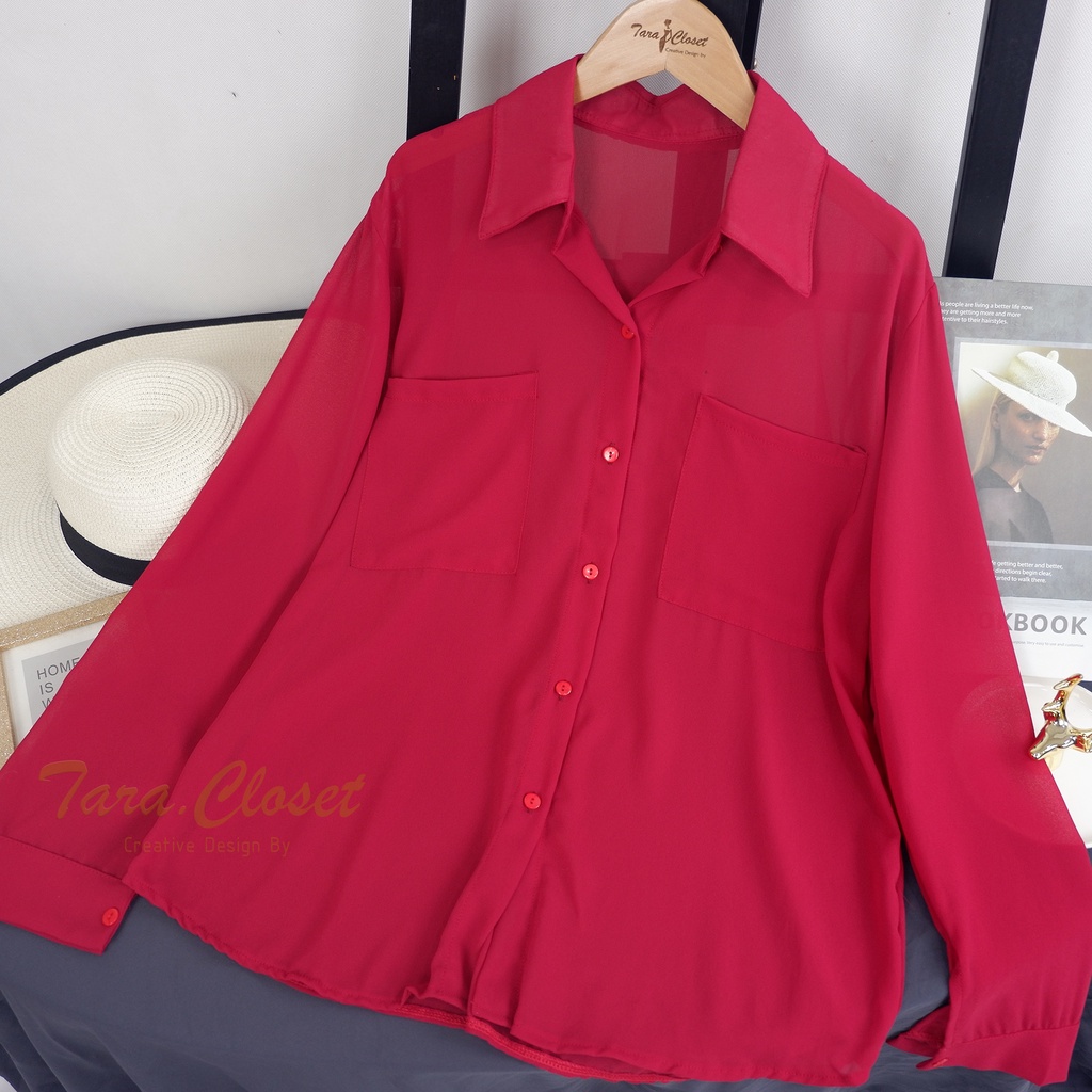 CF018 TARA Shirt Chiffon เสื้อเชิ้ต เสื้อคลุมแขนยาว กระเป๋าคู่ ทรงโอเวอร์ไซร์ แขนยาว เนื้อผ้าชีฟองเนื้อทรายอย่างดี