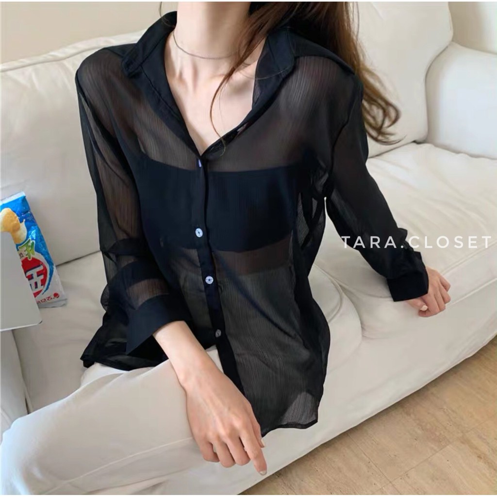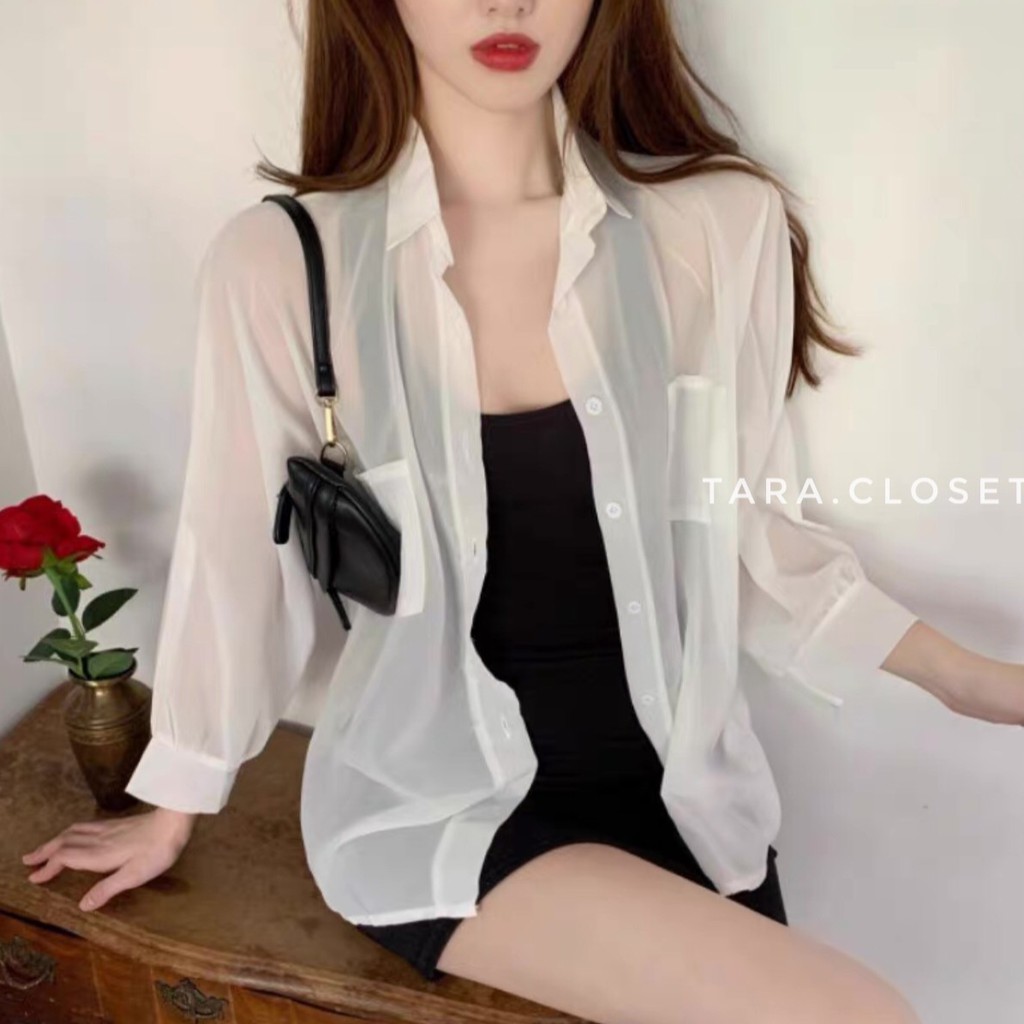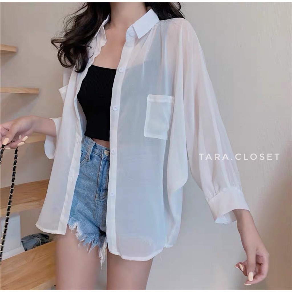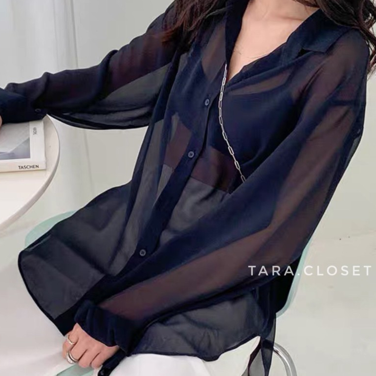 CF018 TARA Shirt Chiffon เสื้อเชิ้ต เสื้อคลุมแขนยาว กระเป๋าคู่ ทรงโอเวอร์ไซร์ แขนยาว เนื้อผ้าชีฟองเนื้อทรายอย่างดี