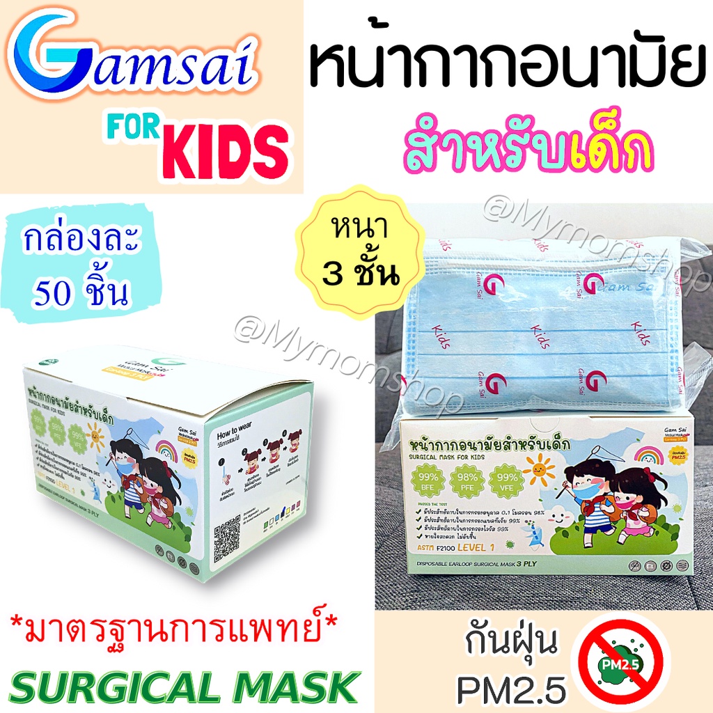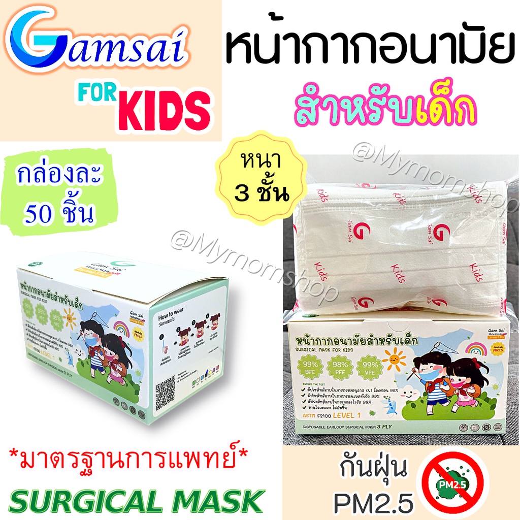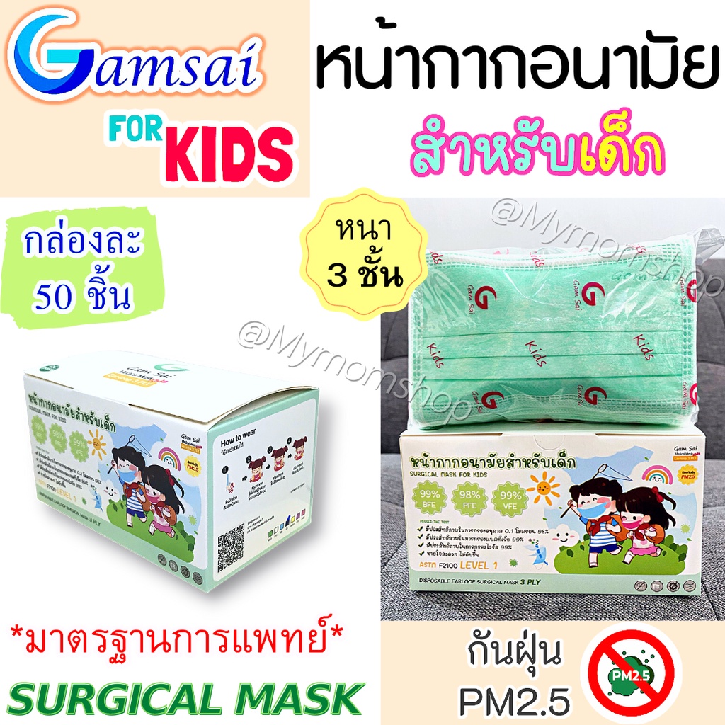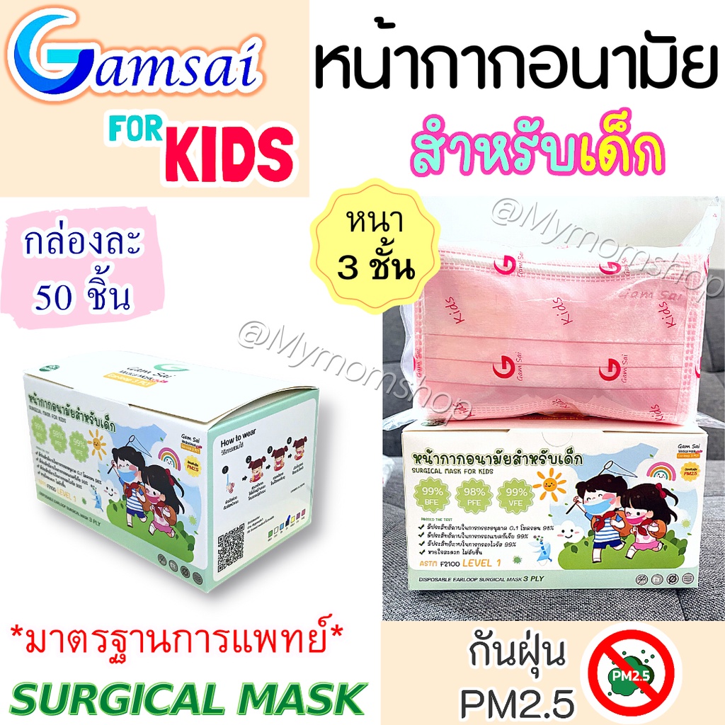 (ส่งด่วน) 🎉หน้ากากอนามัยเด็ก🧒🏻GAMSAI MASK (50 ชิ้น) แมสงานไทย มาตรฐานสูง ทางการแพทย์🩺หนา 3ชั้น ปั๊มโลโก้แก้มใส