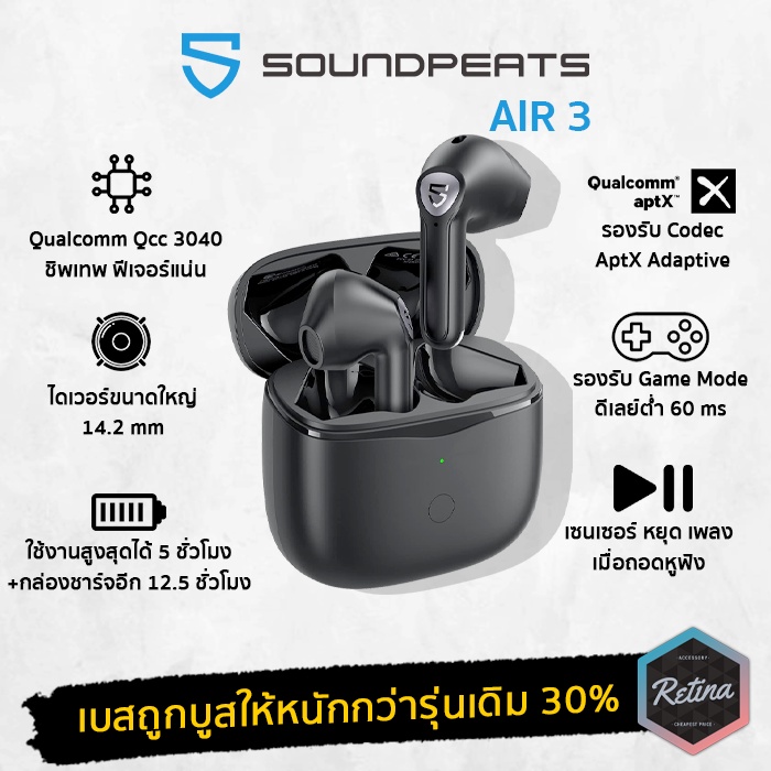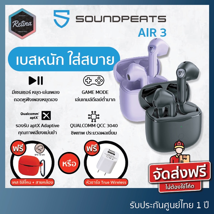 [ ประกันศูนย์ไทย 1 ปี ] !! แถมฟรีเคสซิลิโคนหรือหัวชาร์จ !! SoundPeats AIR 3 เบสดี ไมค์ชัด ใส่สบาย