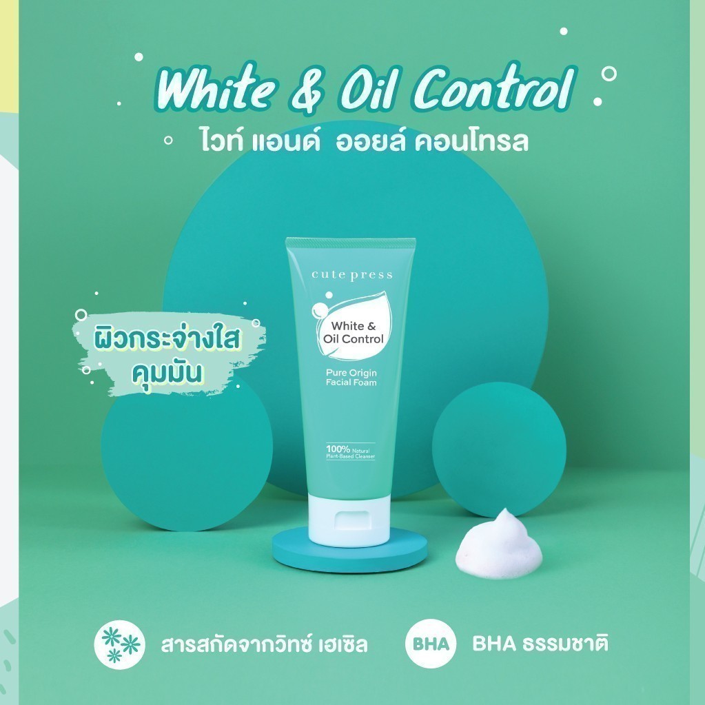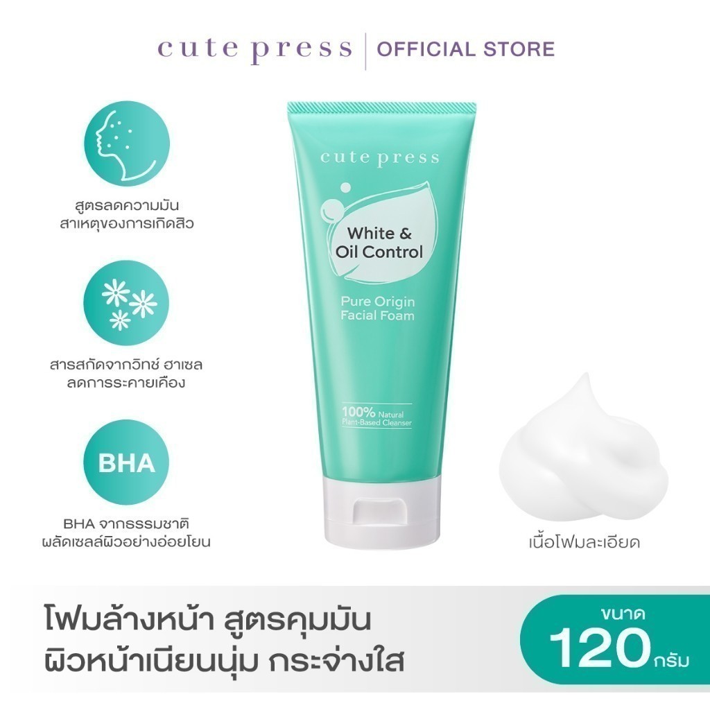 CUTE PRESS PURE ORIGIN WHITE & OIL CONTROL FACIAL FOAM 120g โฟมล้างหน้า สูตรคุมมัน ผิวหน้าเนียนนุ่ม กระจ่างใส