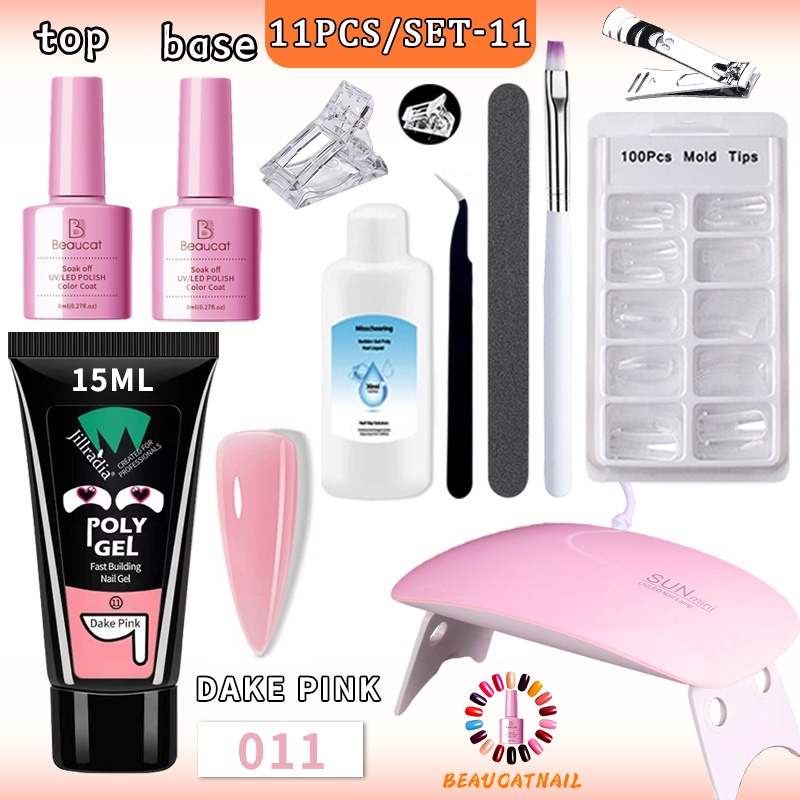 โพลี่เจลชุดทําเล็บ 11ชิ้น 12 สีเจล โพลี่เจล ต่อเล็บ+ไฟอบเล็บเจล 6W+อุปกรณ์ทำเล็บ+base+Top Coat เจล