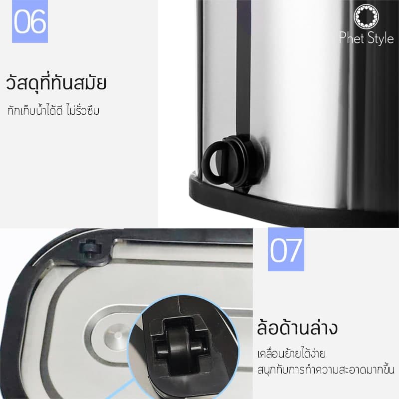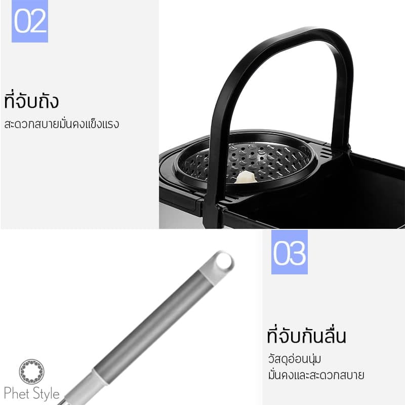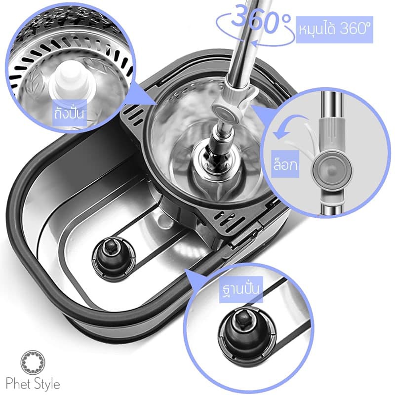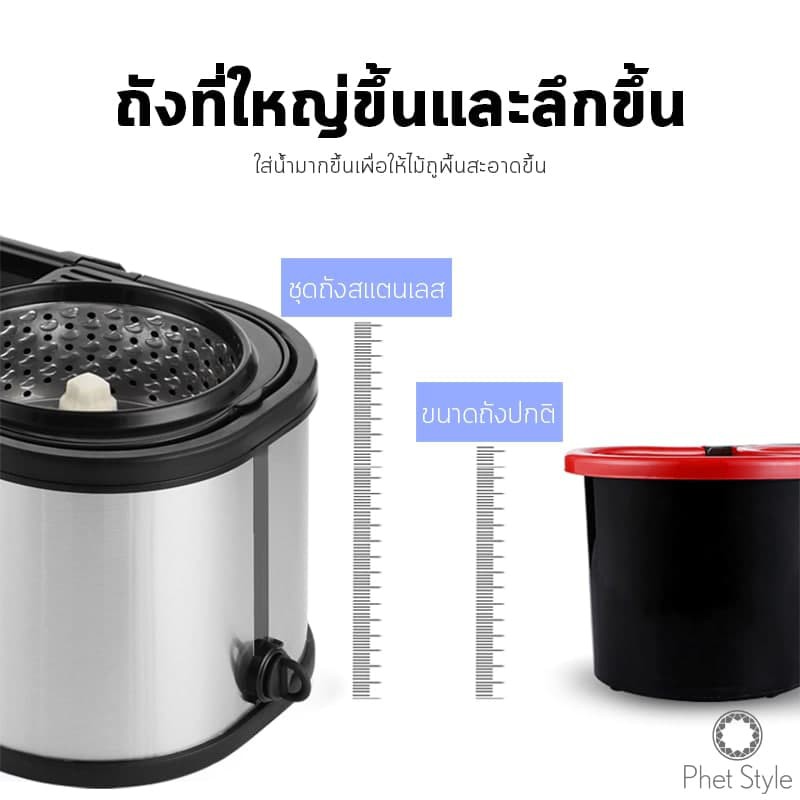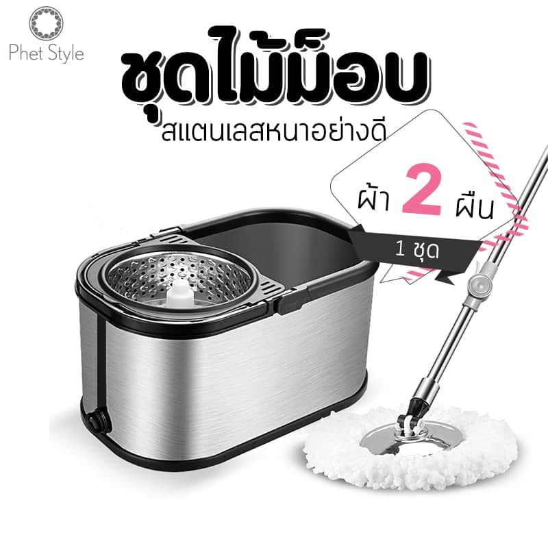 PhetStyle ไม้ถูพื้น ไม้ม็อบถูพื้น ถังปั่นสแตนเลสมีล้อ ผ้าถูพื้นไมโครไฟเบอร์ มีรูระบายน้ำ แถมฟรีผ้าถูพื้น 2 ผืน 4012