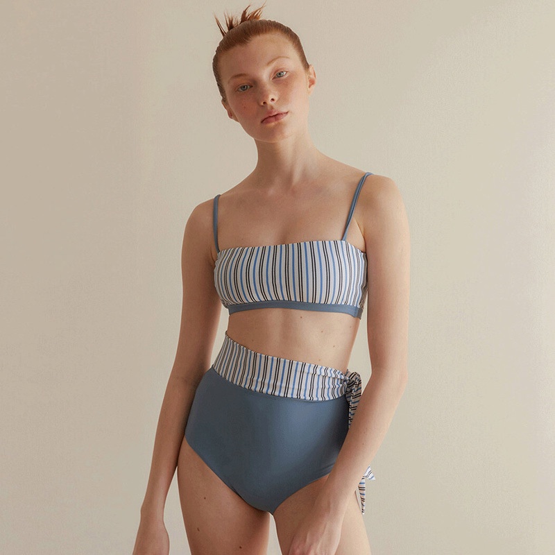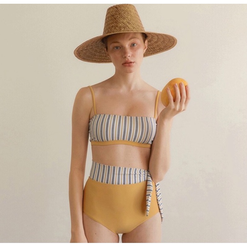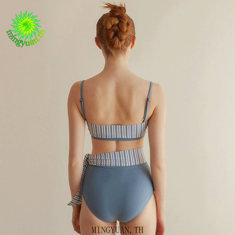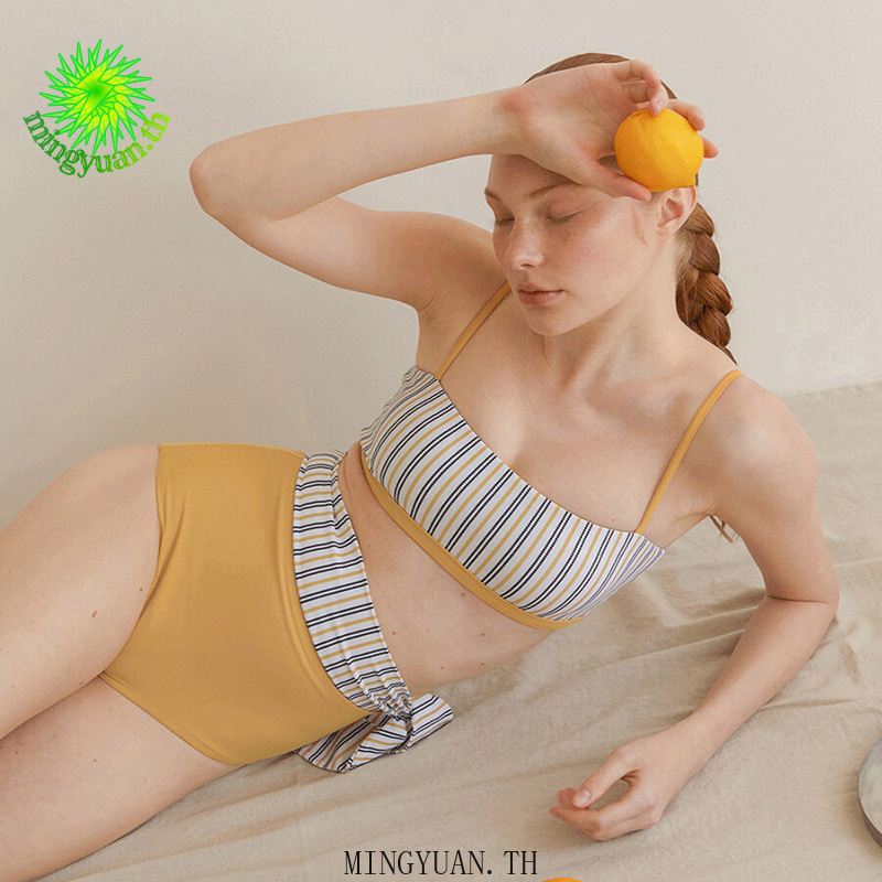 ( Mingyuan )New sweet split high waist swimsuit contrast color striped hot spring swimsuit